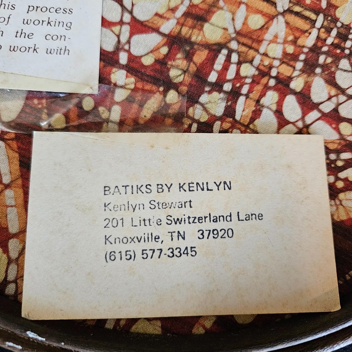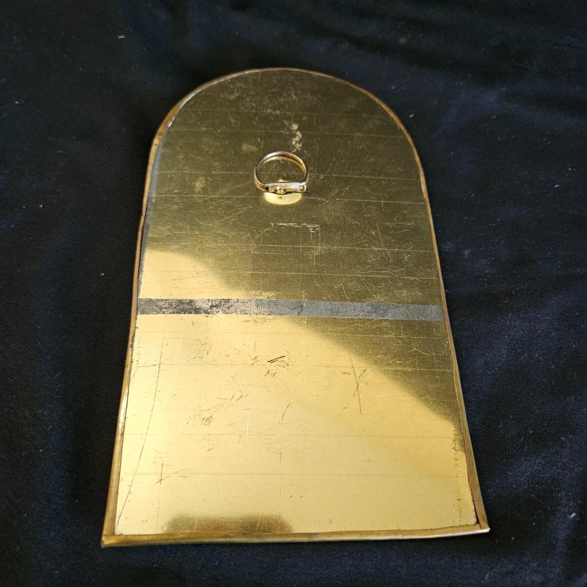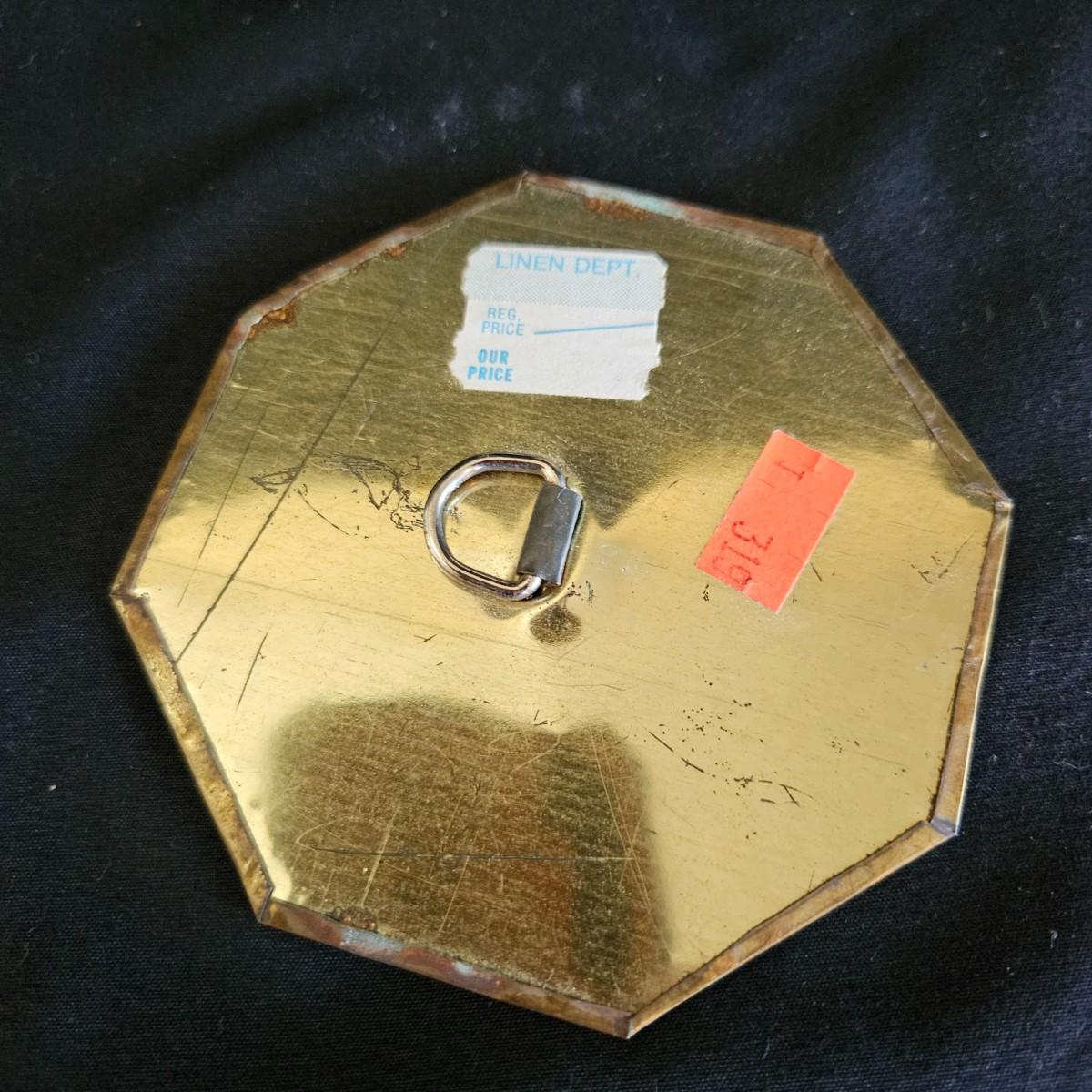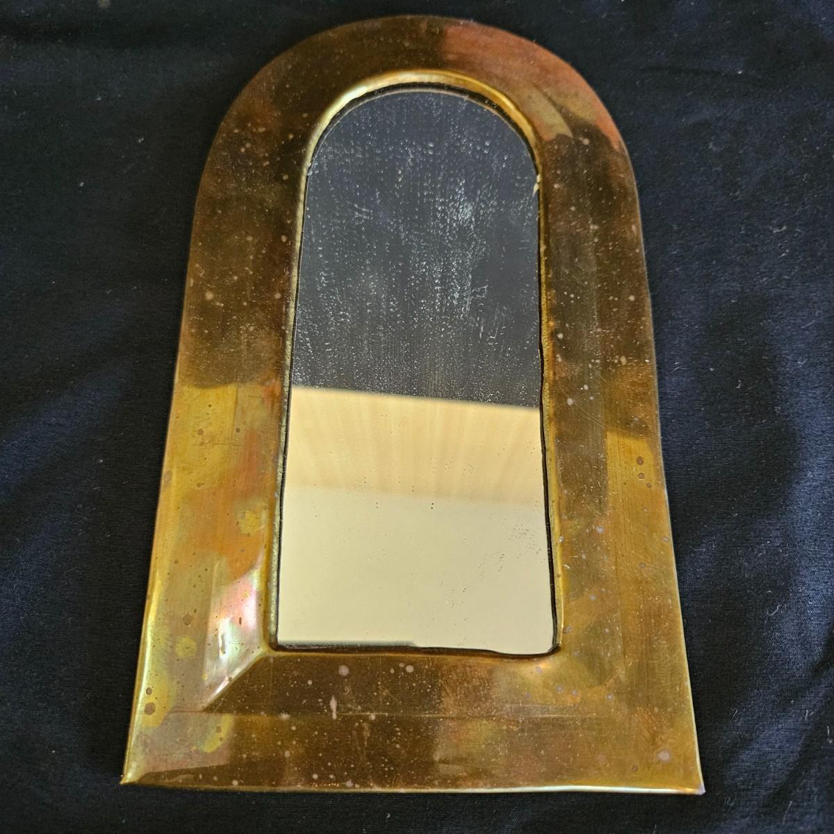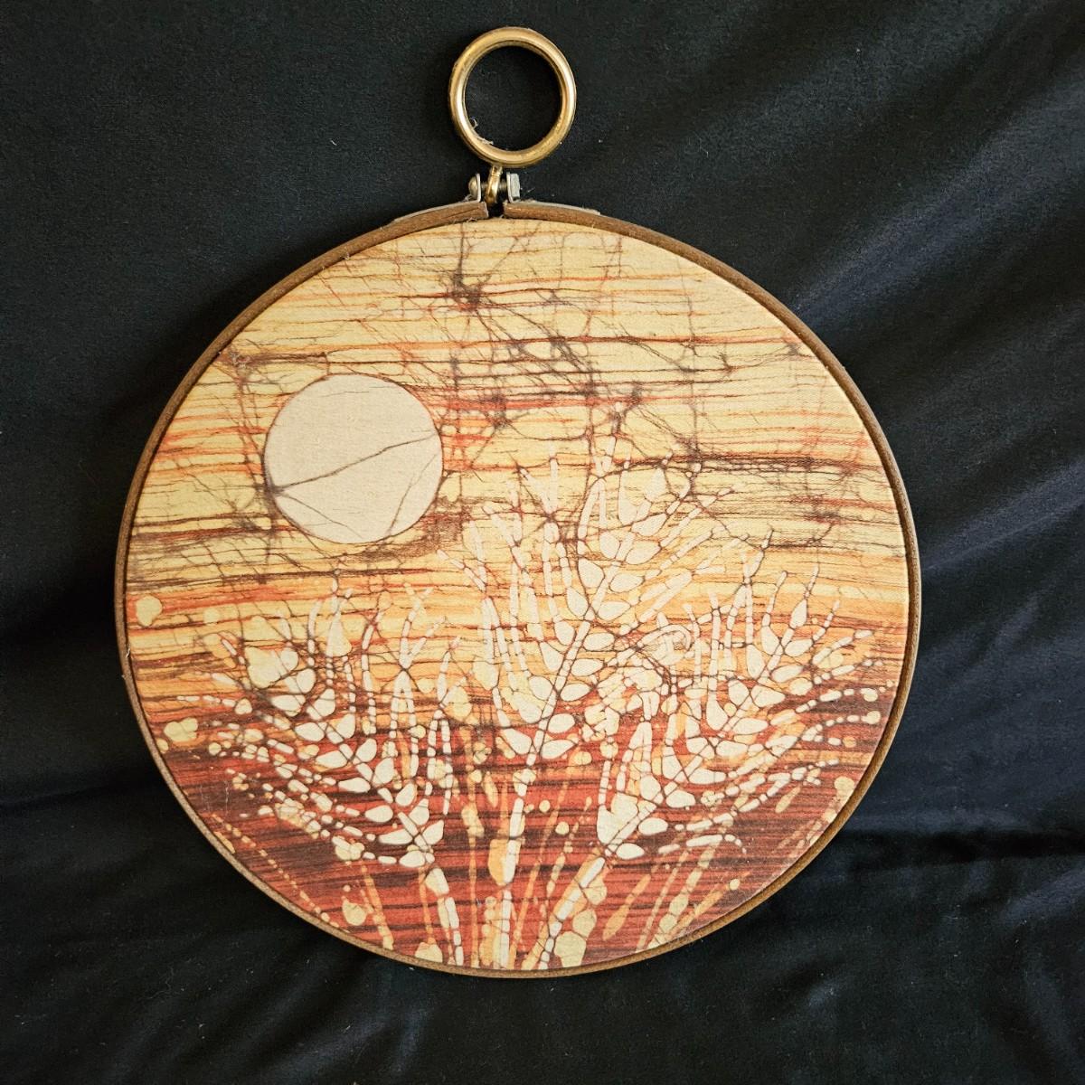 A unique batik with warm sunset tones that depicts plants and the sun. It is in a stretching hoop with a brass loop for hanging. It measures approximately 10.5"D. Also includes two small mirrors in brass frames. Shipping available