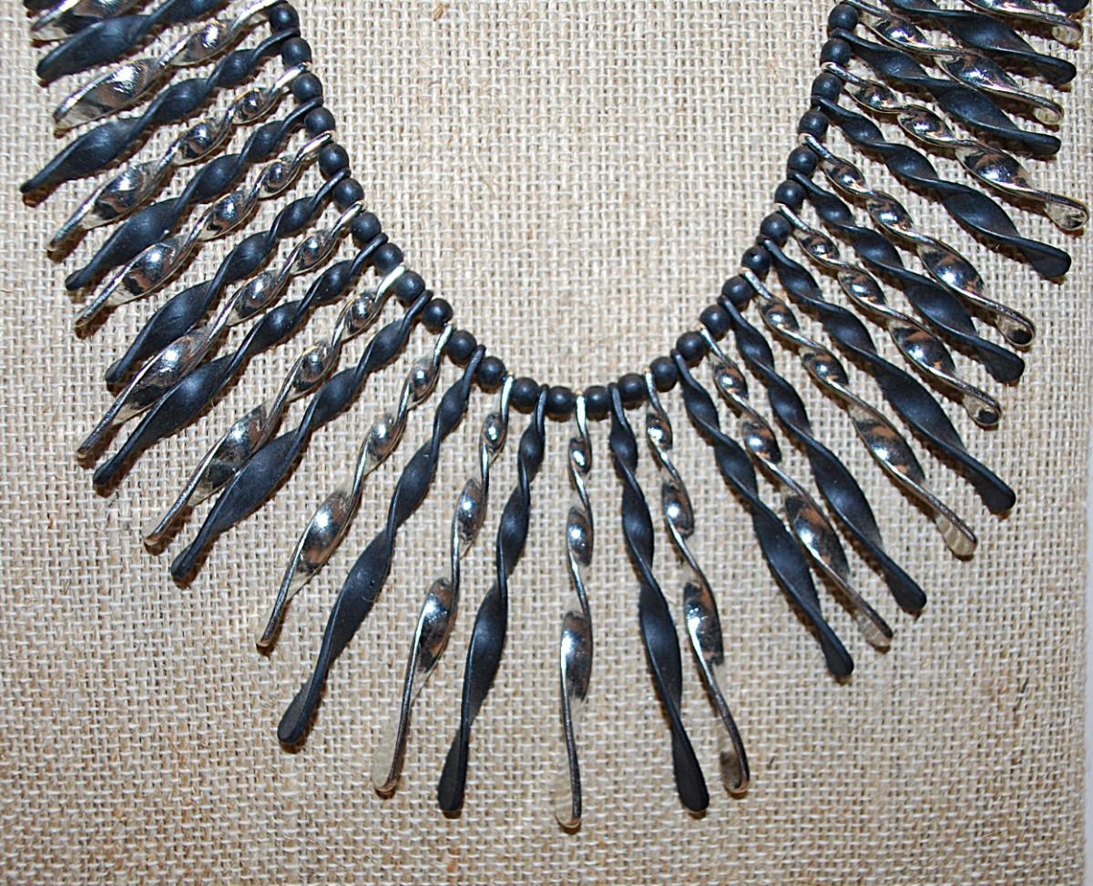 Unique Black and Silver Colored "Knurled & Curled Bits" NECKLACE with Black Bead Accents, Black Chain & Lobster Clasp 24" L