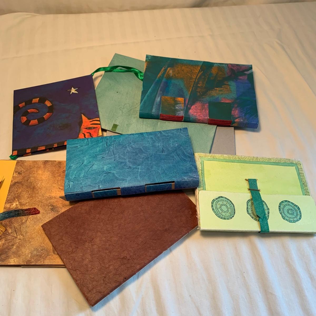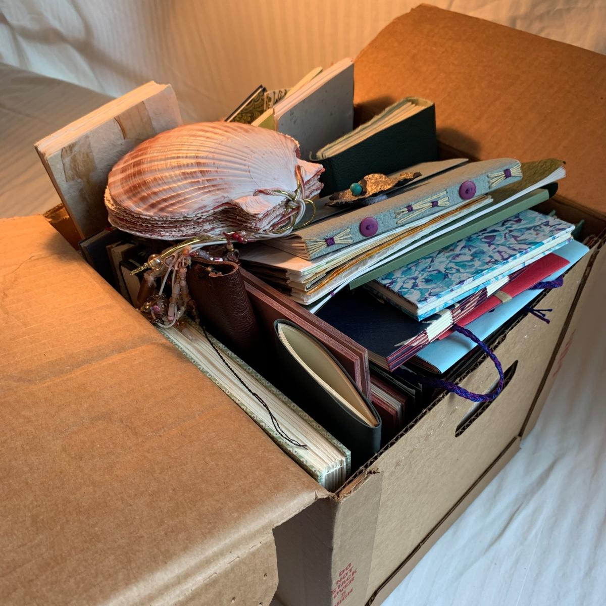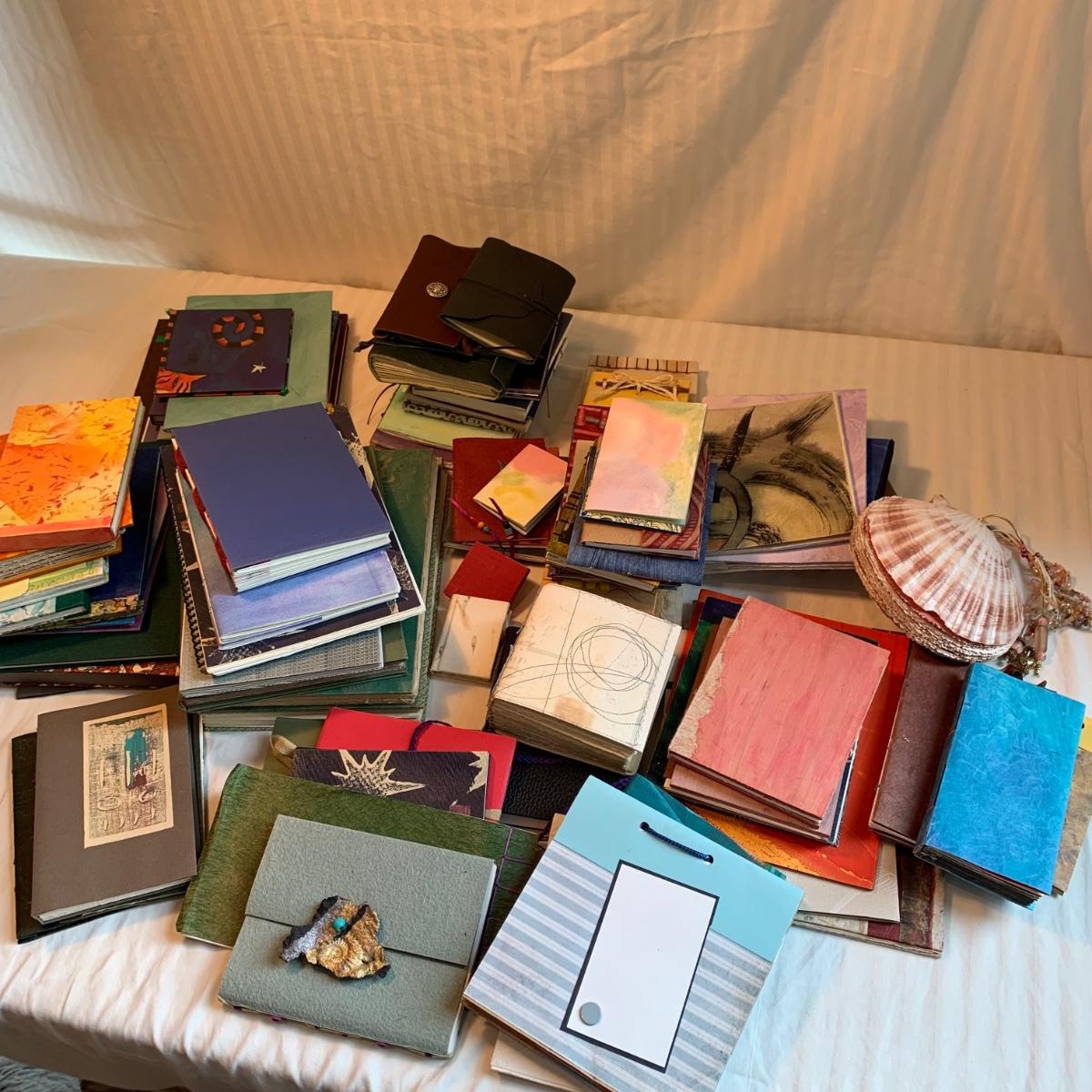 This is a collection of over 75 unique and beautiful handmade books with blank pages to fill! Some are paperback, some are hard cover, some have leather covers, and one is made of a big seashell! Please see photos for inventory. For reference, the seashell book is about 6” x 6”. The smallest book is just 2” x 2.5”. One book has some drawings found inside on a few pages.