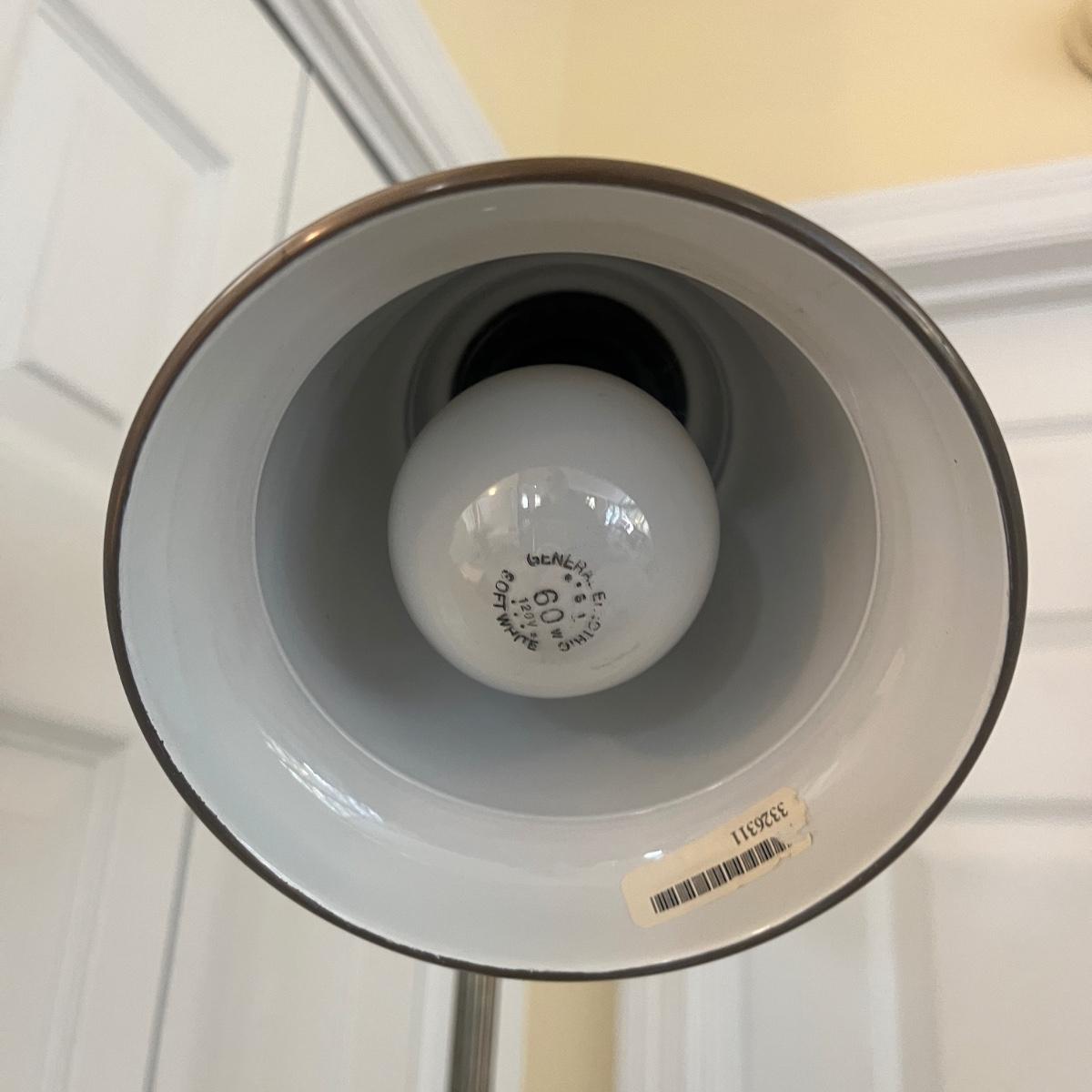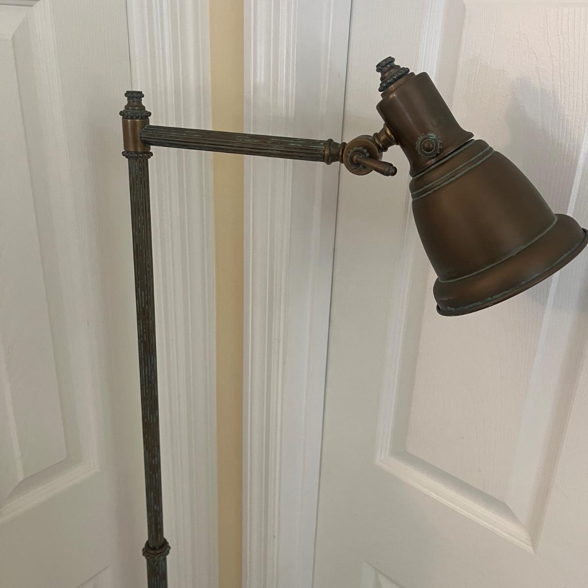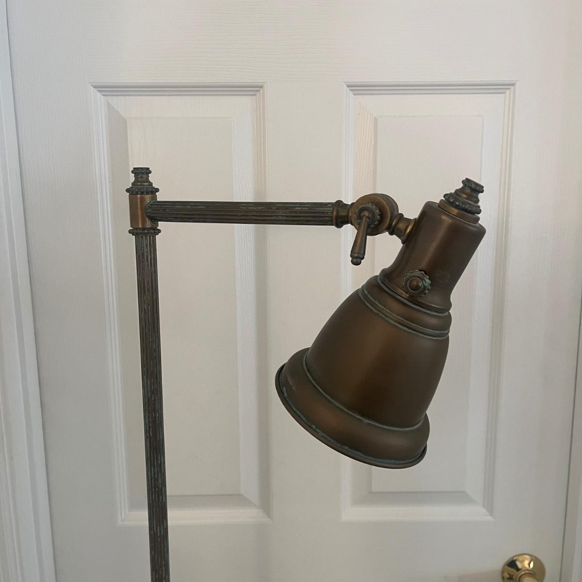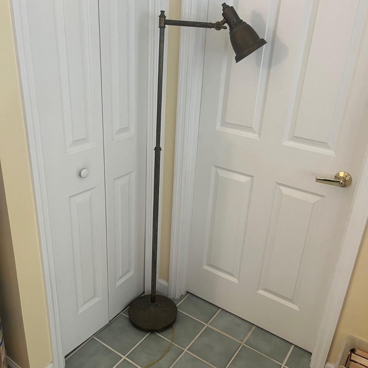 This floor lamp appears to be brass and has an adjustable bulb holder with an on/off switch and measures 17” x 10” x 66”H. Lamp powered on when plugged in.
