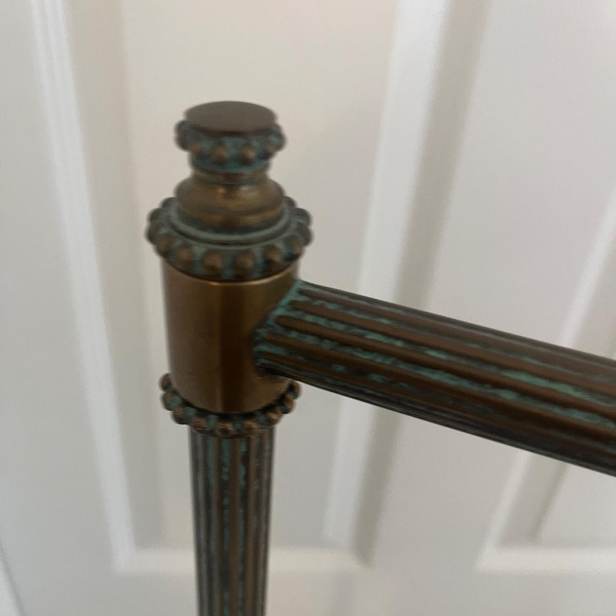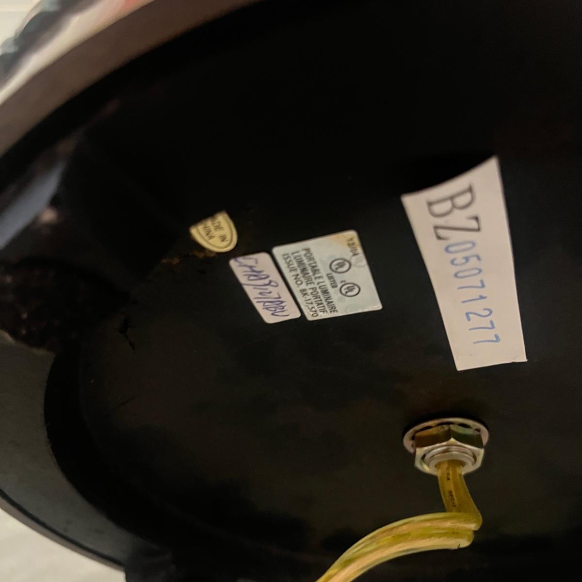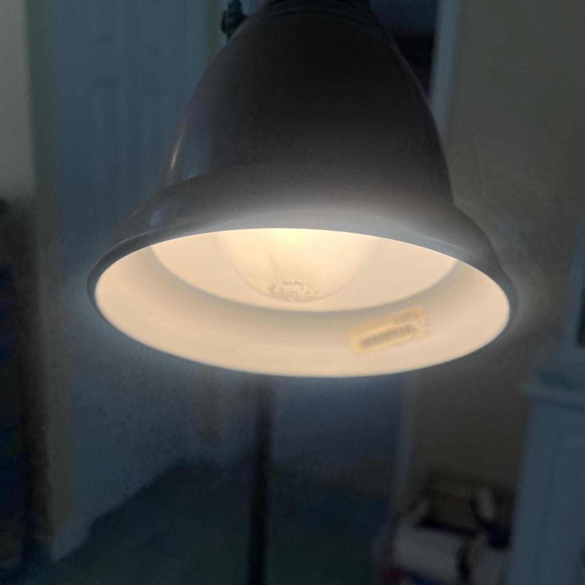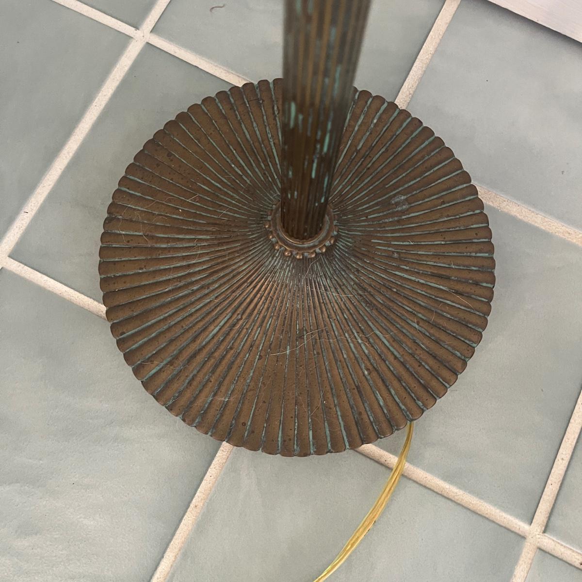 This floor lamp appears to be brass and has an adjustable bulb holder with an on/off switch and measures 17” x 10” x 66”H. Lamp powered on when plugged in.