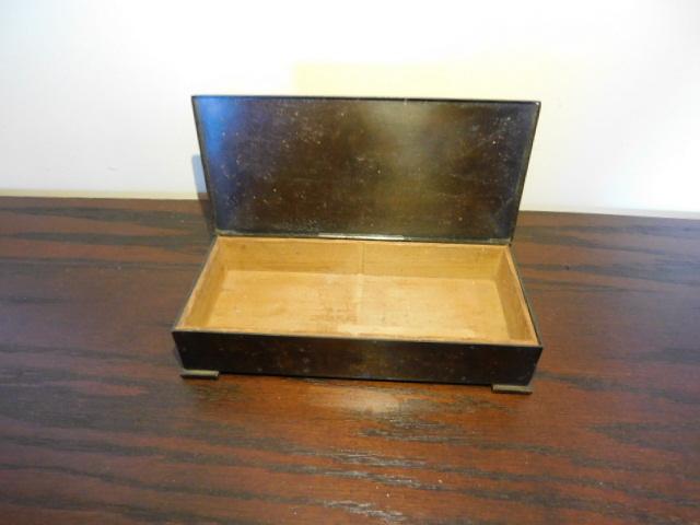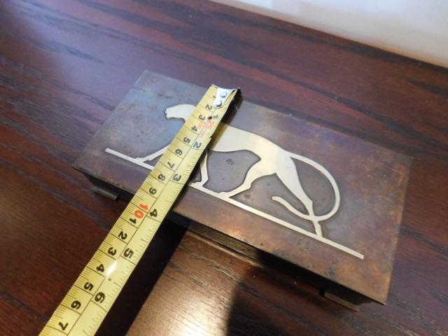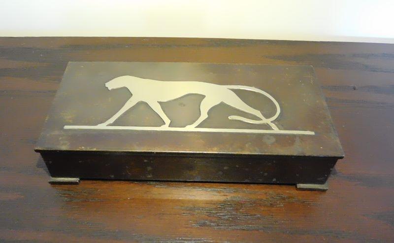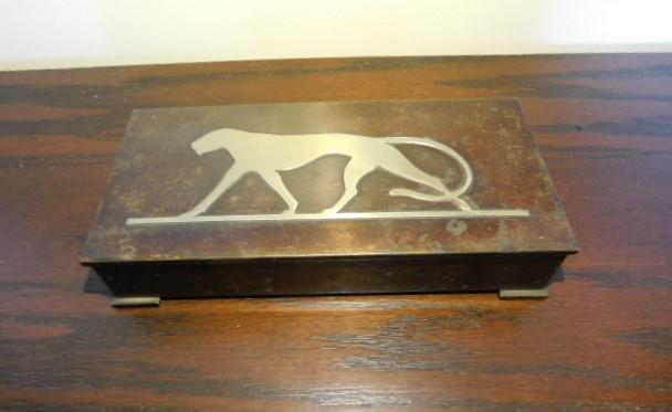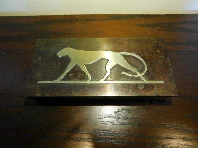 Unique Brass wood lined Box with Prowling Cougar Embossed On Front 8"x4" may need polishing but has nice lines and features with cougar well defined.
