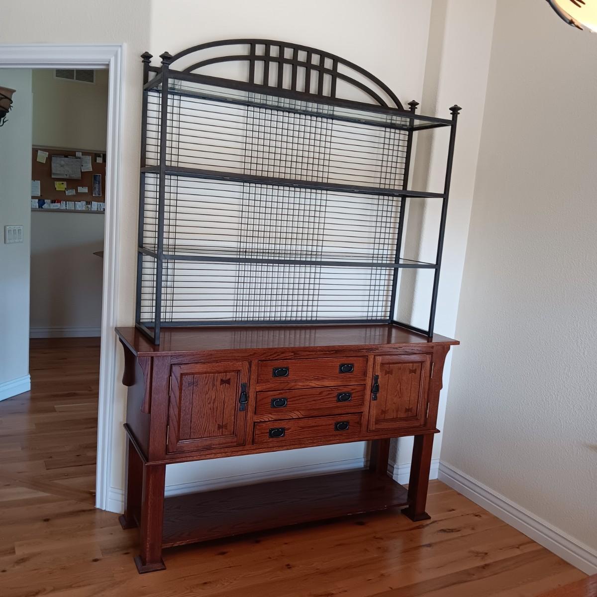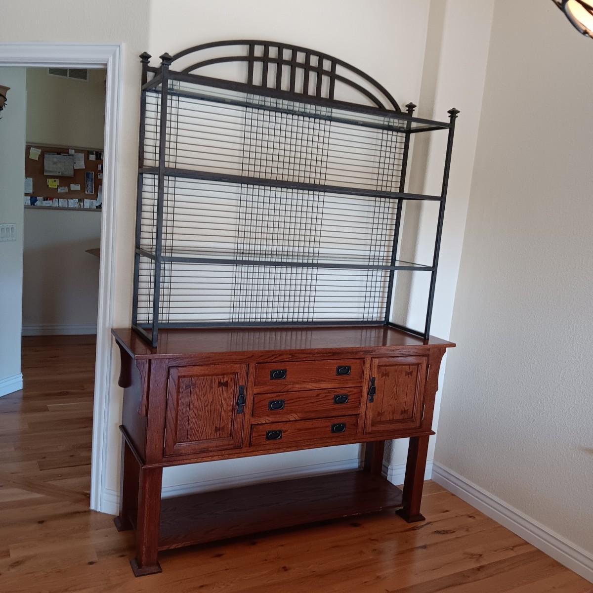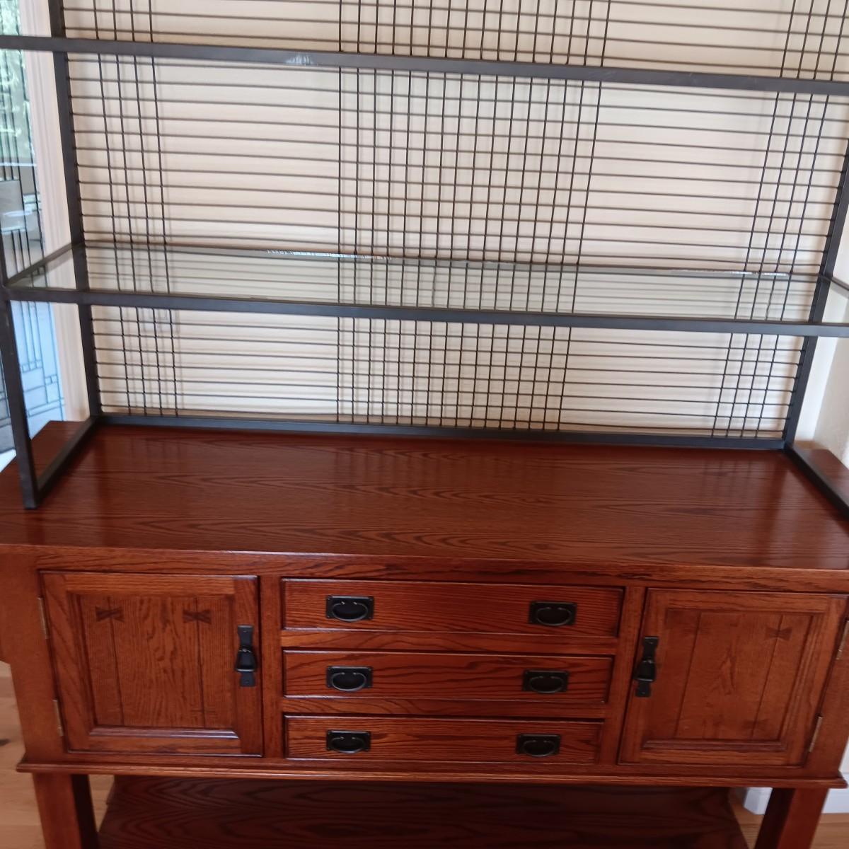 UNIQUE BUFFET WITH METAL FRAME GRID PANELED HUTCH THAT HAS 3 GLASS SHELVES