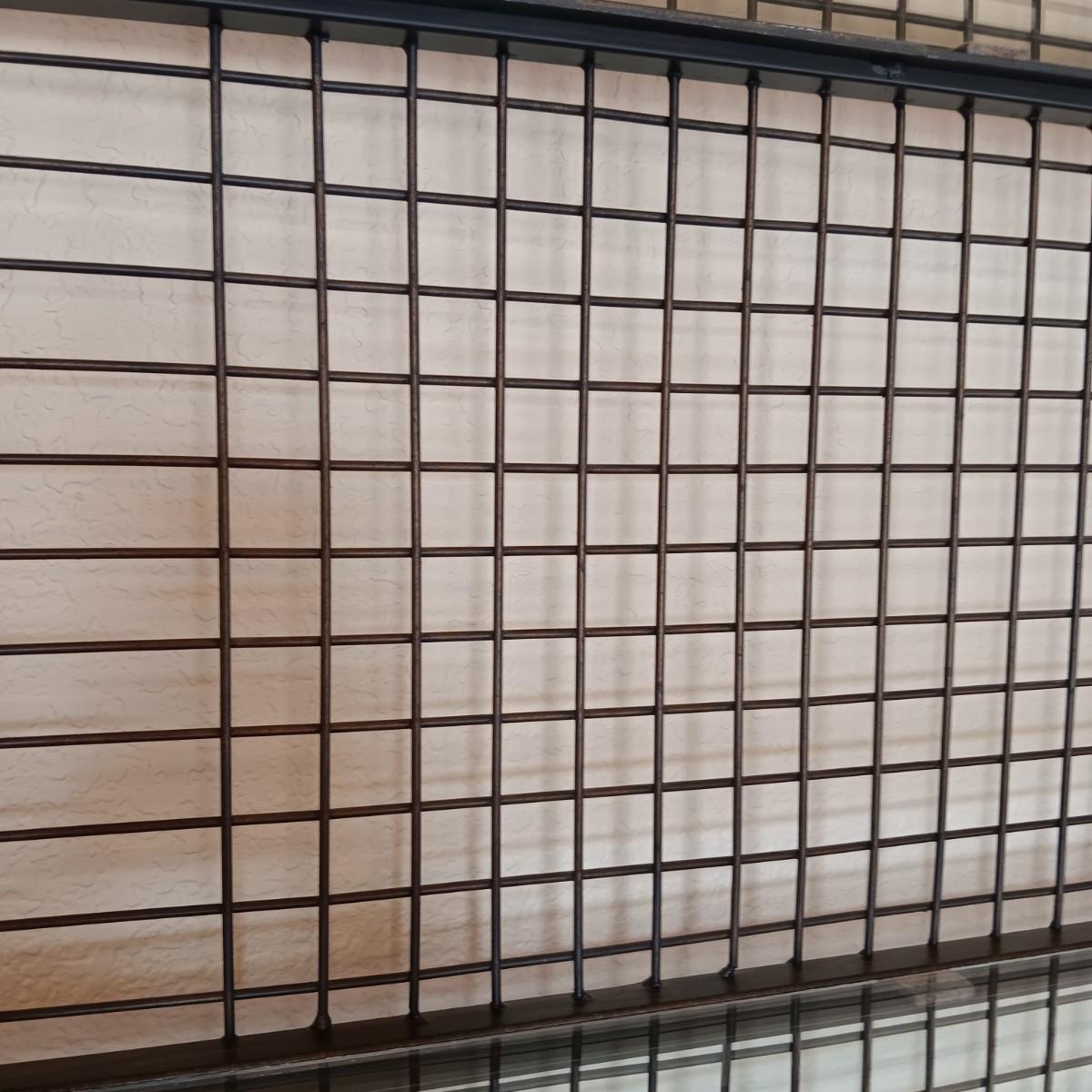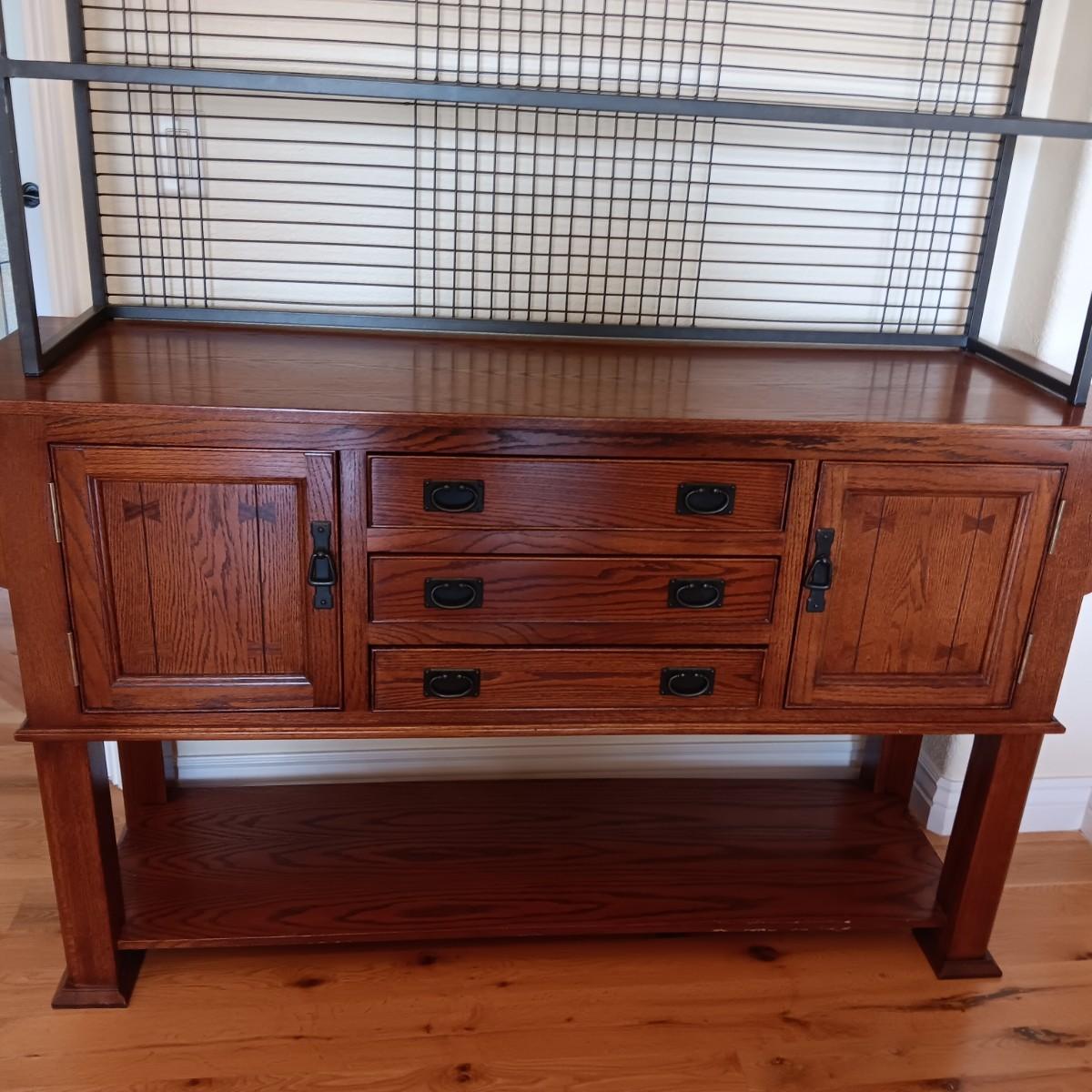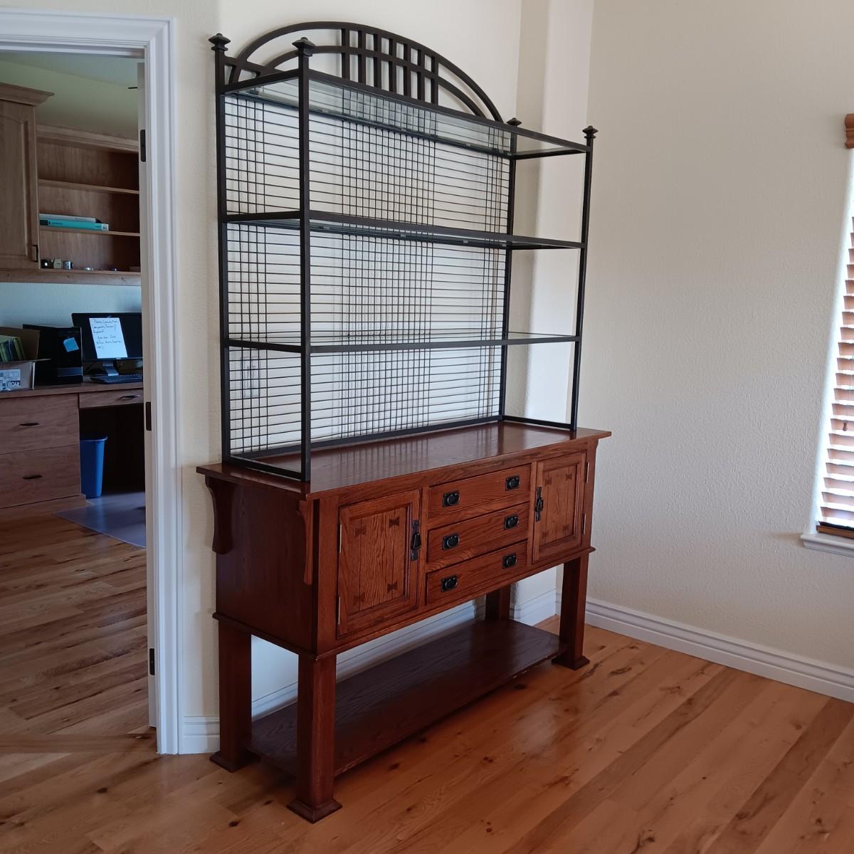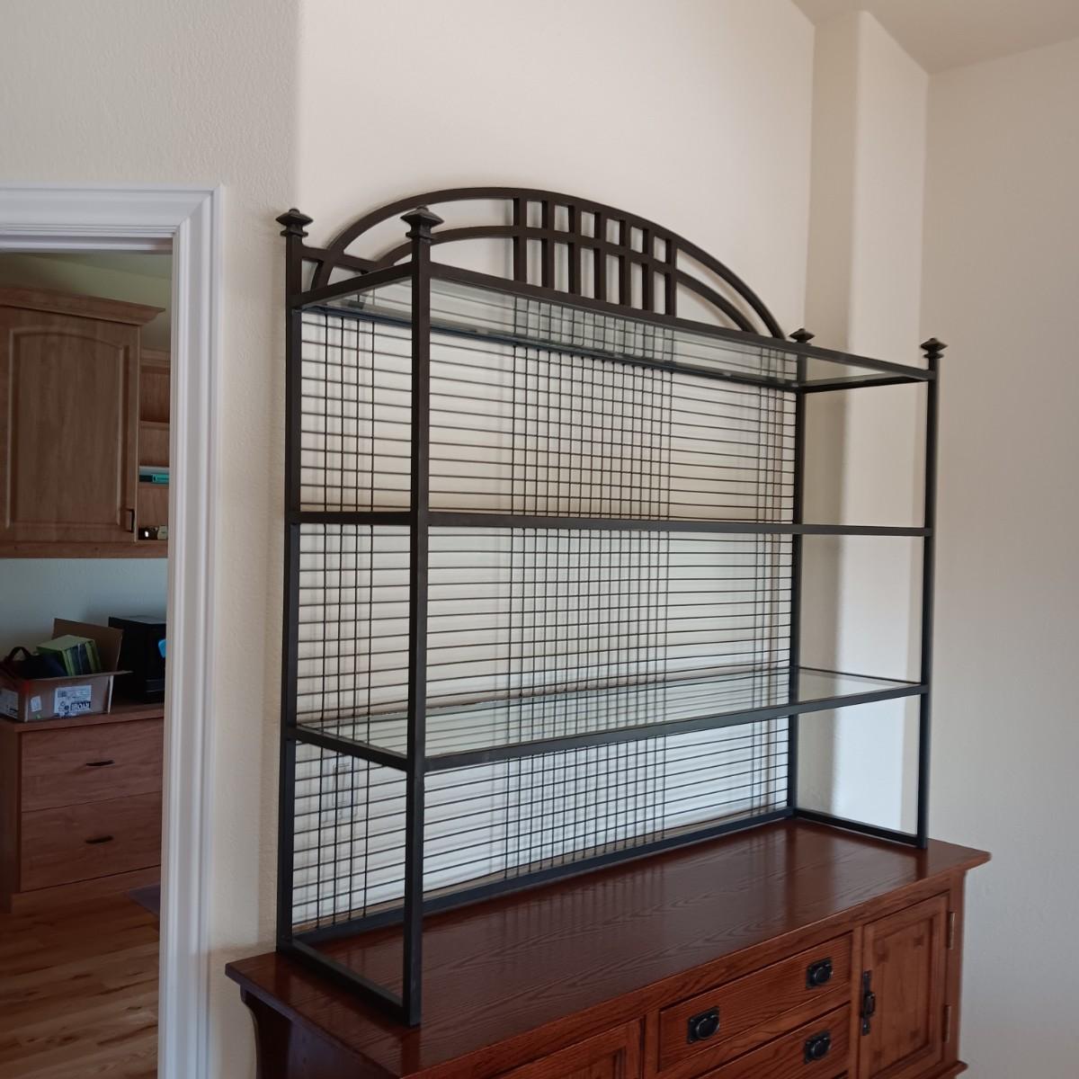 UNIQUE BUFFET WITH METAL FRAME GRID PANELED HUTCH THAT HAS 3 GLASS SHELVES