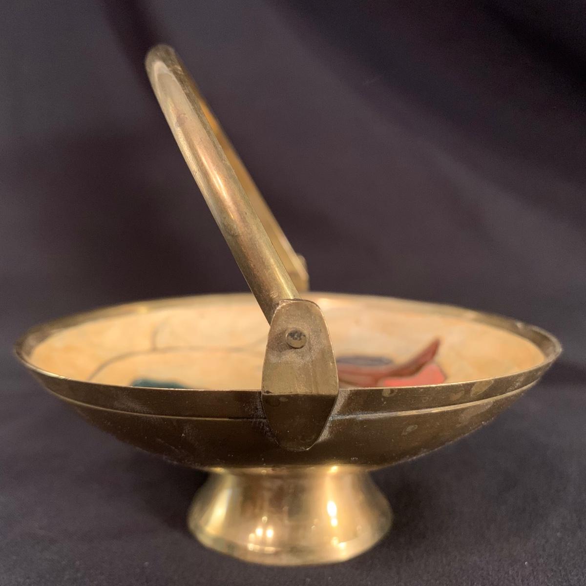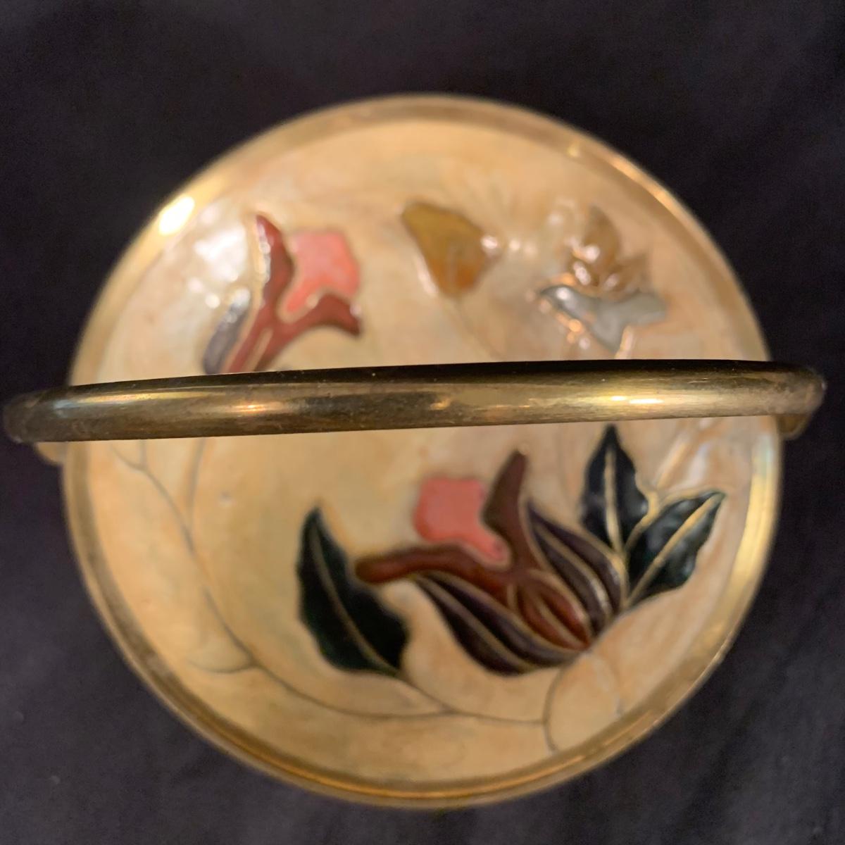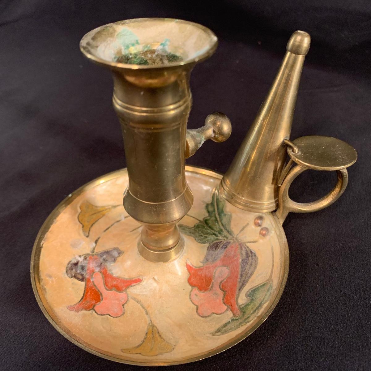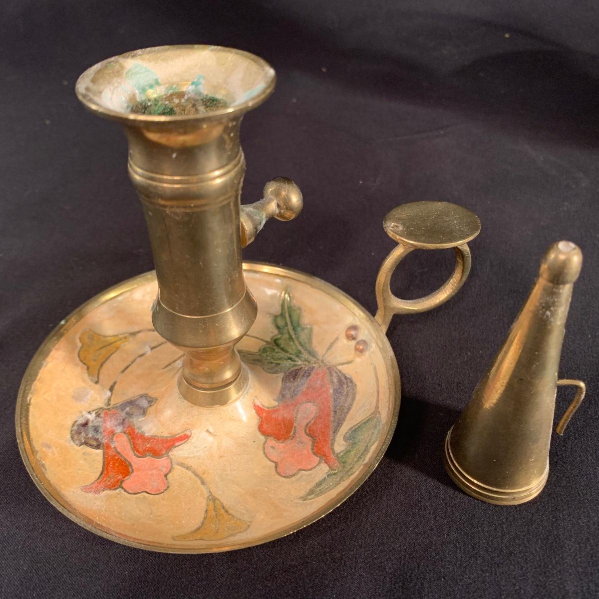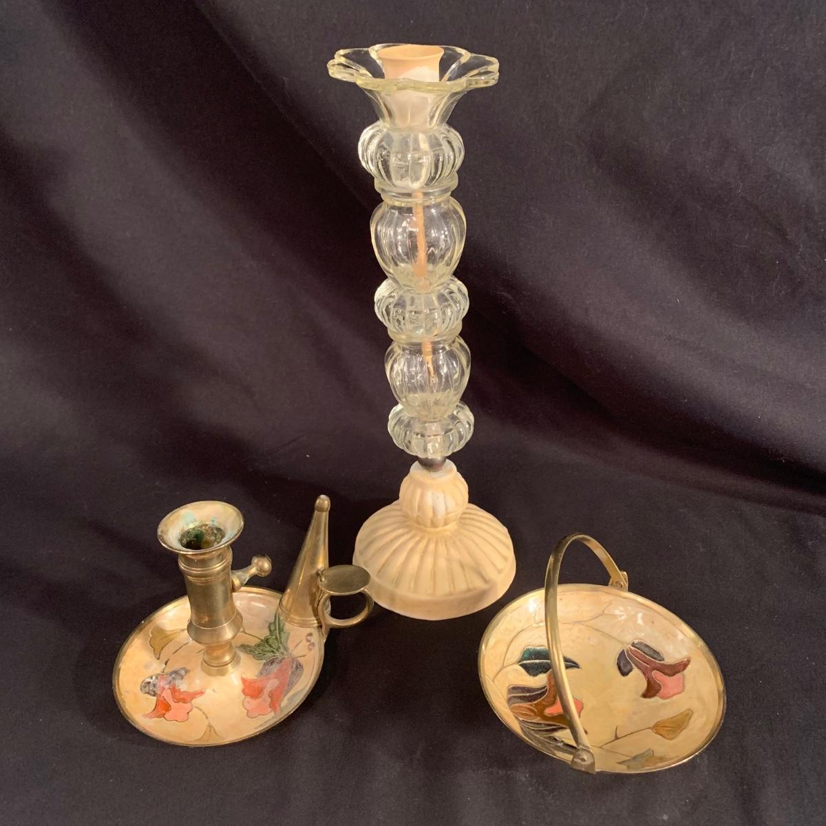 This lot includes a metal and glass candlestick holder, candle holder tray with snuffer, and footed dish with floral design. The two smaller items appear to be brass with an enameled design. All items seem to be in good condition. The glass candlestick measures 4”D at the base with a height of 12”H.