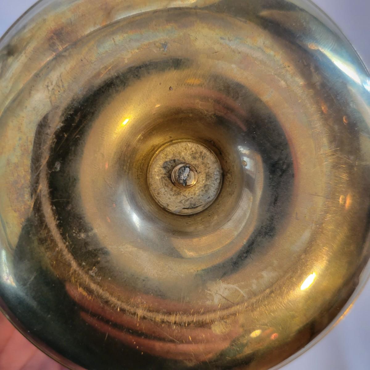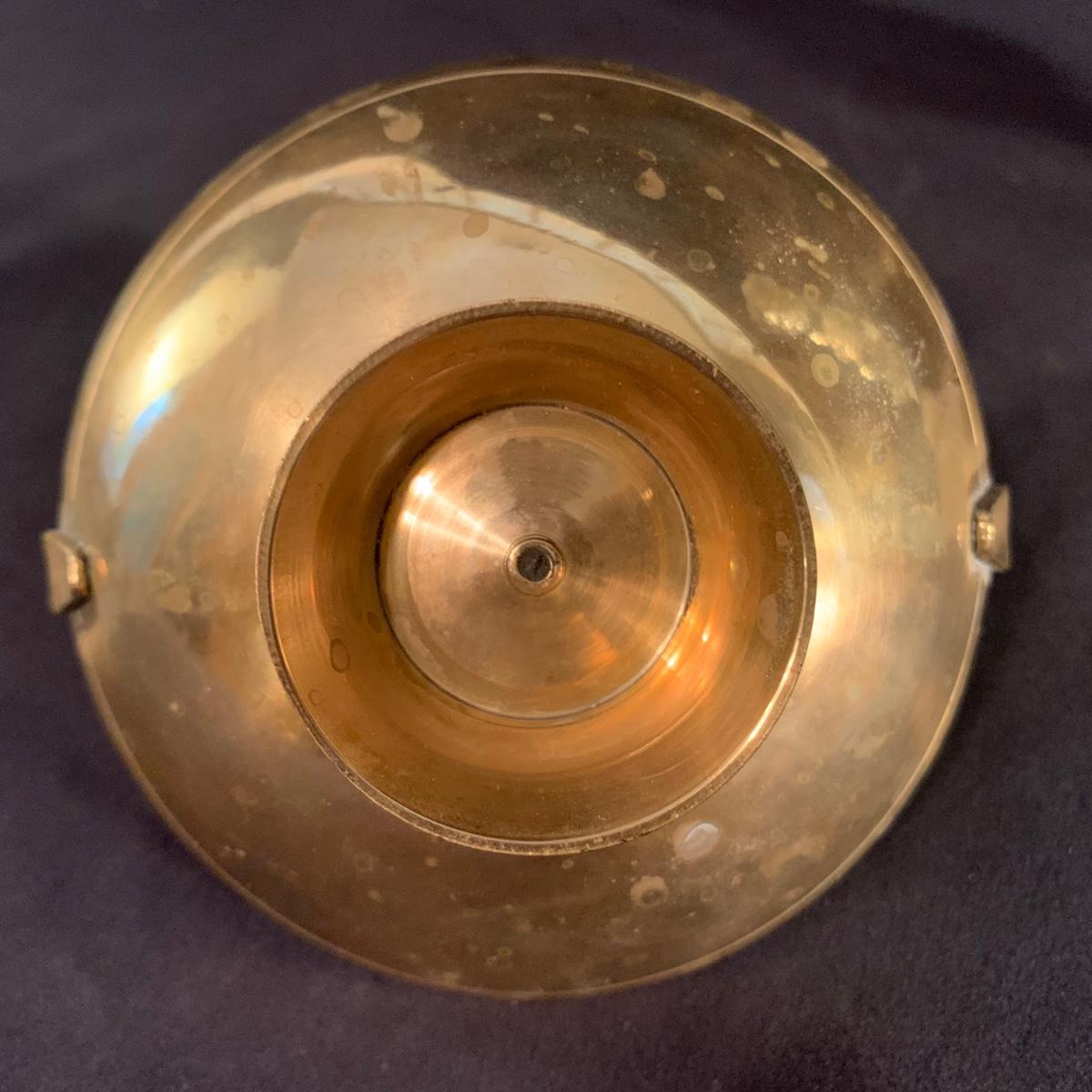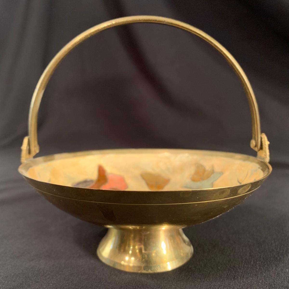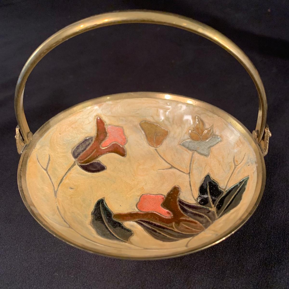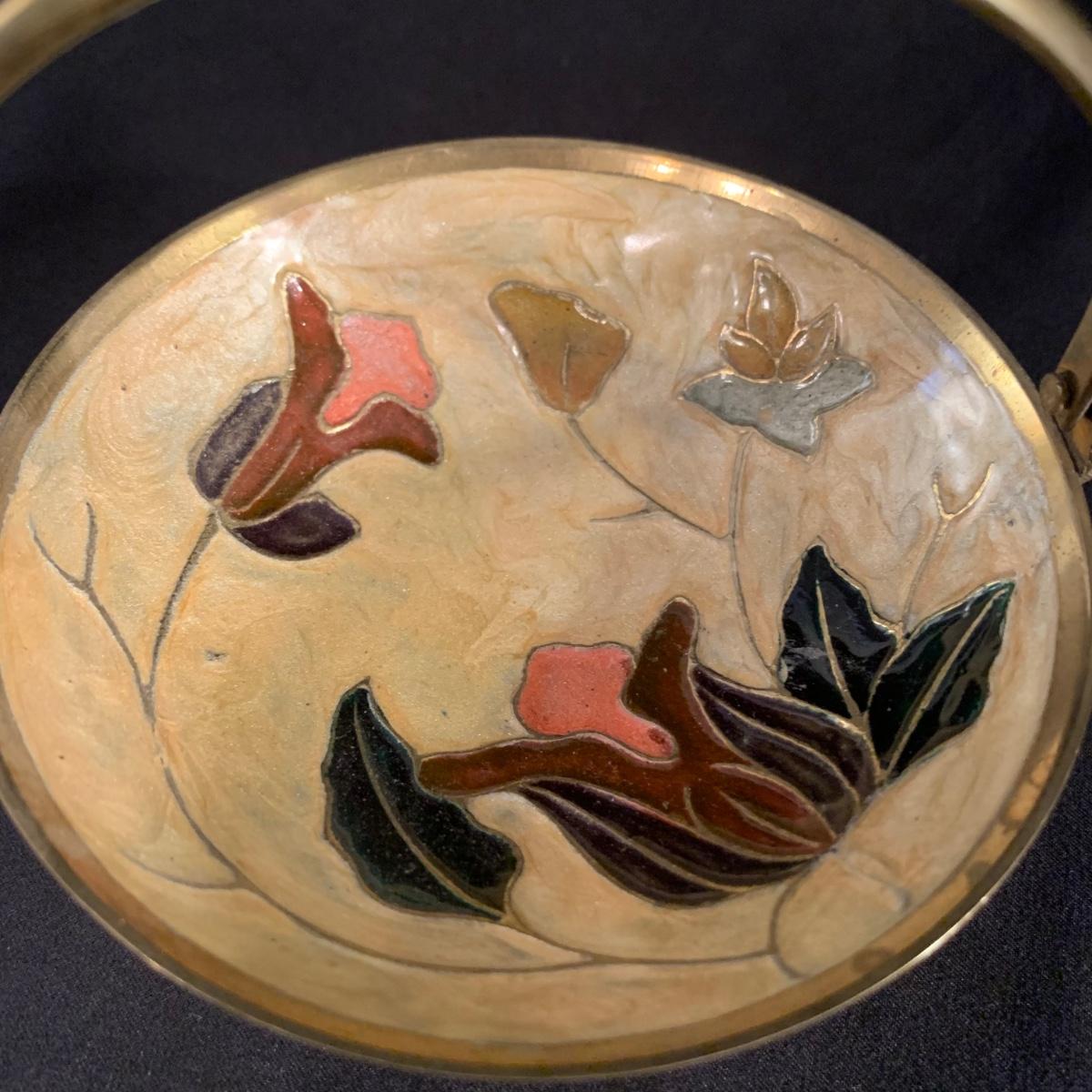 This lot includes a metal and glass candlestick holder, candle holder tray with snuffer, and footed dish with floral design. The two smaller items appear to be brass with an enameled design. All items seem to be in good condition. The glass candlestick measures 4”D at the base with a height of 12”H.