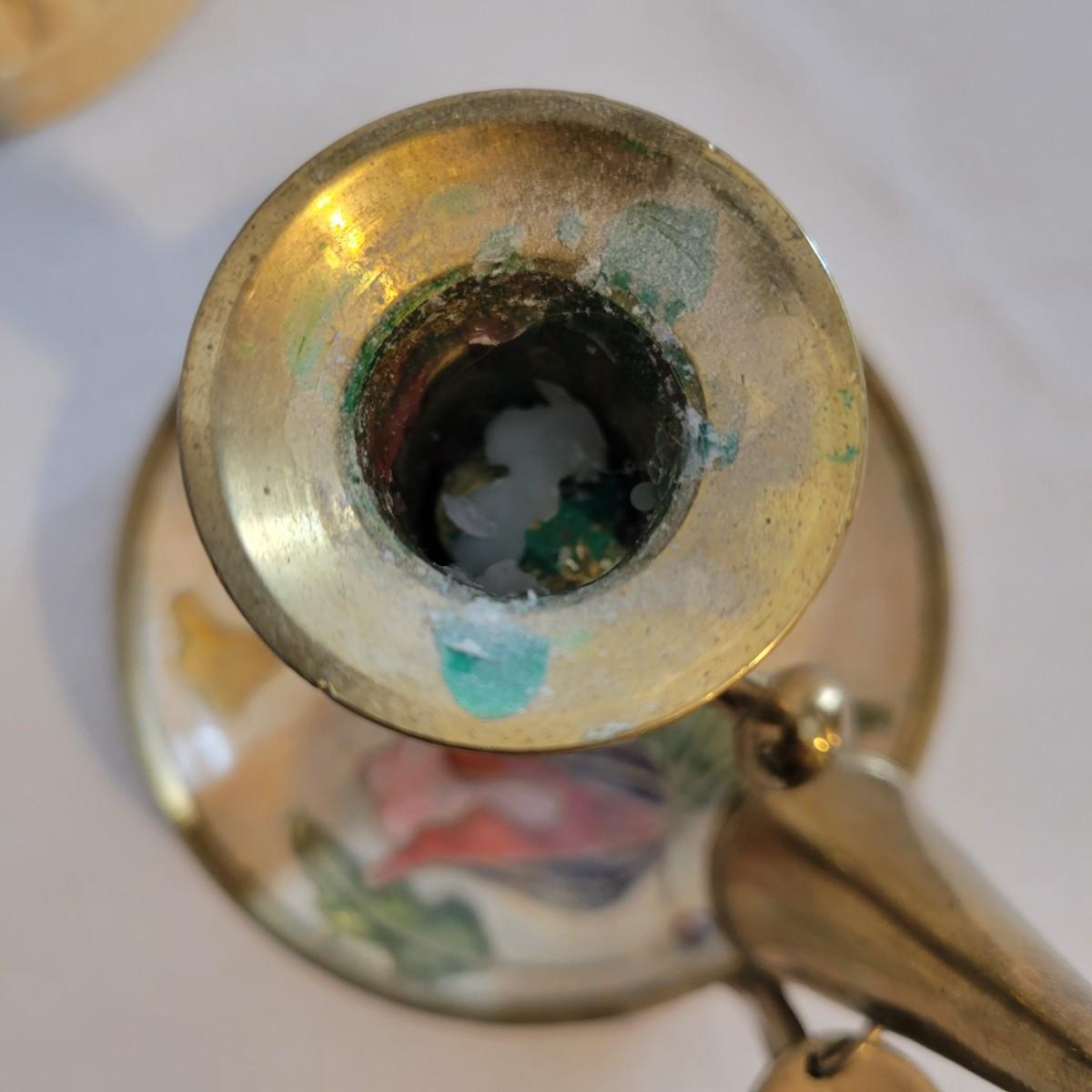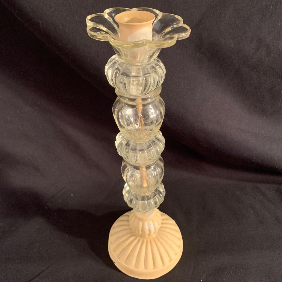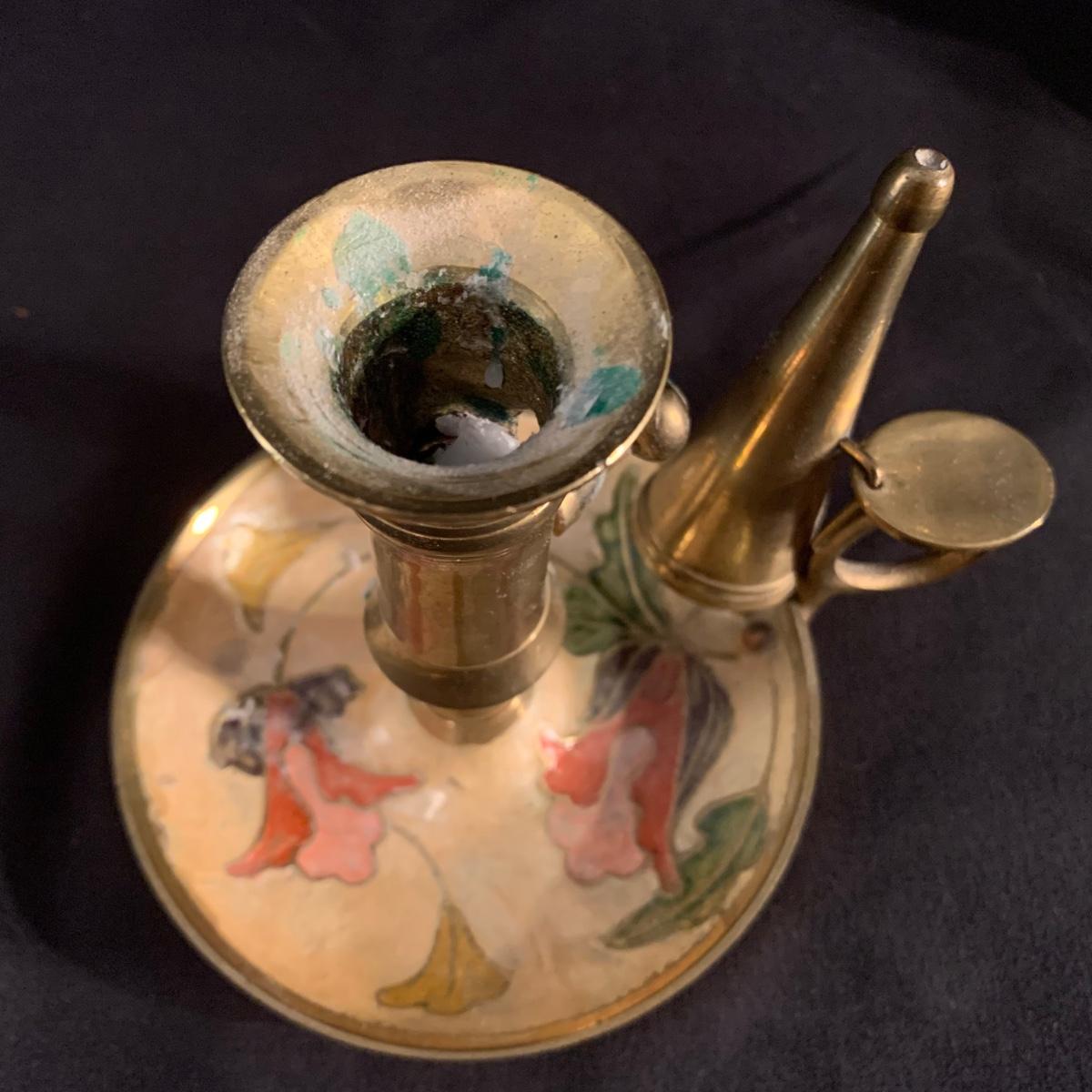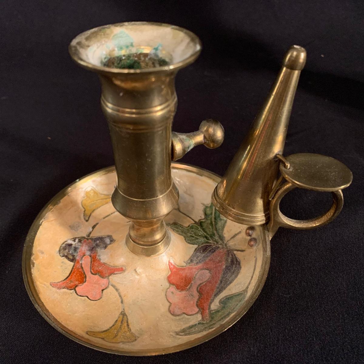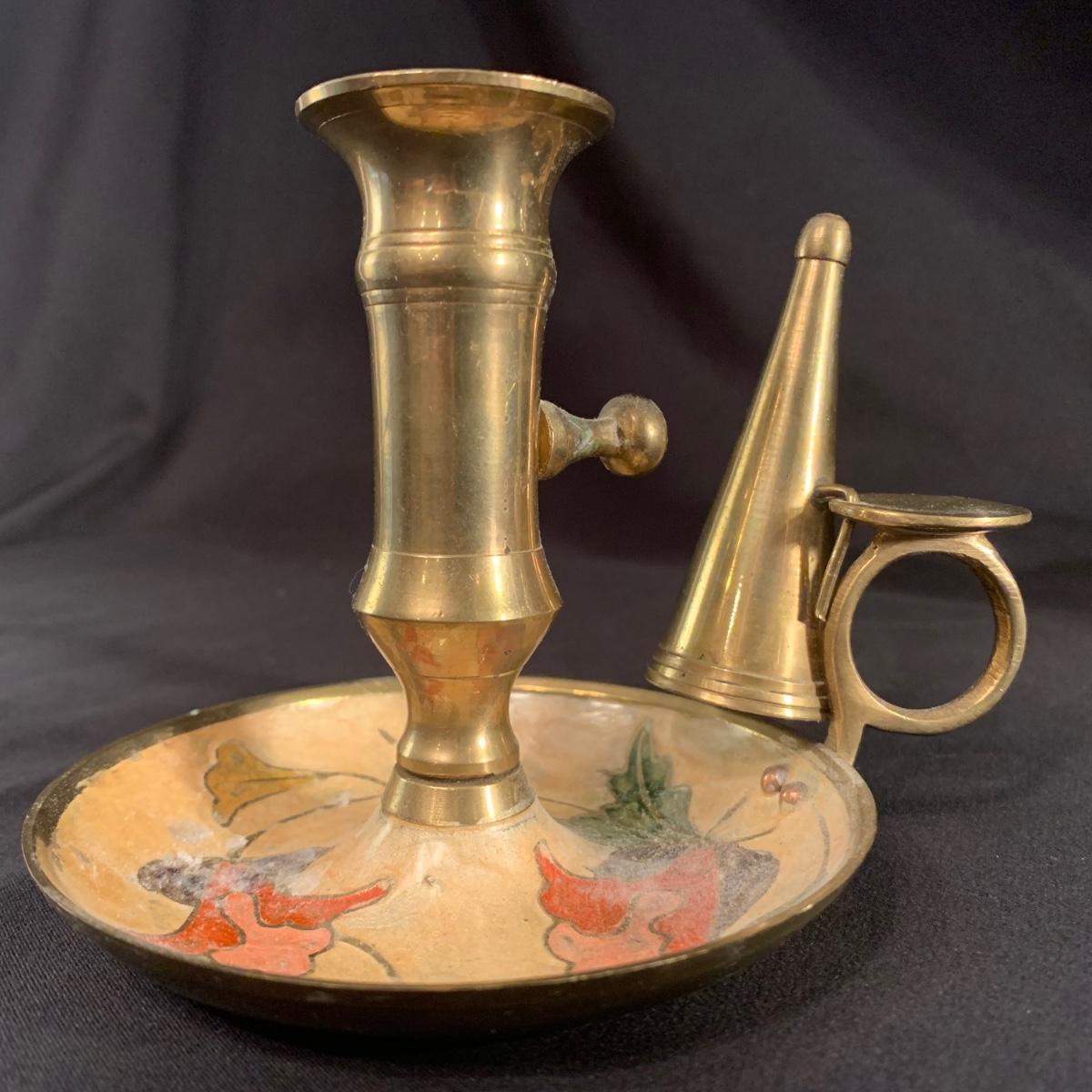 Unique Glass Candlestick with Enameled Brass Chamberstick & Dish with Floral Design (LR-LW)