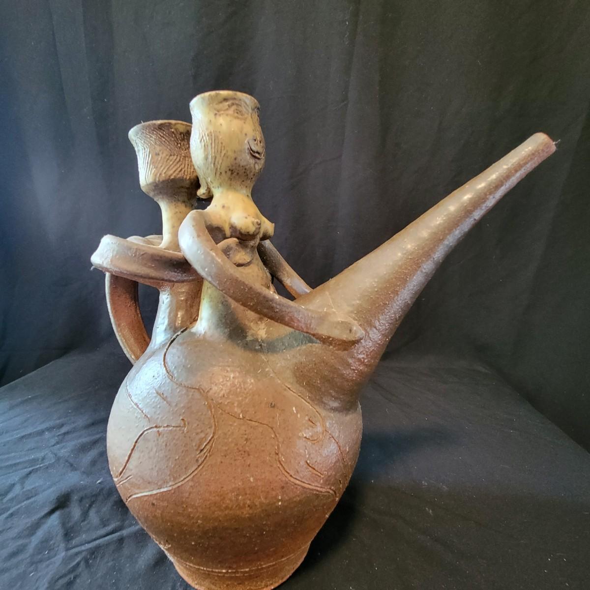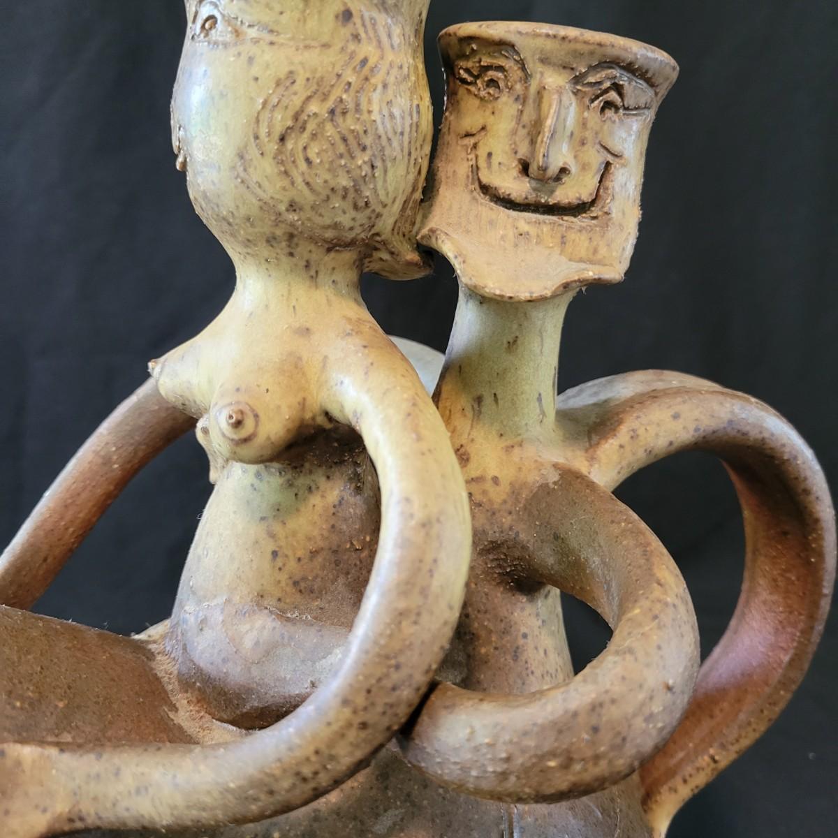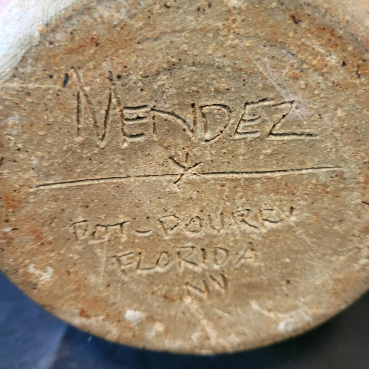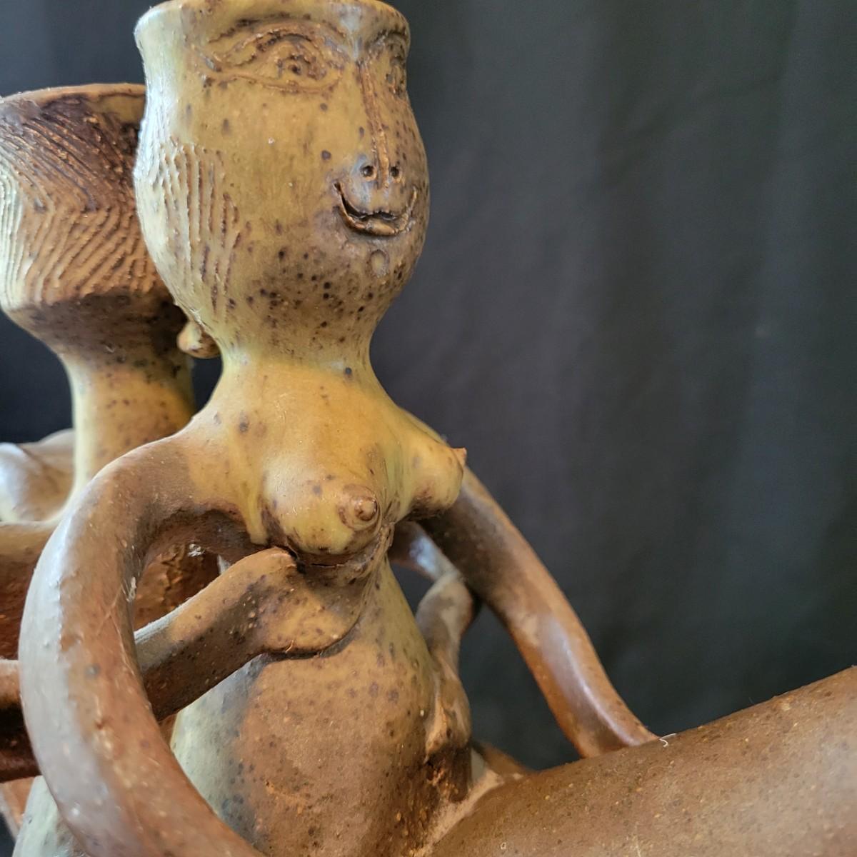 Very unique piece of handcrafted and signed pottery piece of a couple riding a pot. Artist signed by Mendez. Measures approximately 13" x 13" Shipping available