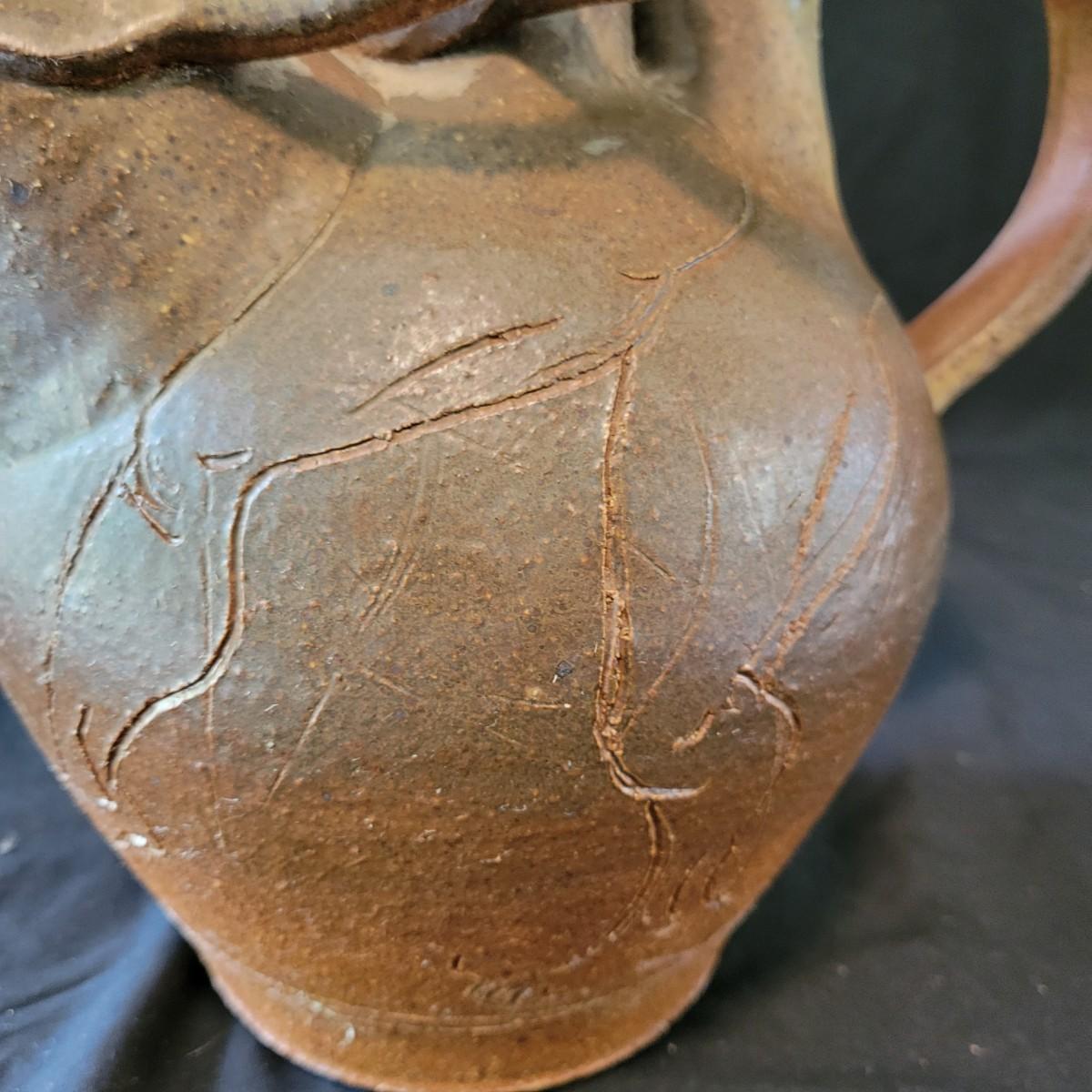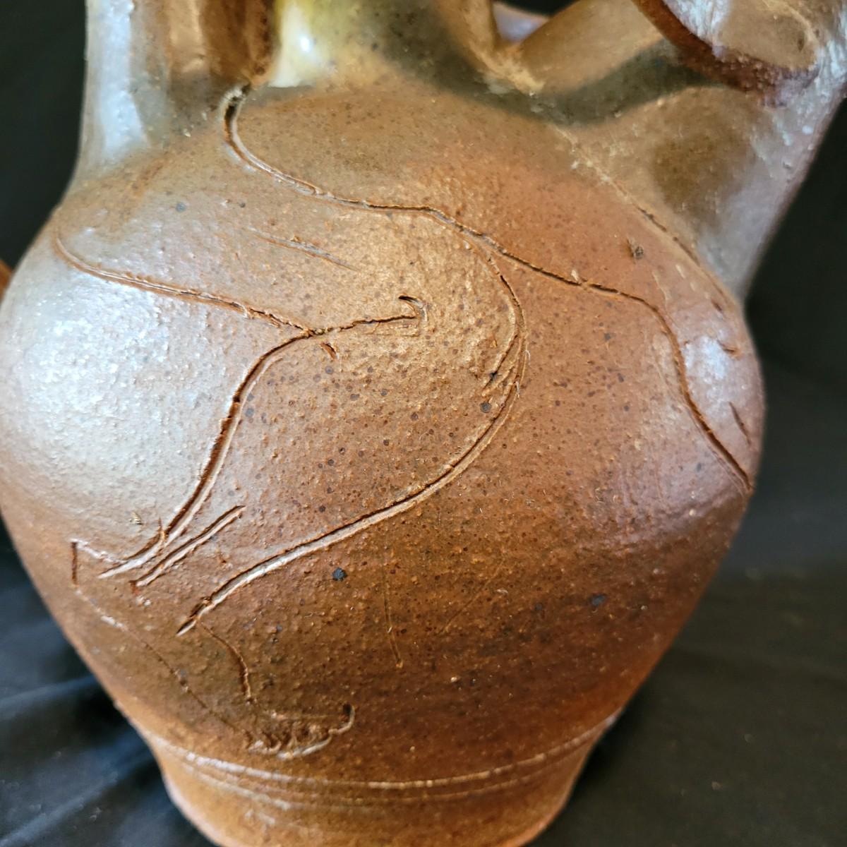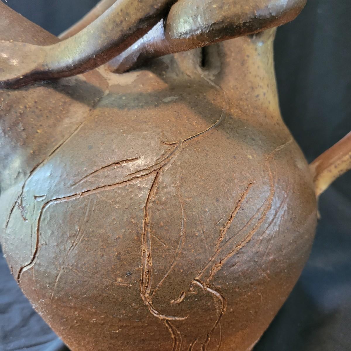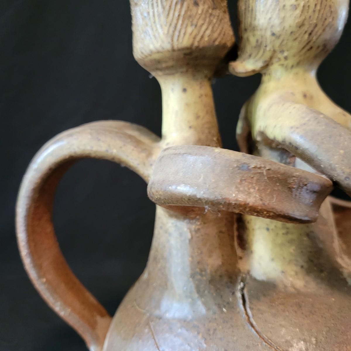 Very unique piece of handcrafted and signed pottery piece of a couple riding a pot. Artist signed by Mendez. Measures approximately 13" x 13" Shipping available