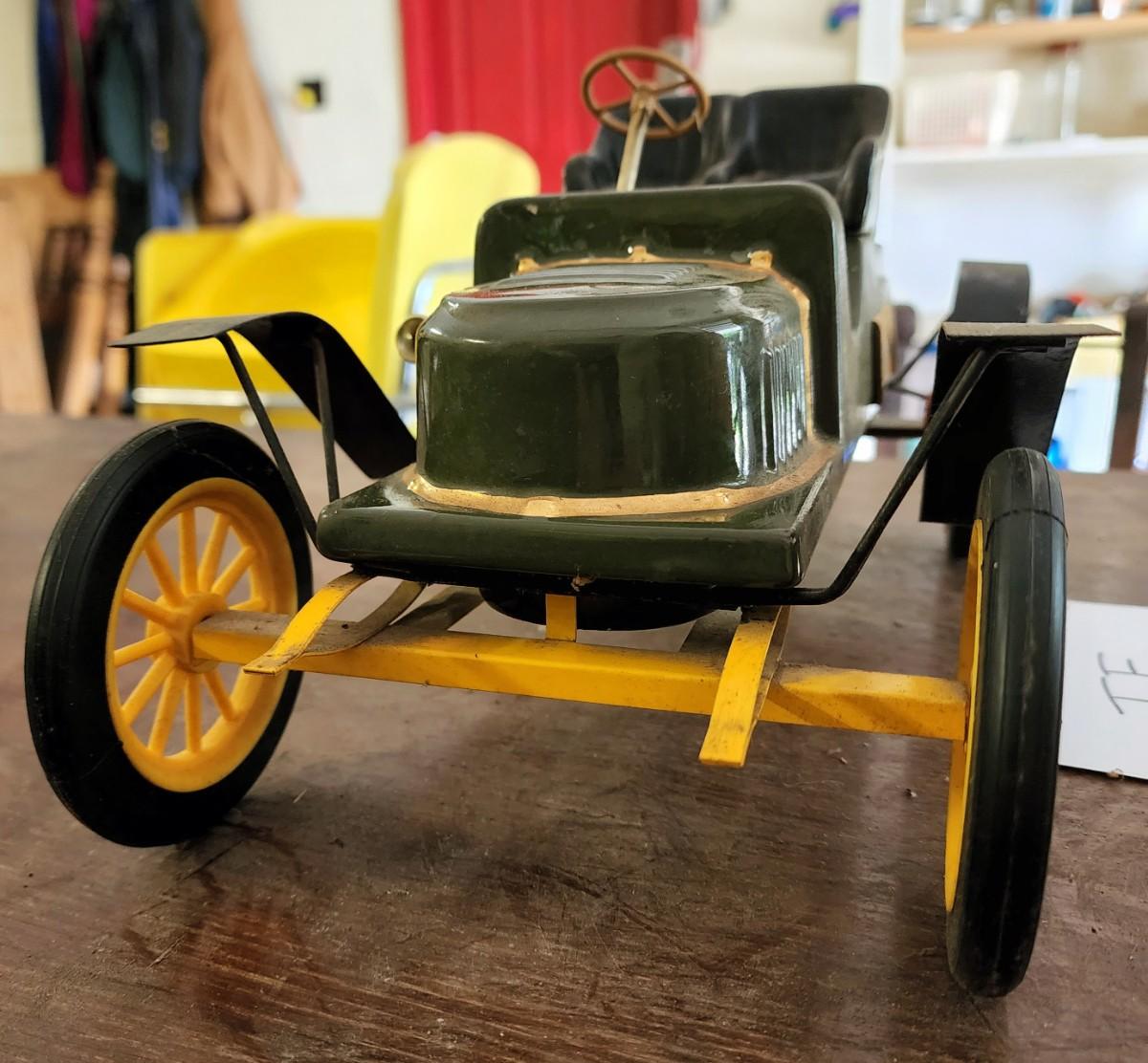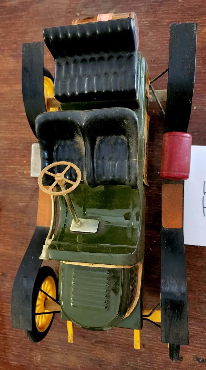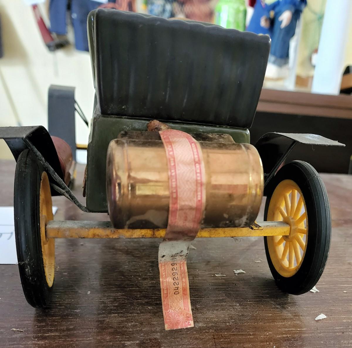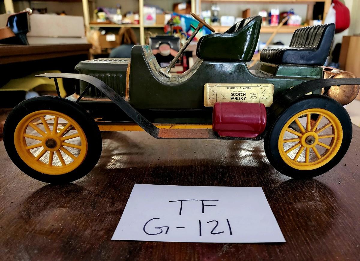 This unique car used to hold some "gold liquid" it is empty. The back Cork is broken. Won't take much to fix. This is a very cool collectors piece.