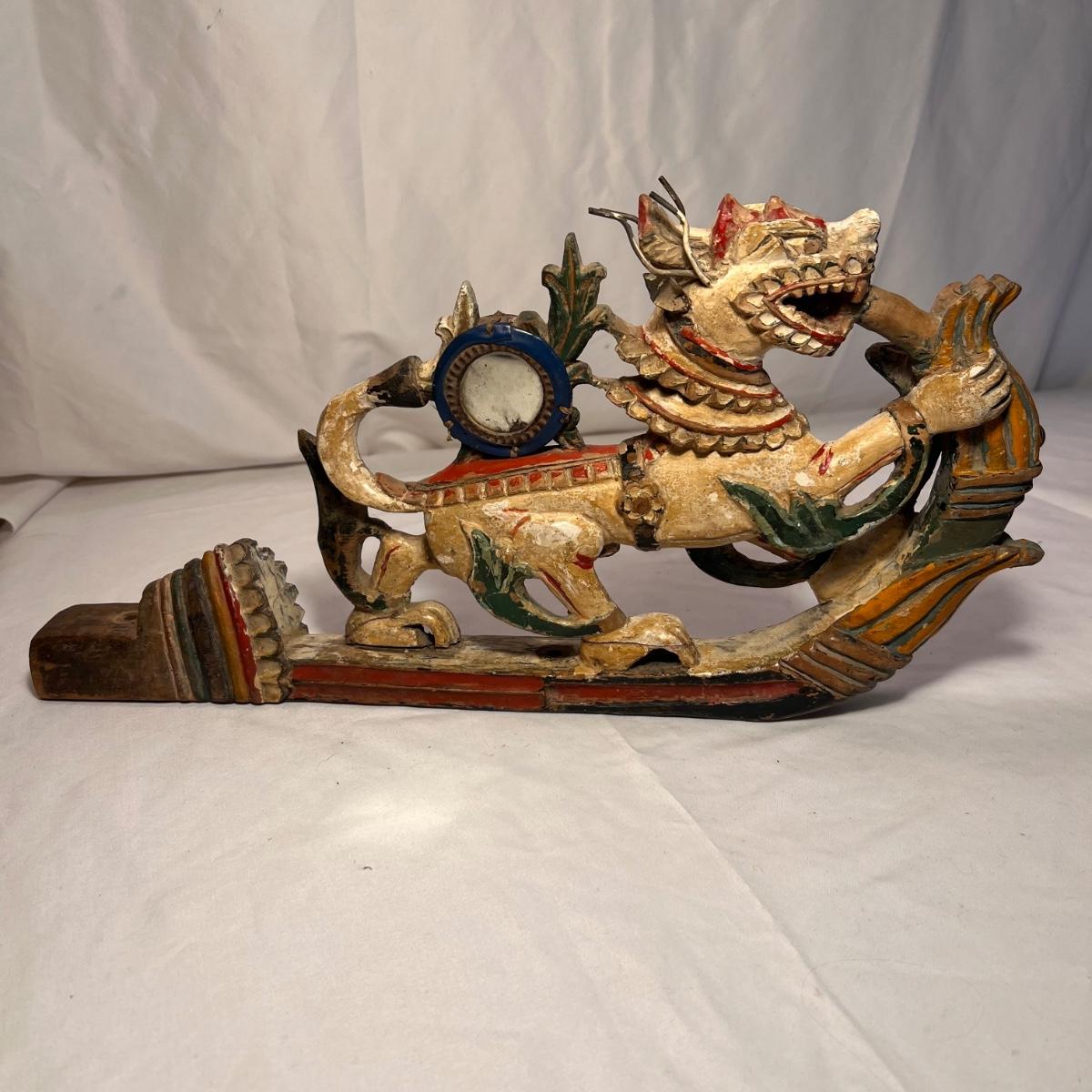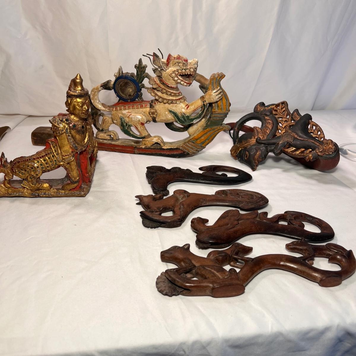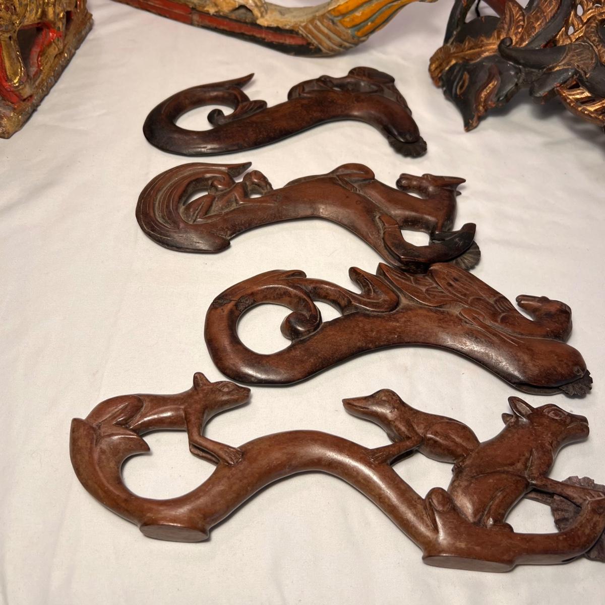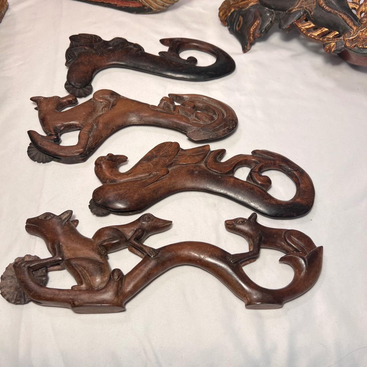 This wonderful assortment of items are all wooden. The largest piece is the mythical creature with metal accents on its head and a small mirror on its back; measures 17” x 2” x 8”H. The four carved items appear to be tools for making chalk lines and feature animals. The piece that hangs has a black lace loop to hang it up. Lastly is a gilded wood corner piece.