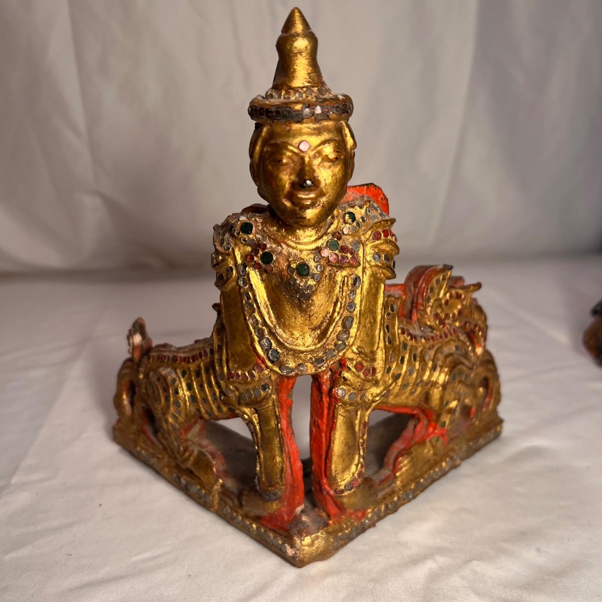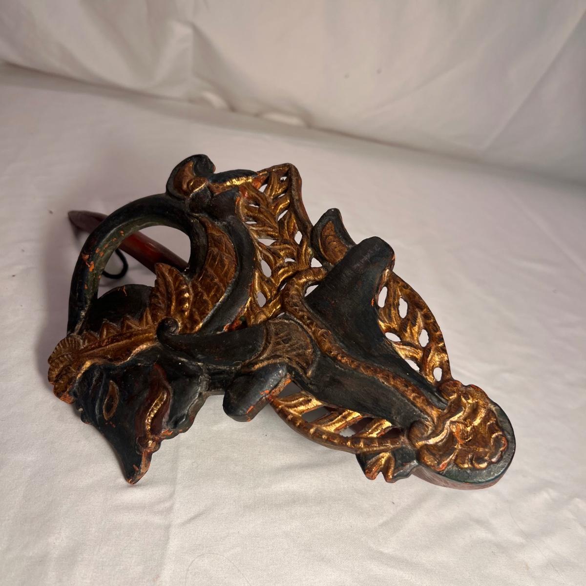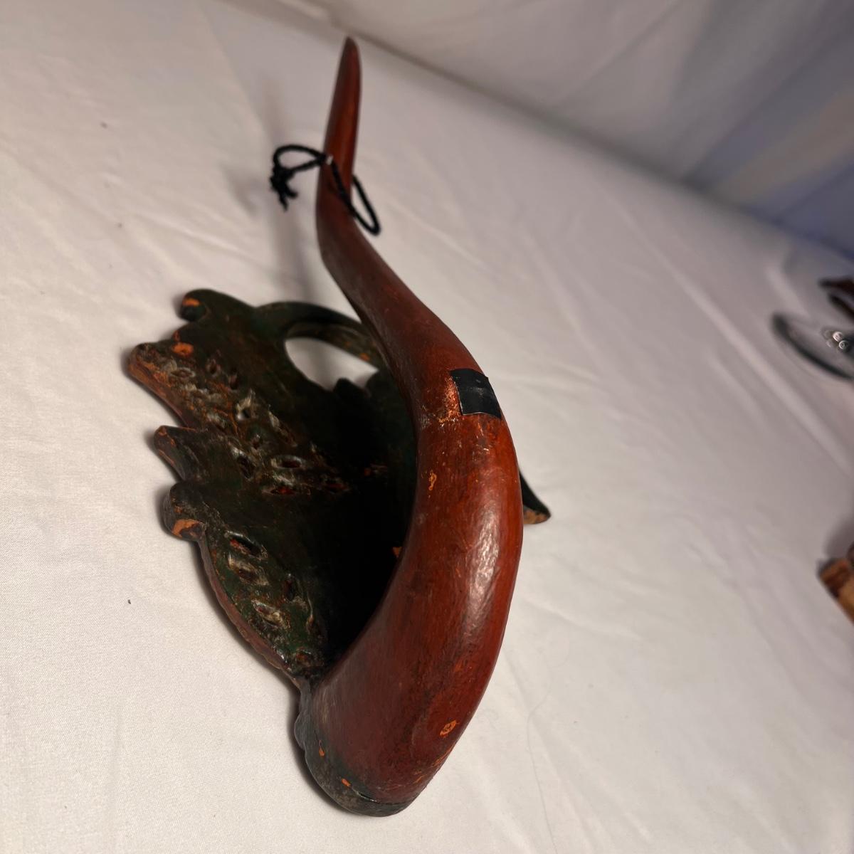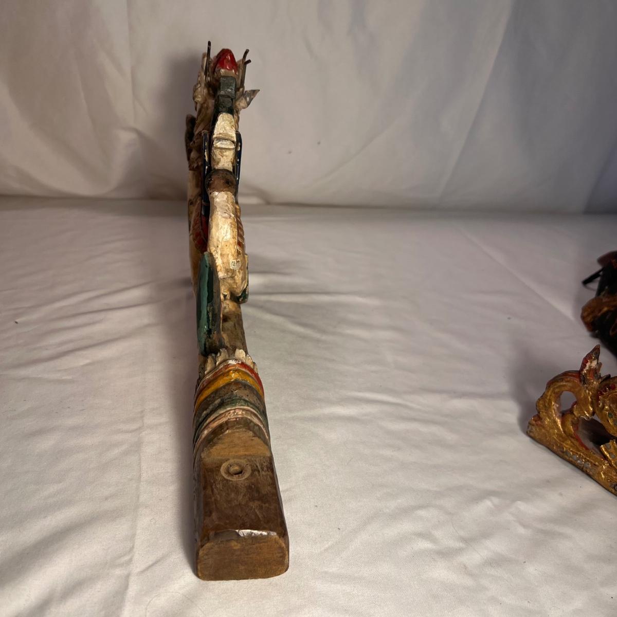 This wonderful assortment of items are all wooden. The largest piece is the mythical creature with metal accents on its head and a small mirror on its back; measures 17” x 2” x 8”H. The four carved items appear to be tools for making chalk lines and feature animals. The piece that hangs has a black lace loop to hang it up. Lastly is a gilded wood corner piece.