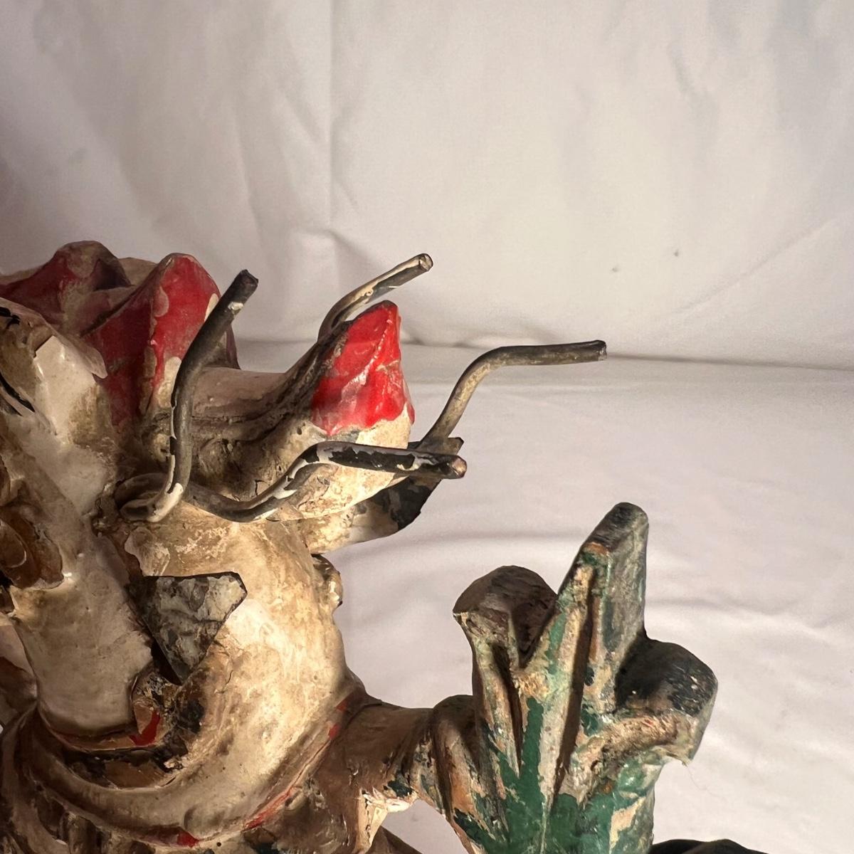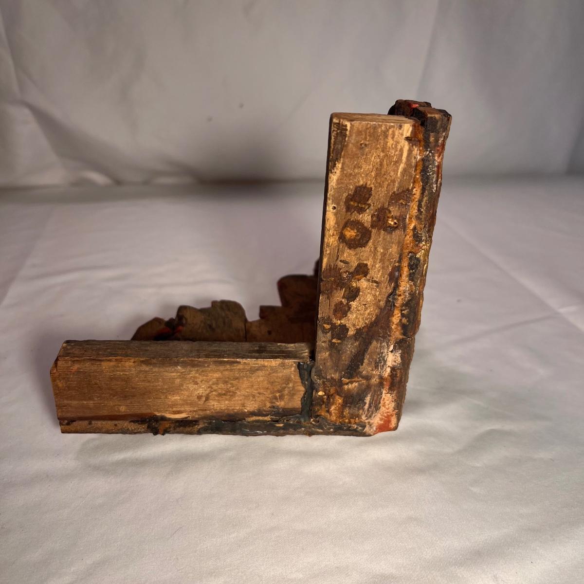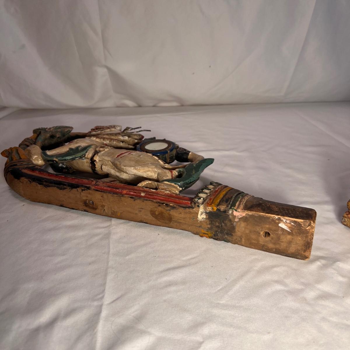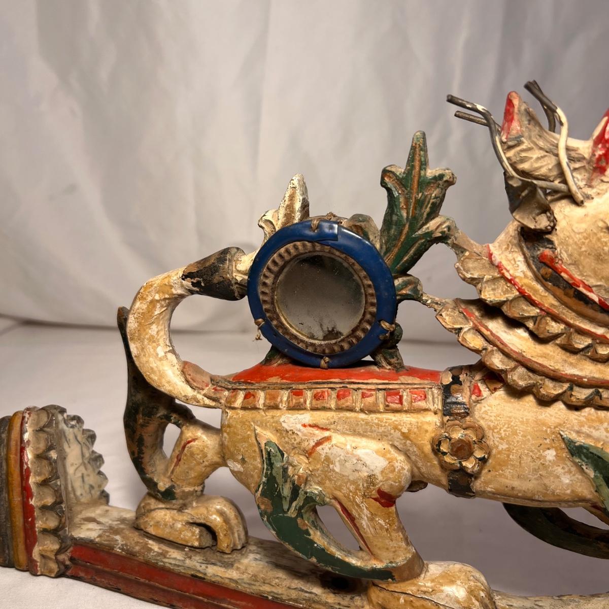 This wonderful assortment of items are all wooden. The largest piece is the mythical creature with metal accents on its head and a small mirror on its back; measures 17” x 2” x 8”H. The four carved items appear to be tools for making chalk lines and feature animals. The piece that hangs has a black lace loop to hang it up. Lastly is a gilded wood corner piece.