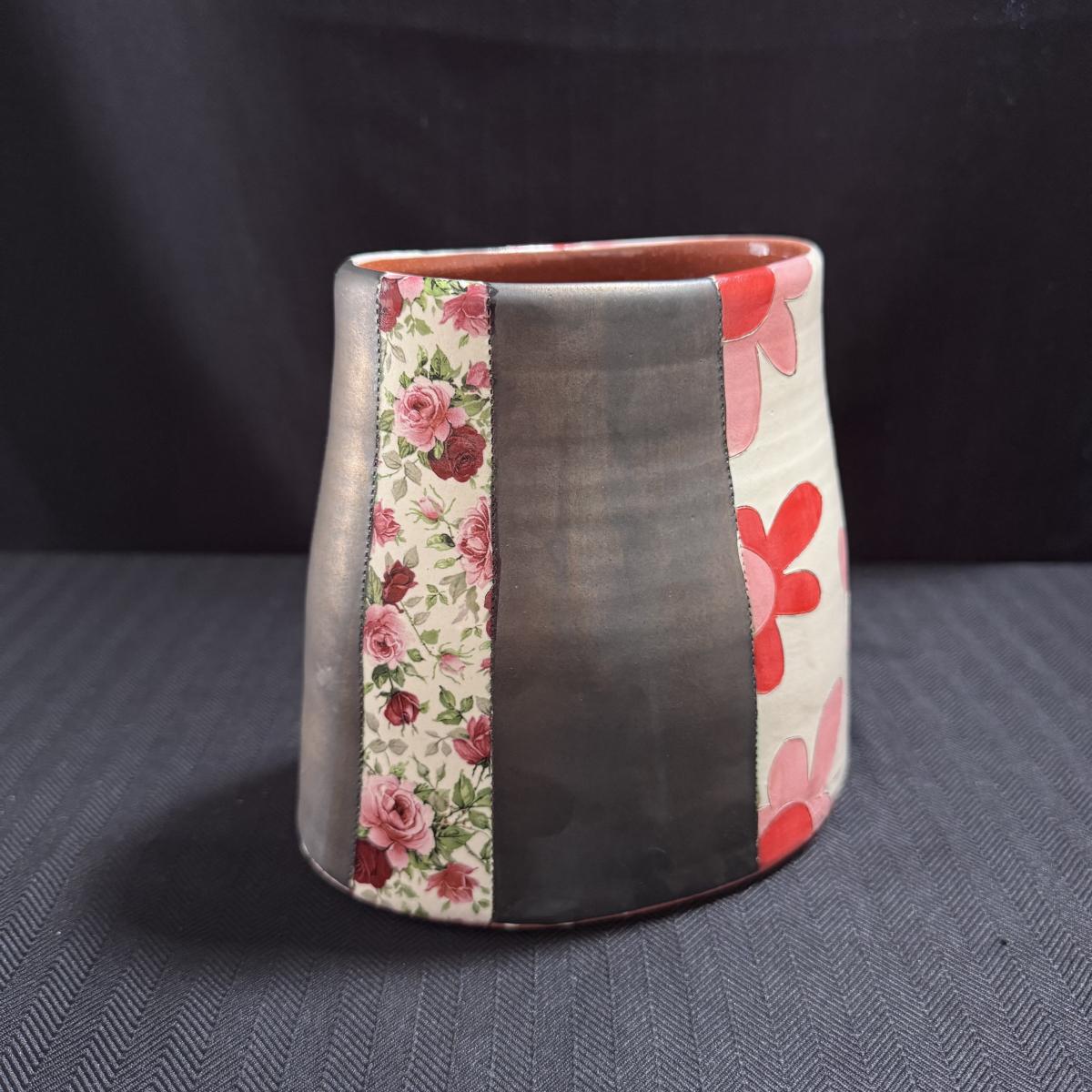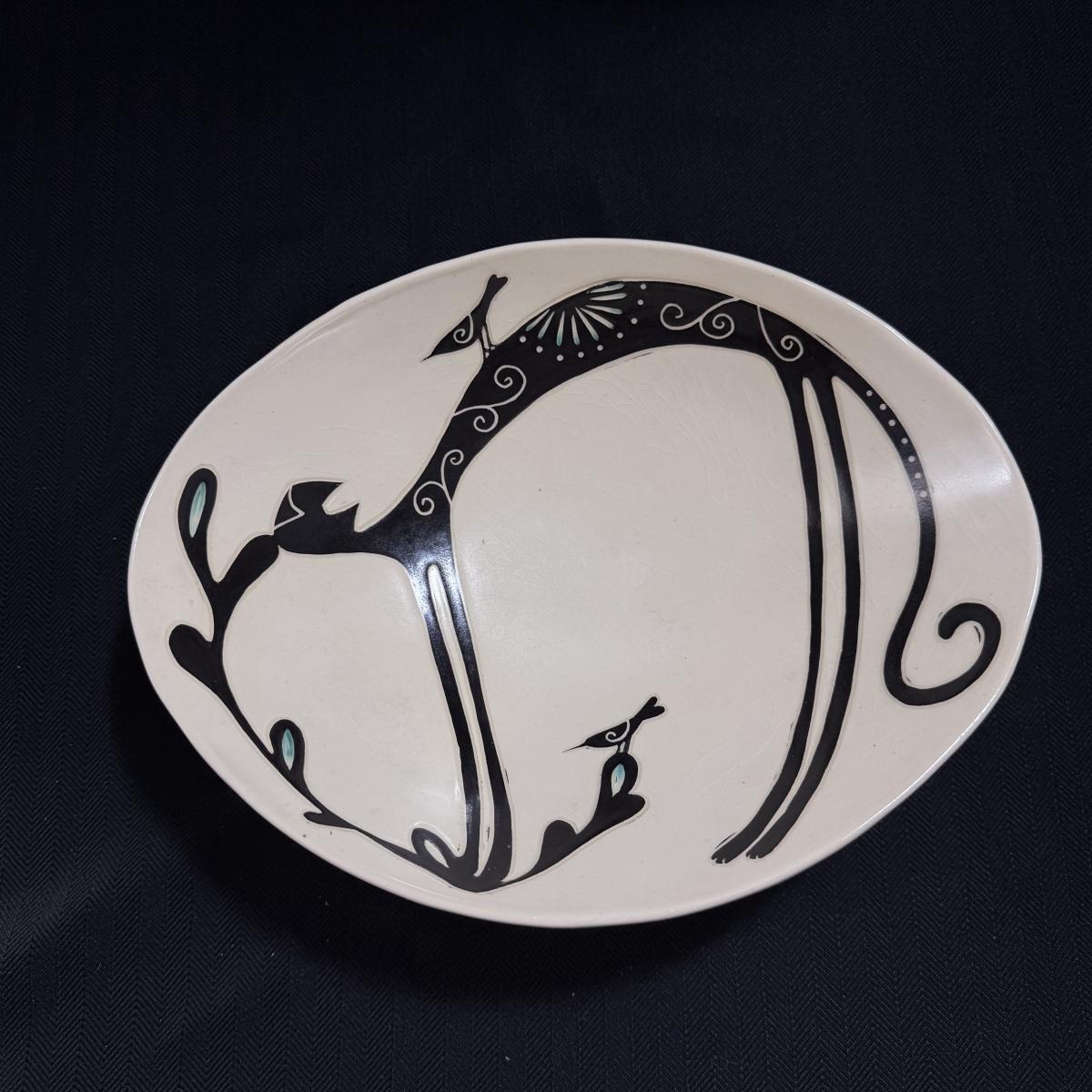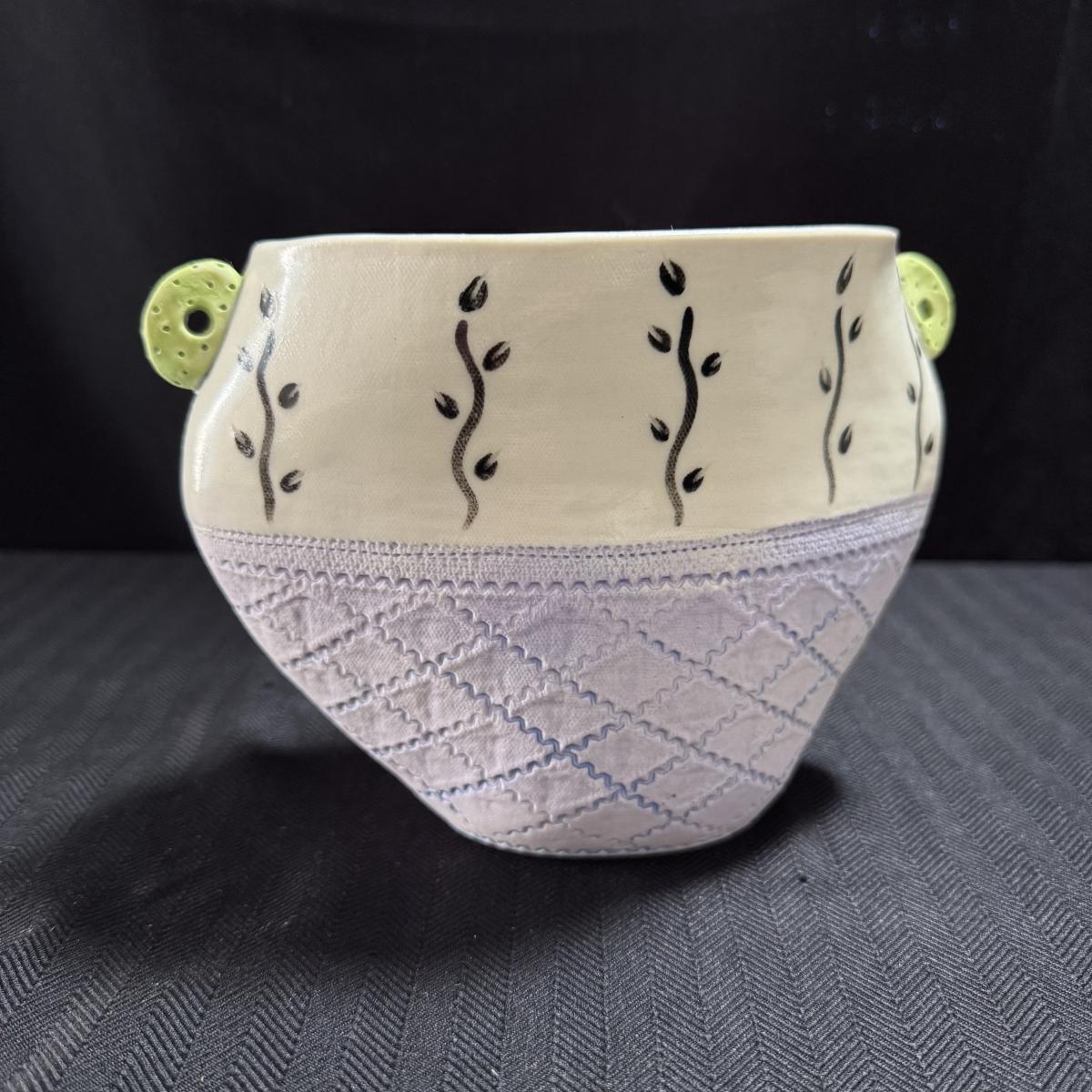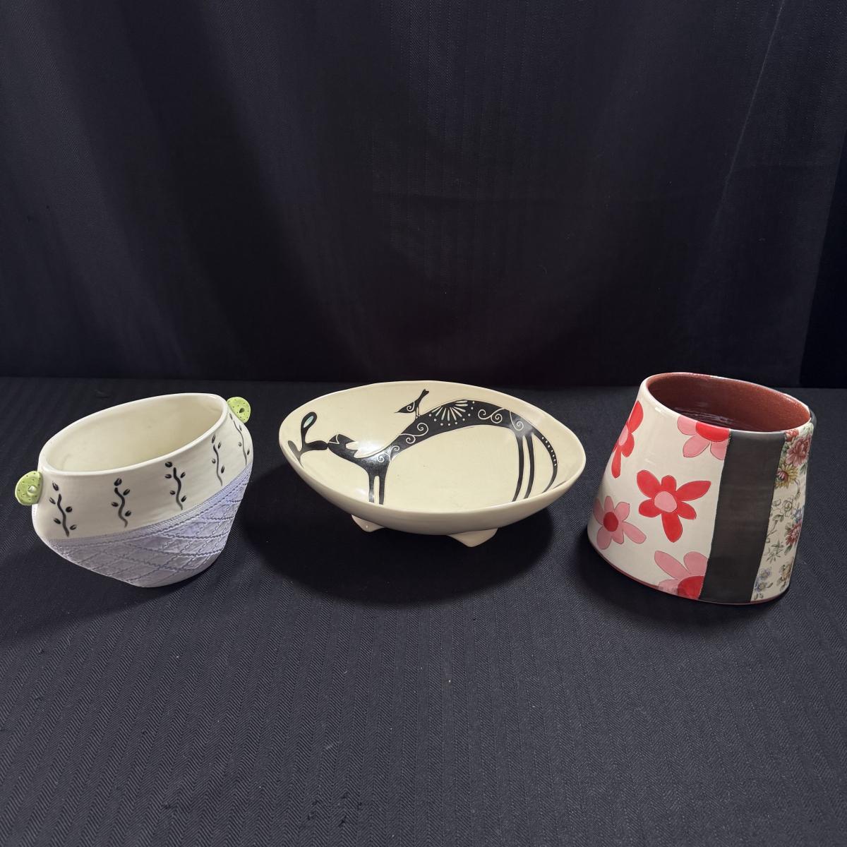 This lot includes one ceramic vase with pink and red flowers and one ceramic bowl with a folk-art-like cat. Lastly, you’ll find one ceramic vase mimicking fabric by local Asheville artist Laura Peery. It appears to be signed with “Peery” on the bottom. The largest piece is the bowl that measure 10” x 8” x 3”H. Shipping available.