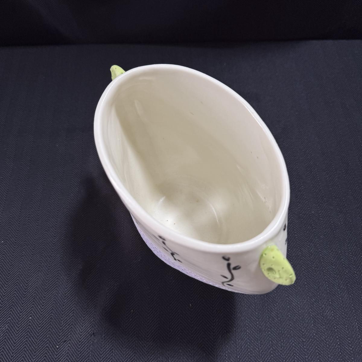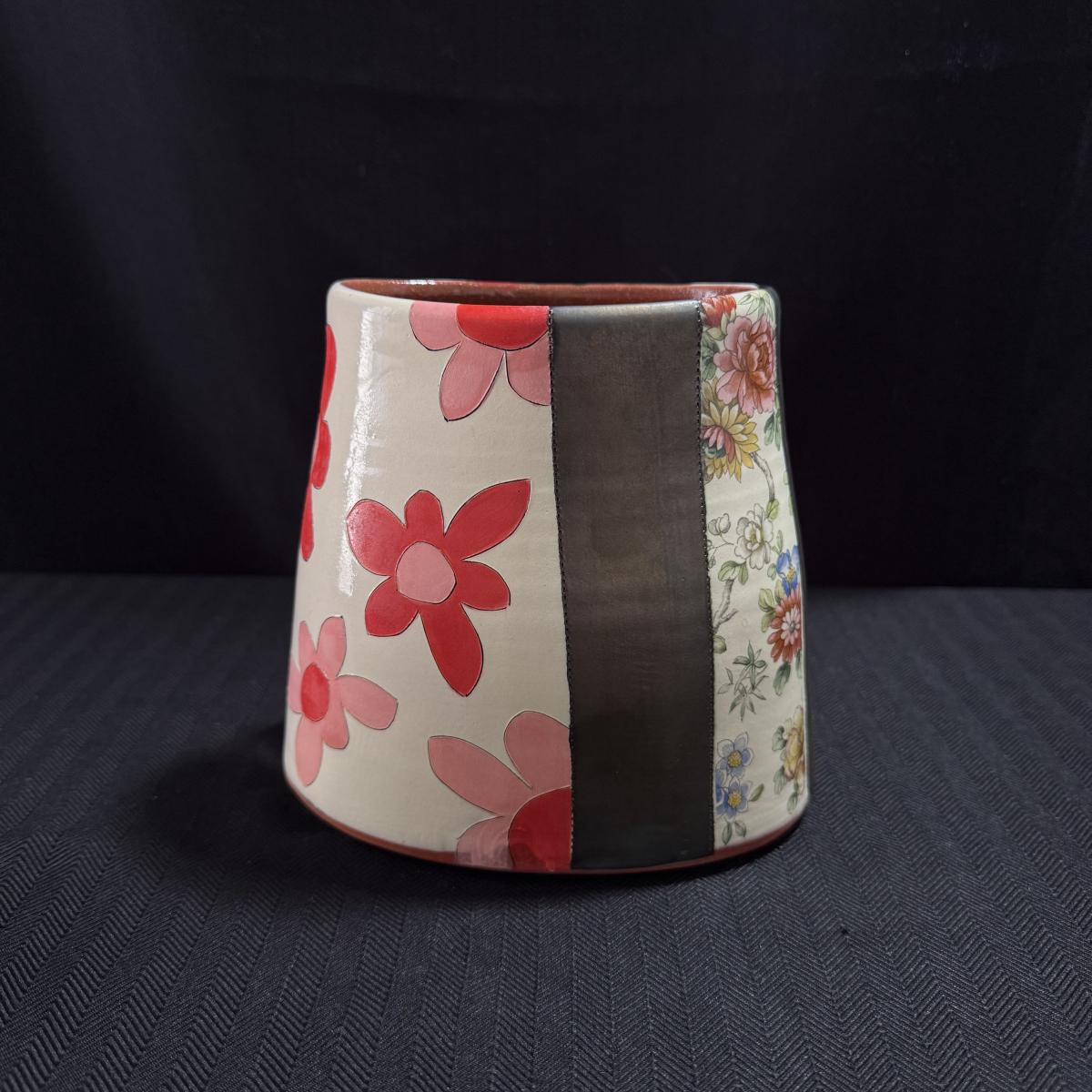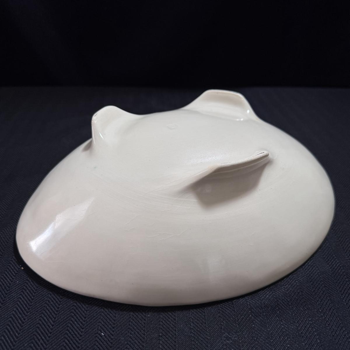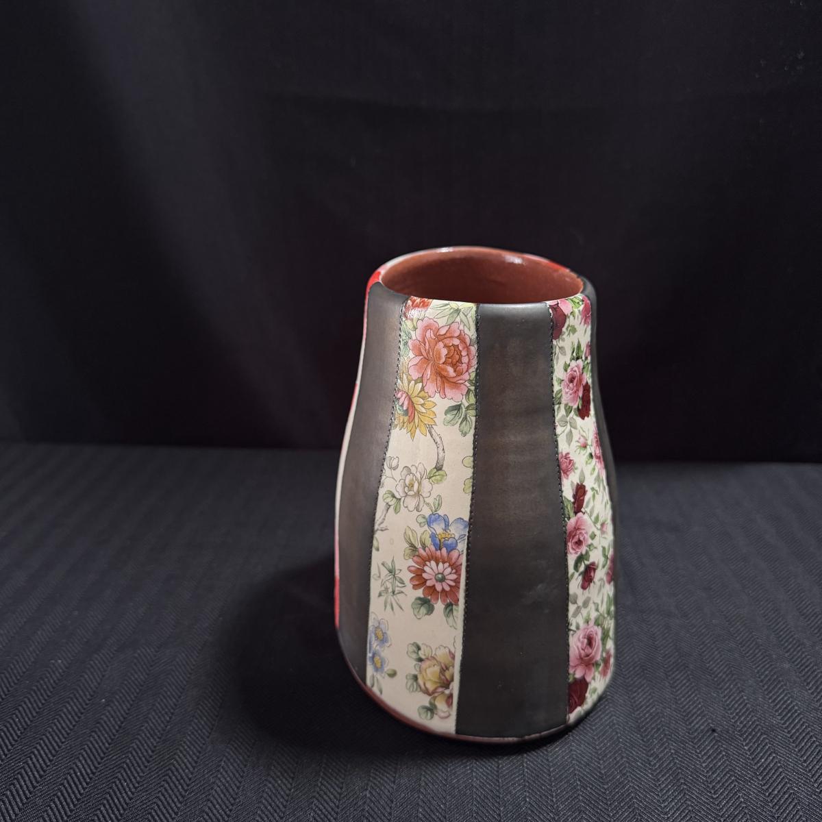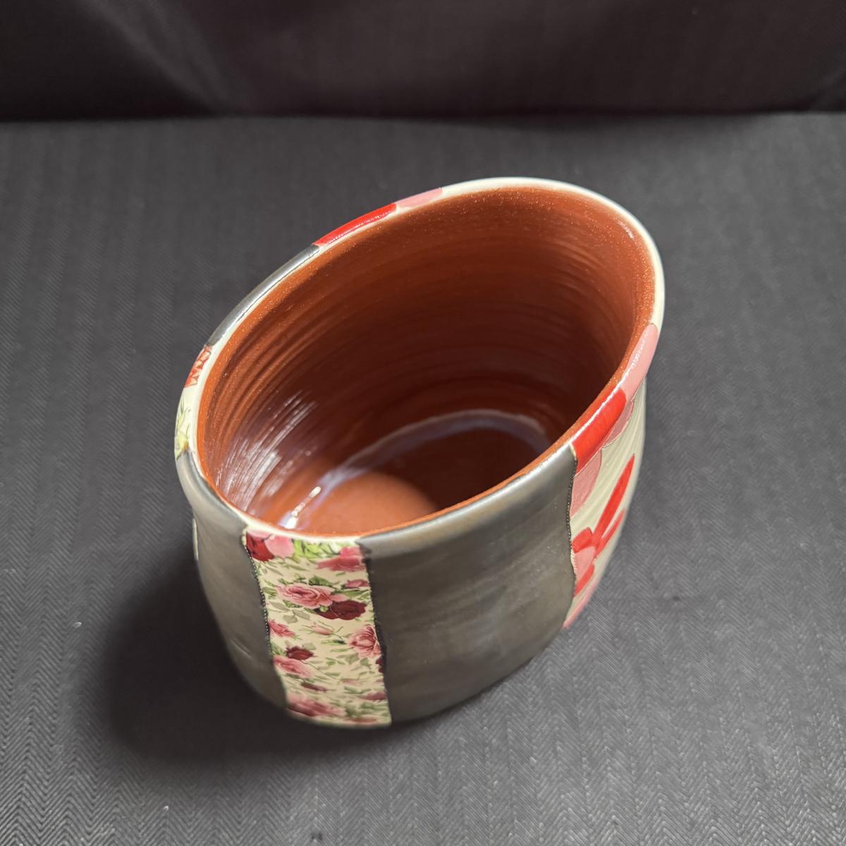 This lot includes one ceramic vase with pink and red flowers and one ceramic bowl with a folk-art-like cat. Lastly, you’ll find one ceramic vase mimicking fabric by local Asheville artist Laura Peery. It appears to be signed with “Peery” on the bottom. The largest piece is the bowl that measure 10” x 8” x 3”H. Shipping available.