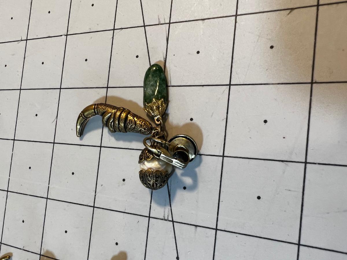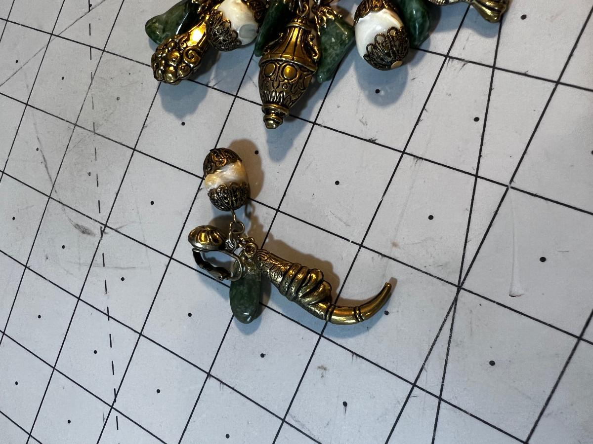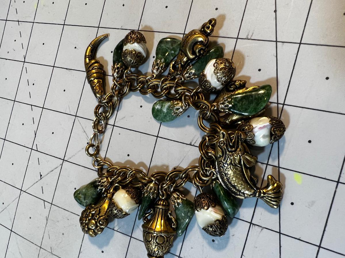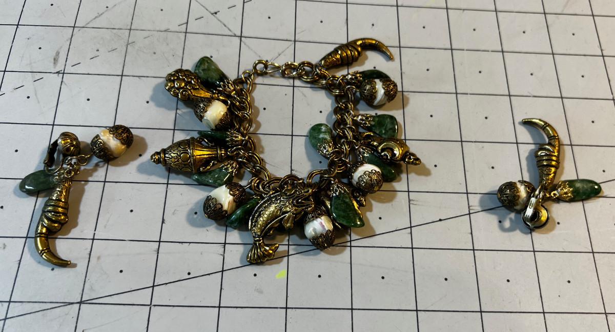 UNIQUE! Charm Bracelet and Earrings Brass with Green Moss Agate and White Shell Stones.