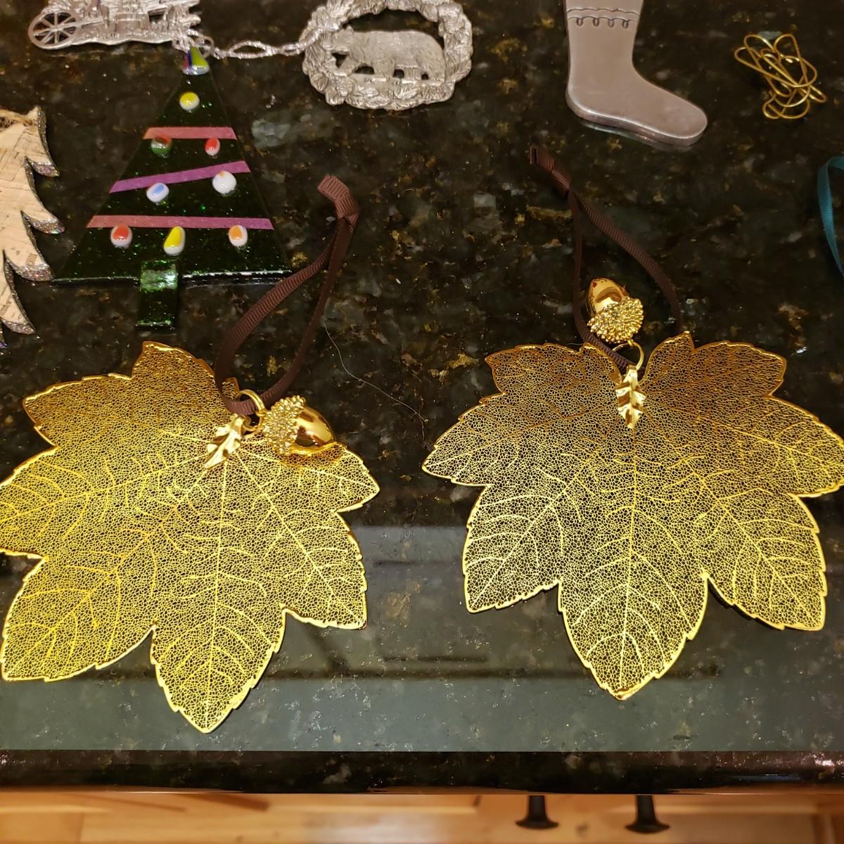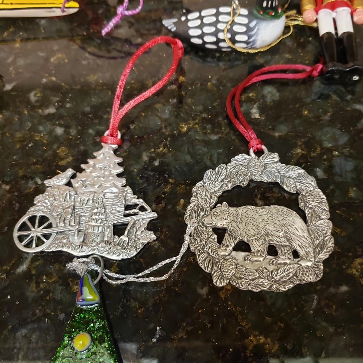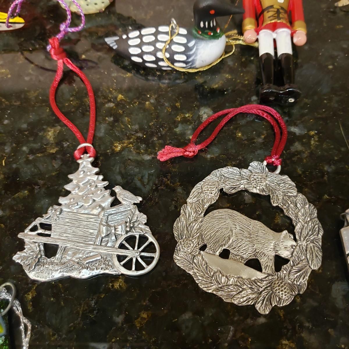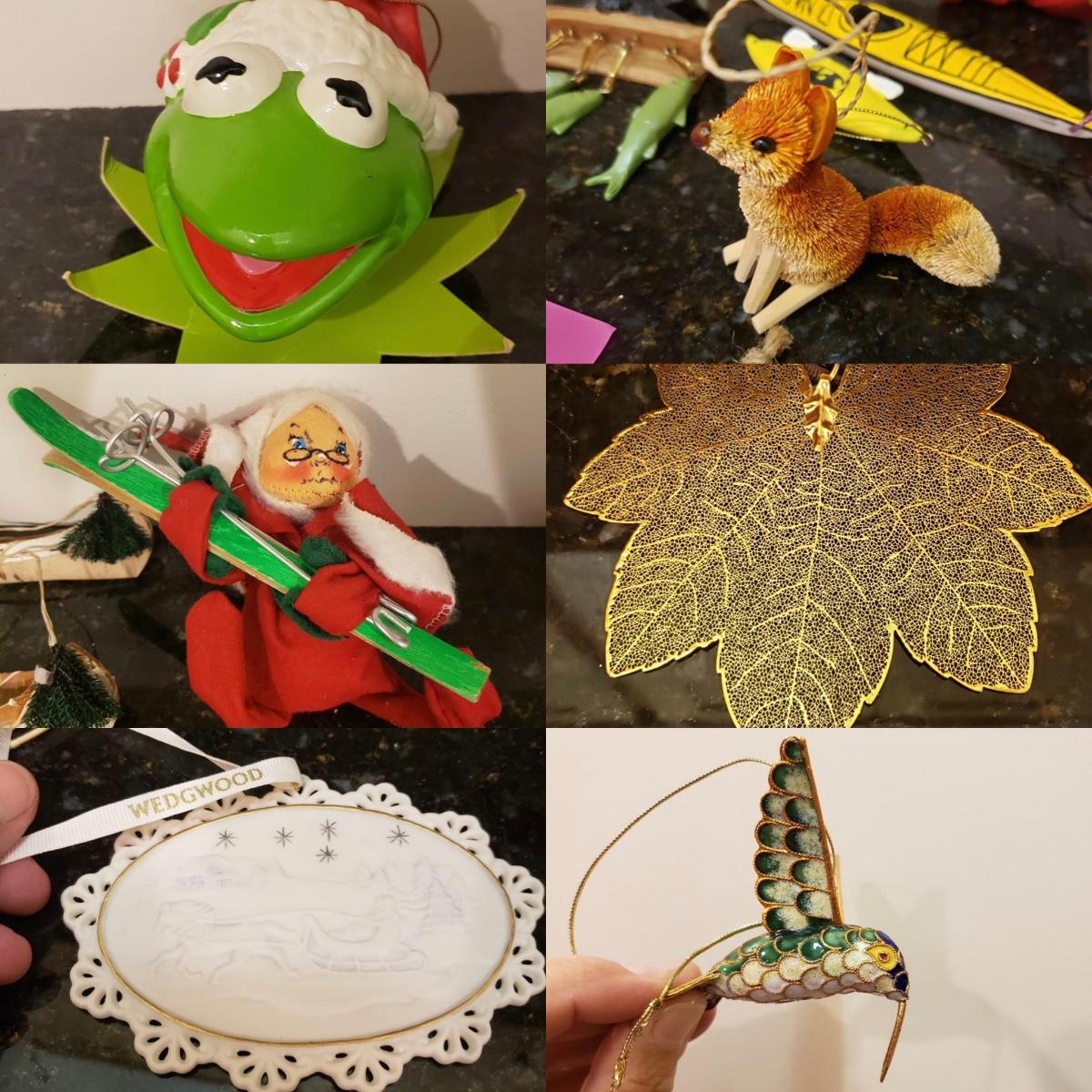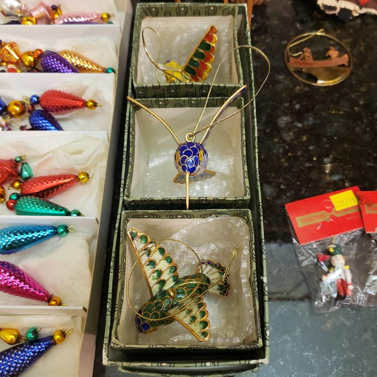 There are some fun and unique ornaments in this lot!! The gold Maple leaves, the Wedgewood porcelain sleigh scene and cloisonné hummingbirds are a highlight. The Reed and Barton sterling bell (2" x 3") has Merry Christmas 1988 engraved on it. See pictures for details.