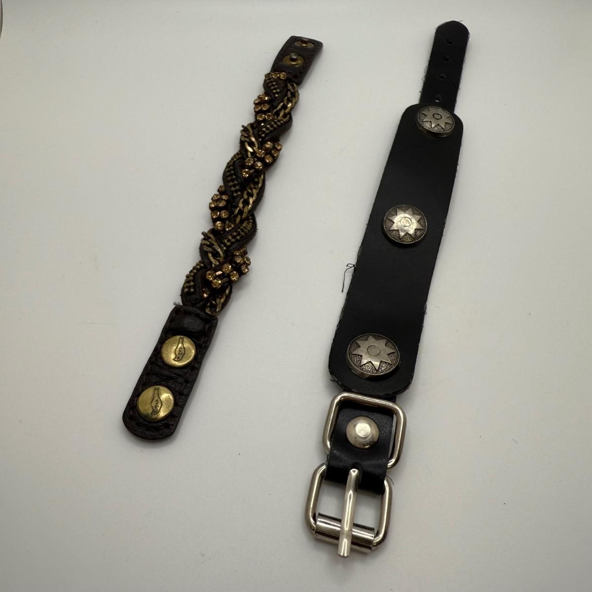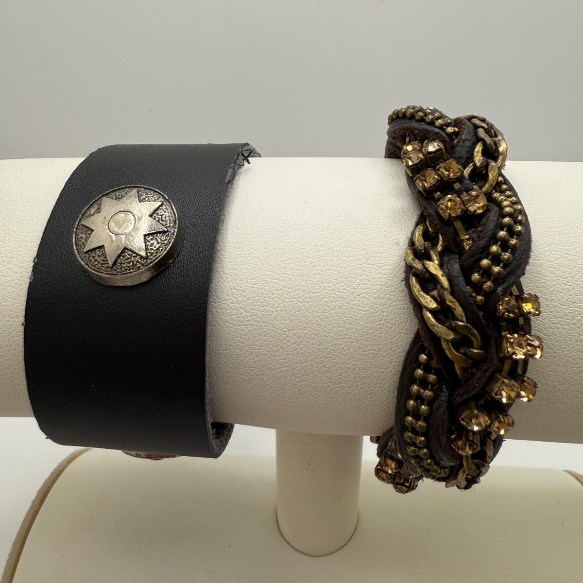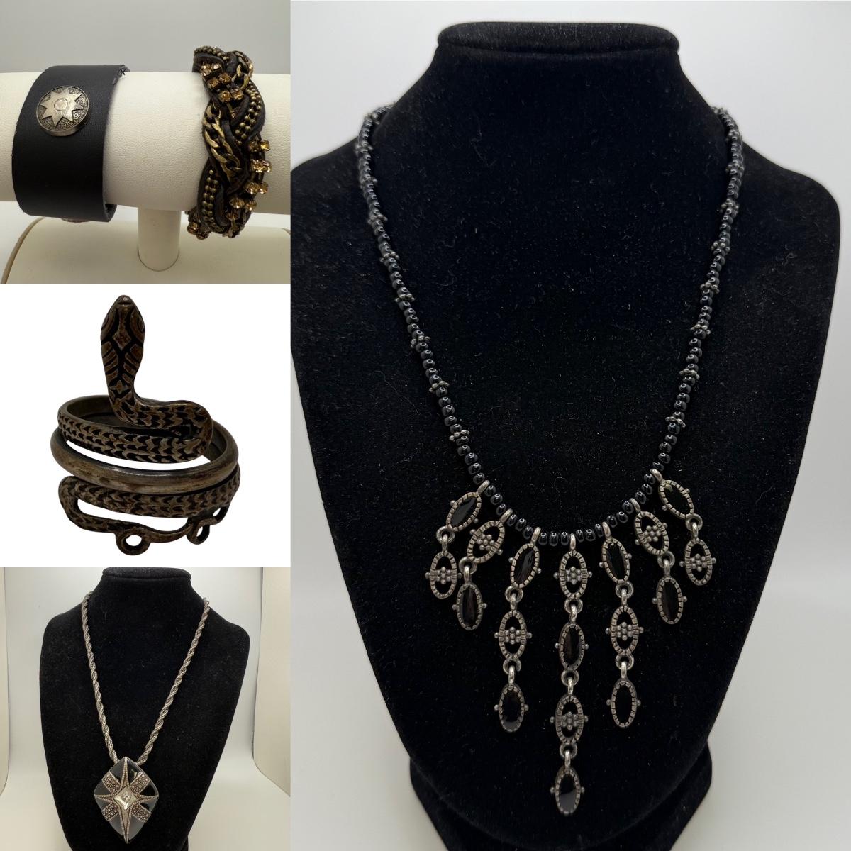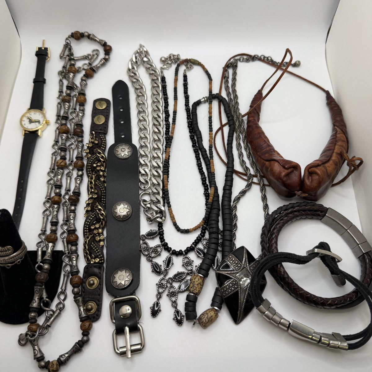 A collection of necklaces and bracelets with a watch and a ring. Items contain mostly leather and metal elements. The snake ring is stamped 925. The black necklace with the dangly pendants is adjustable from 15-18”.