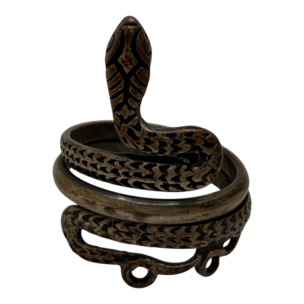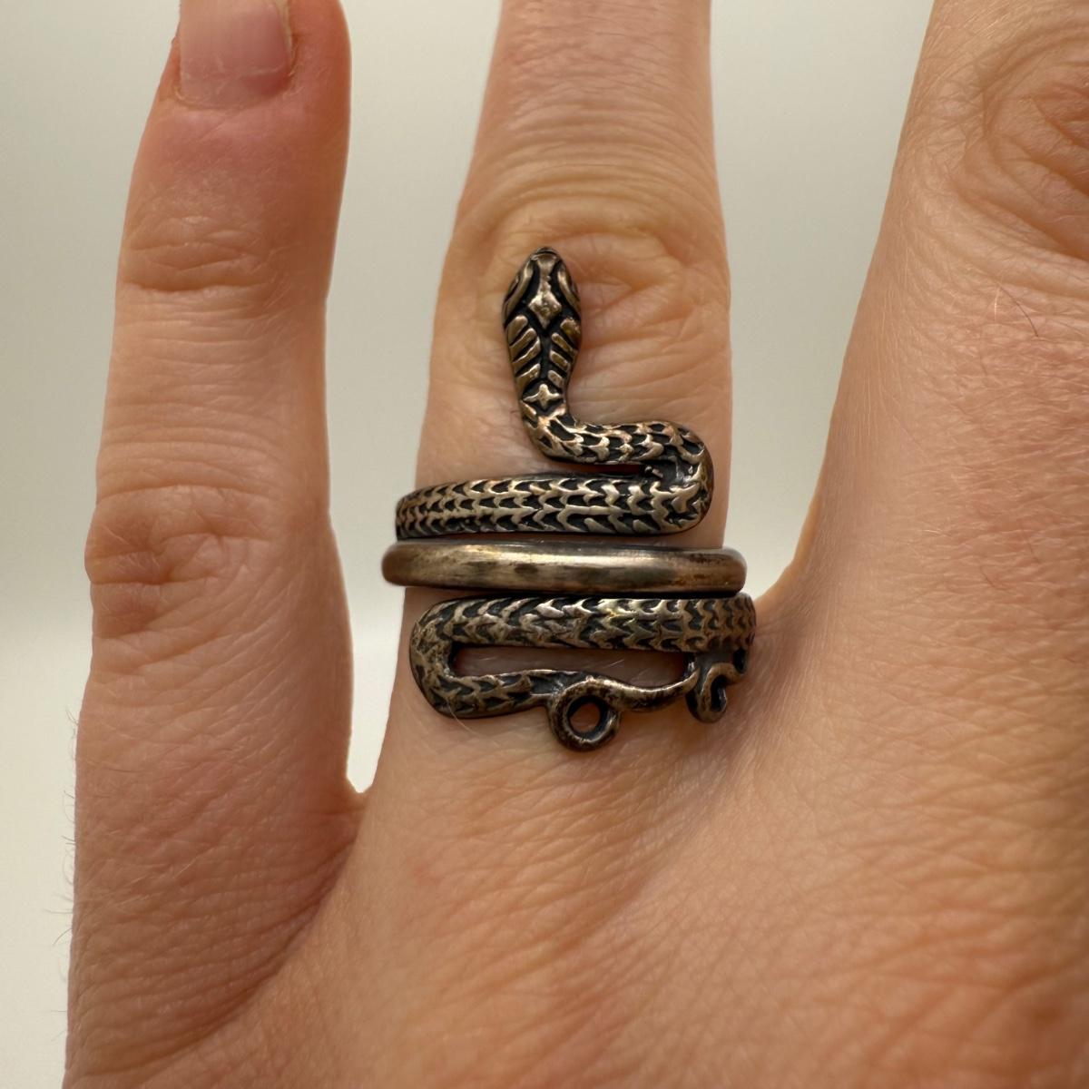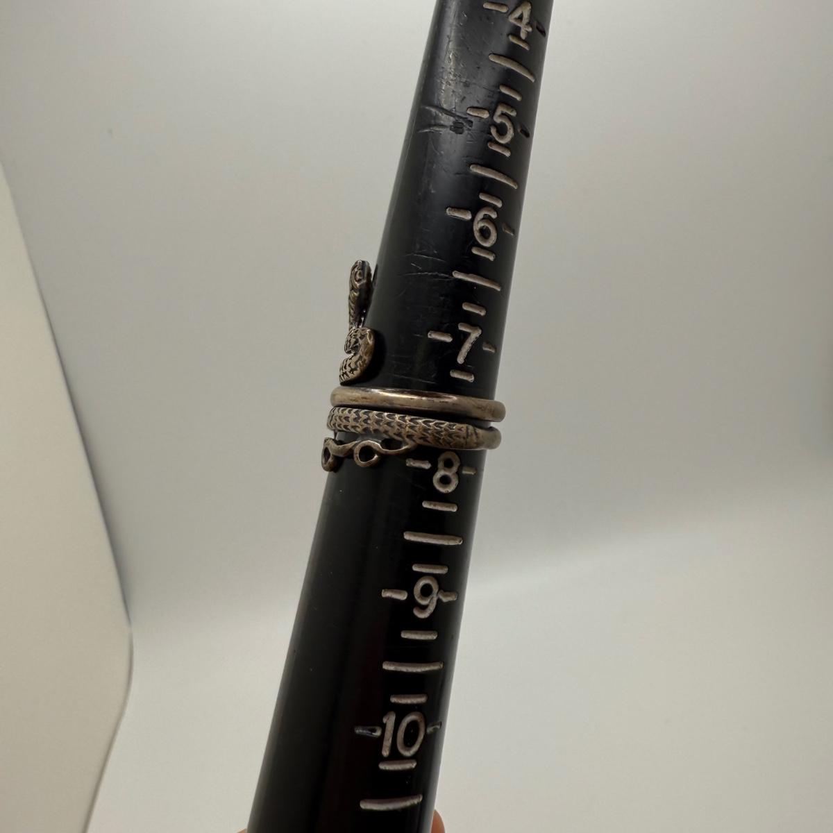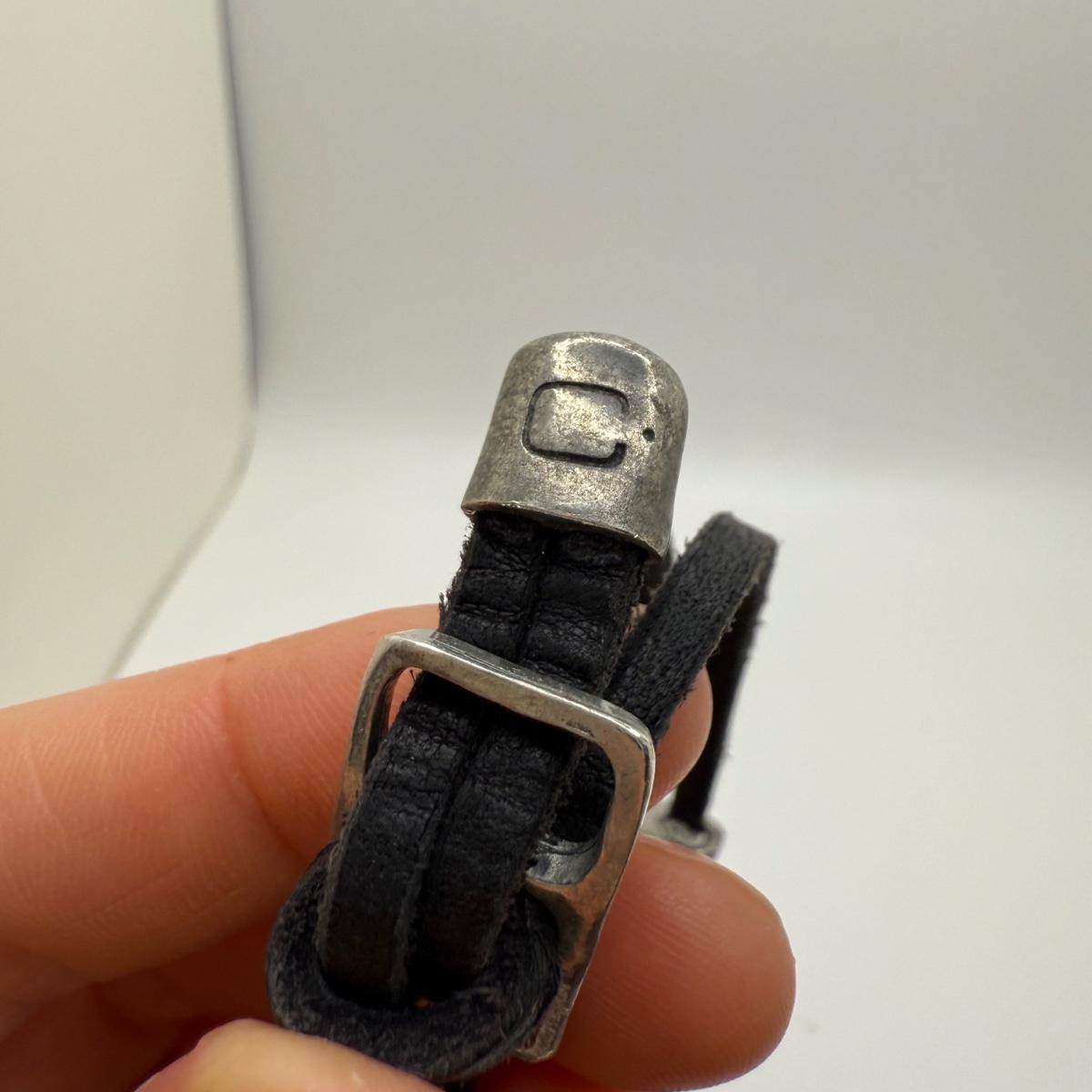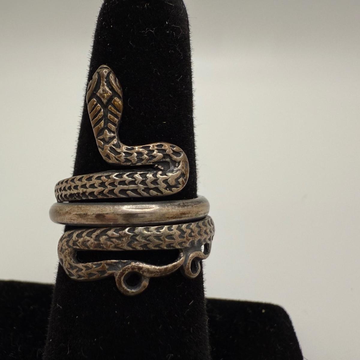 A collection of necklaces and bracelets with a watch and a ring. Items contain mostly leather and metal elements. The snake ring is stamped 925. The black necklace with the dangly pendants is adjustable from 15-18”.