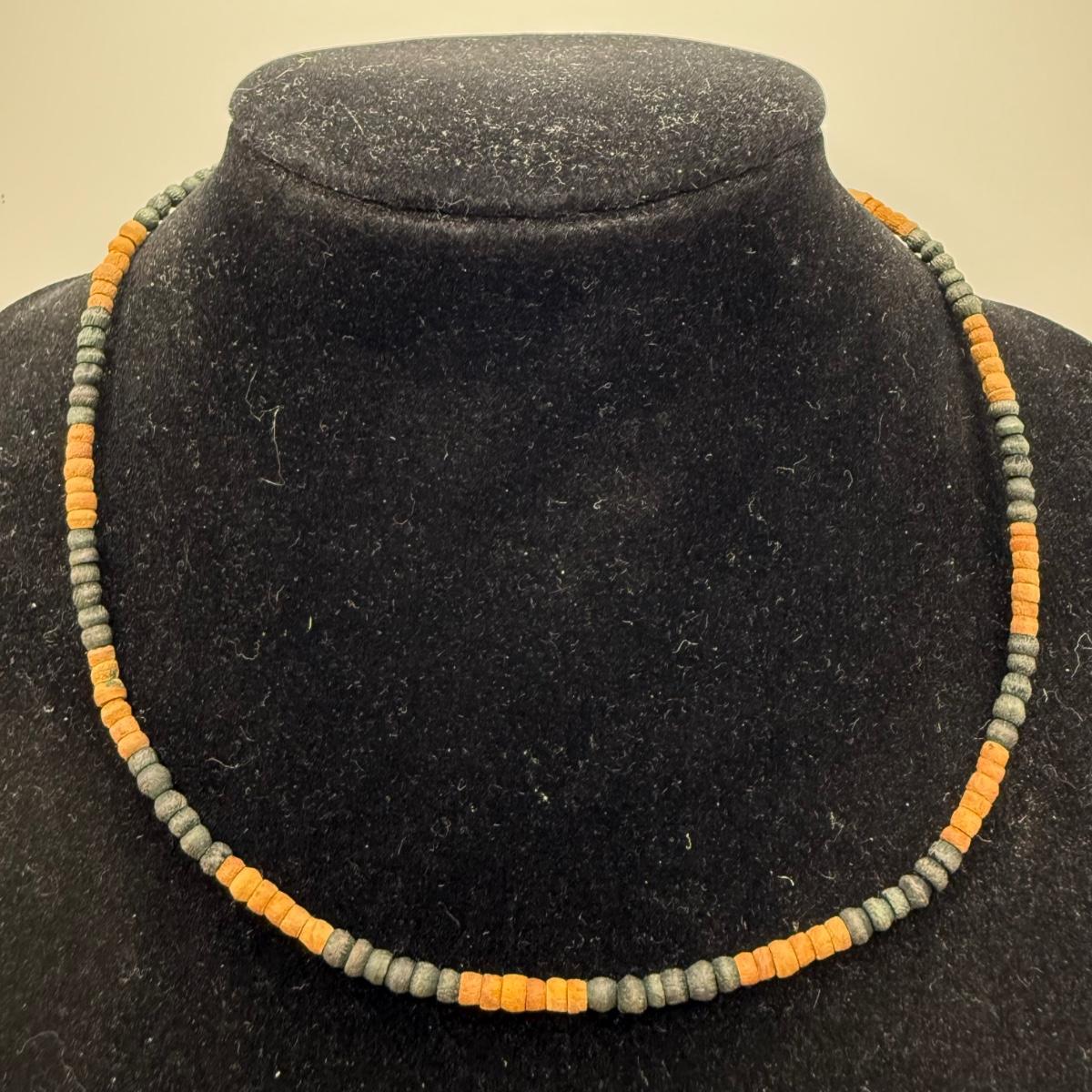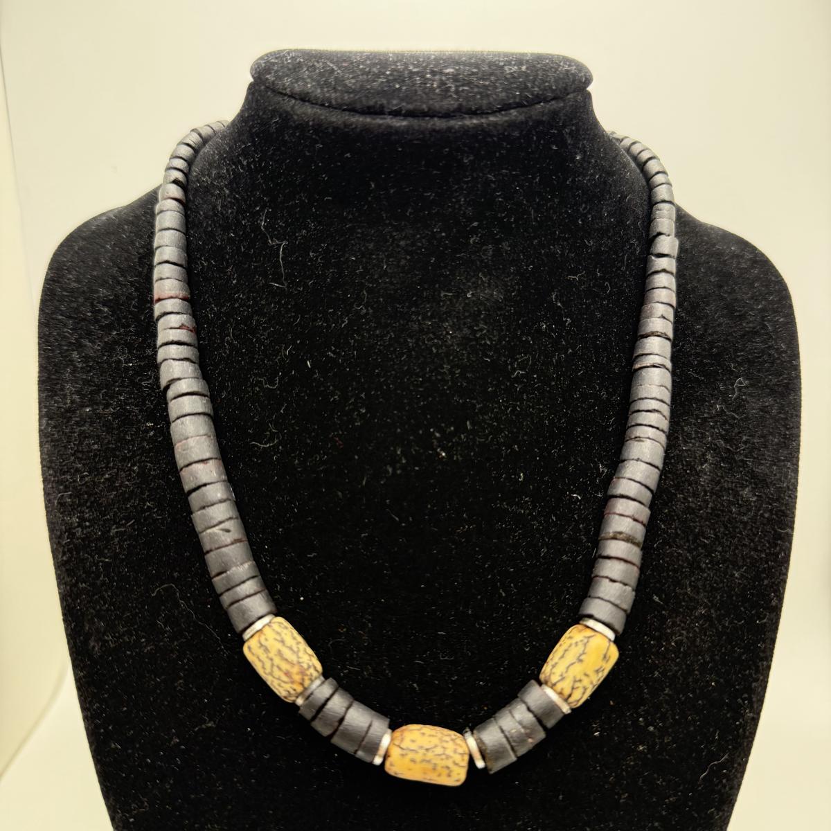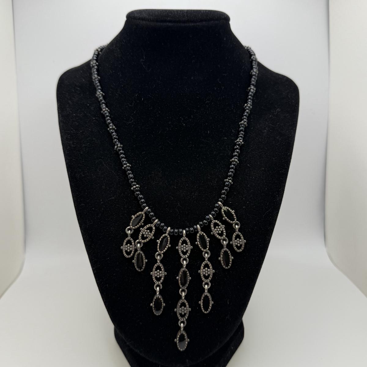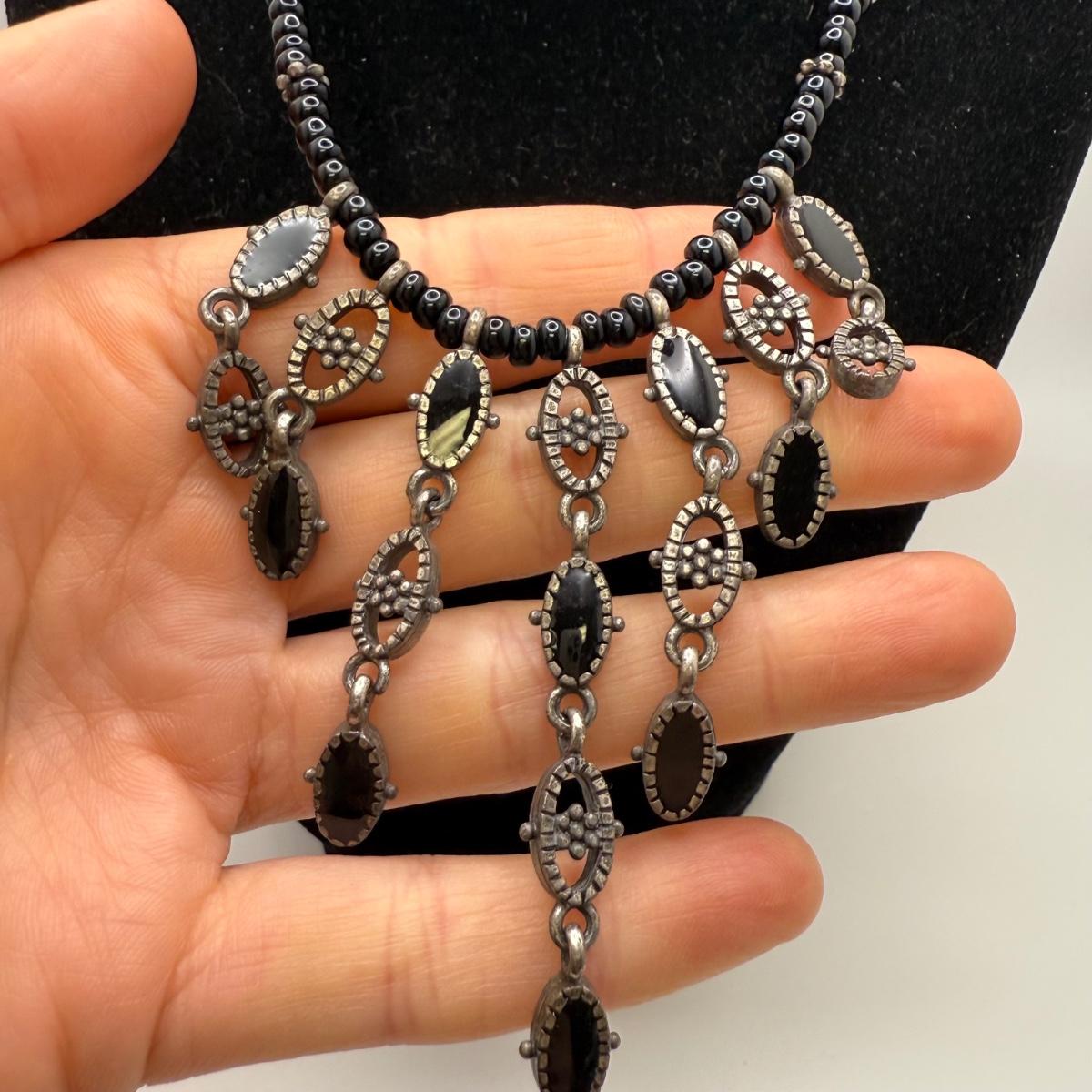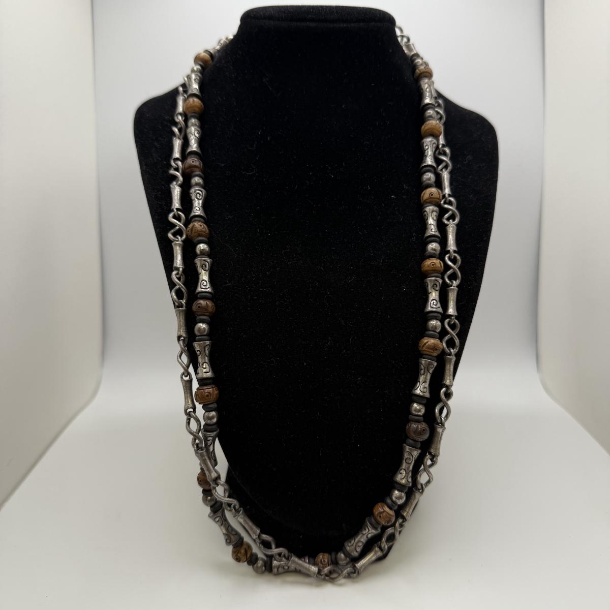 A collection of necklaces and bracelets with a watch and a ring. Items contain mostly leather and metal elements. The snake ring is stamped 925. The black necklace with the dangly pendants is adjustable from 15-18”.