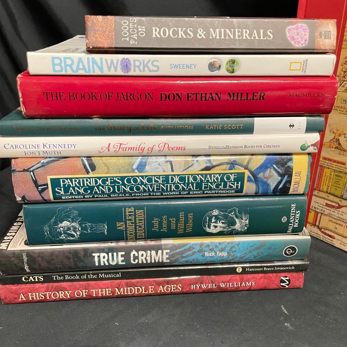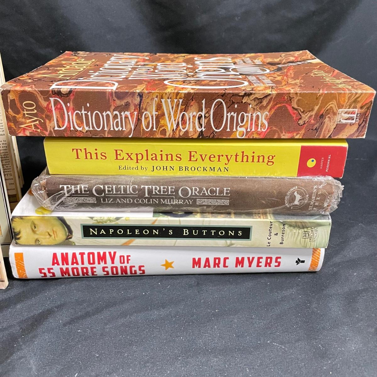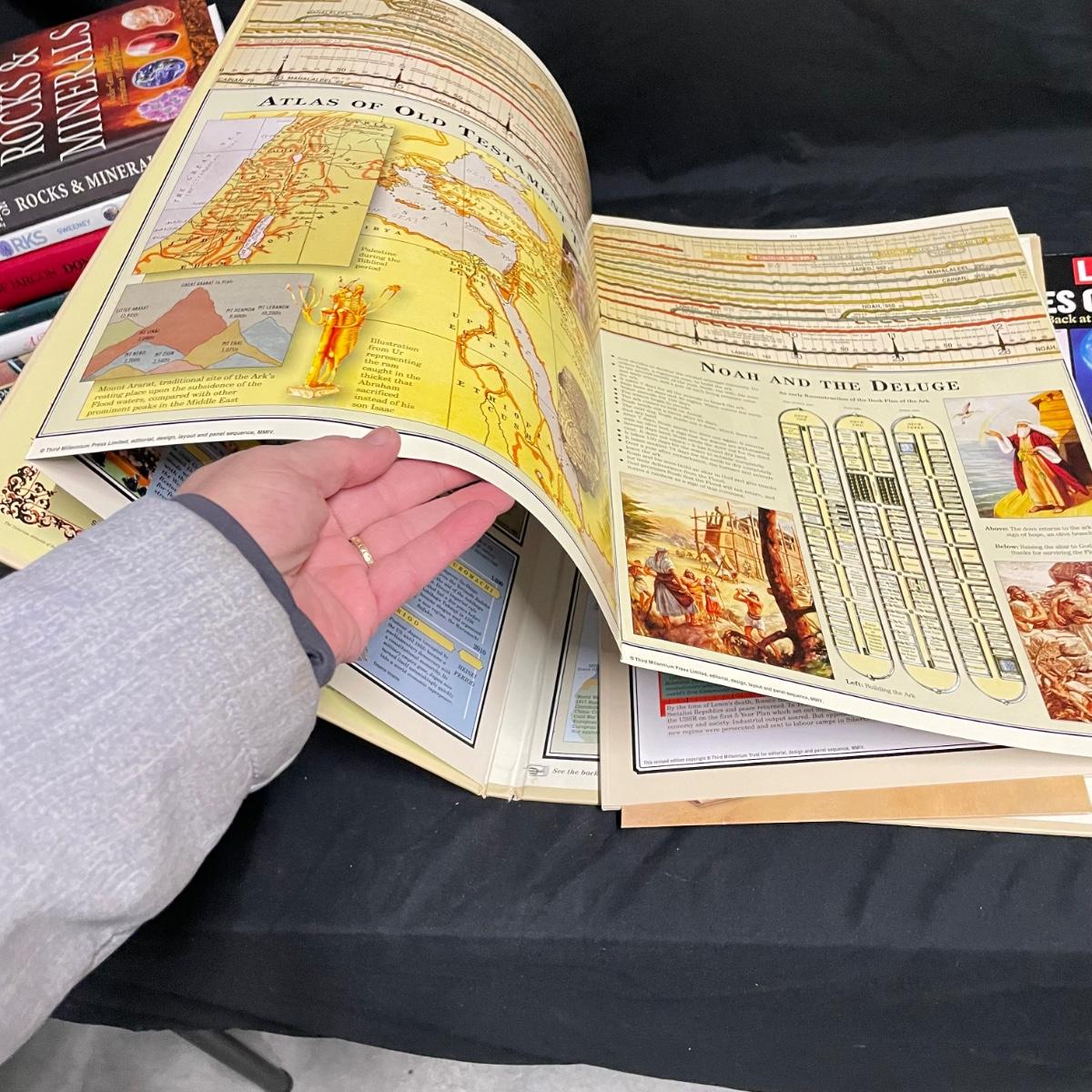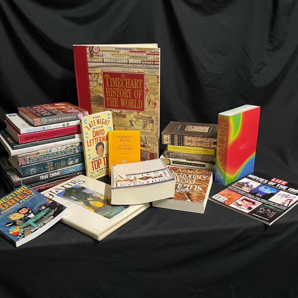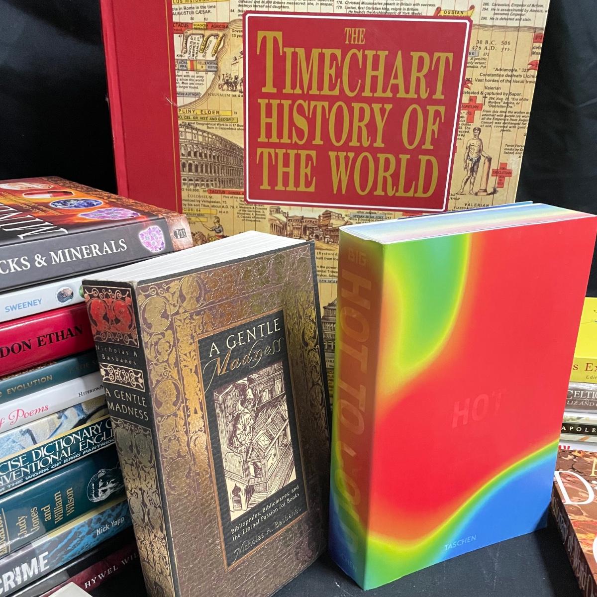 A huge variety of conversation starting books. Lot jumps from an unfolding Timechart History of the World, to an artistic Hot to Cold book of colors then True Crime and A Gentle Madness. The Timechart book is 12.5” x 17.75”. This lot is sure to hold interest and add some trivia wins to your team. See images. Shipping available.