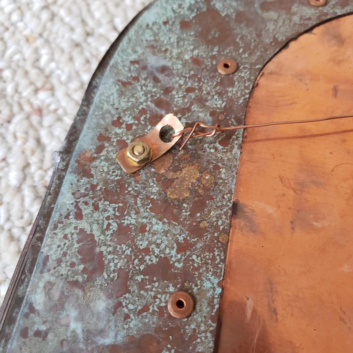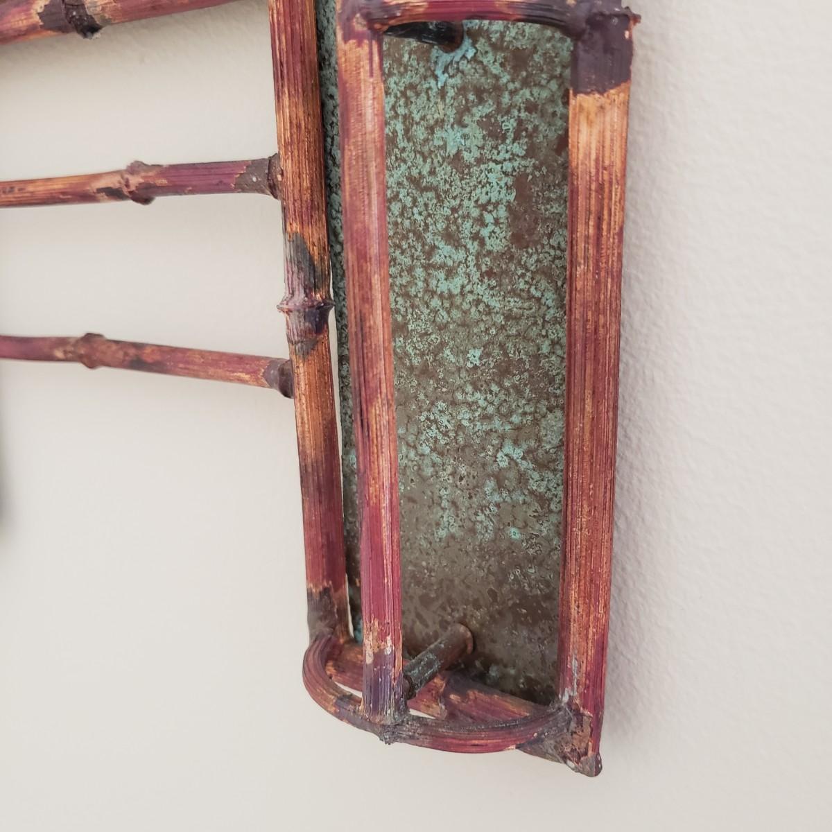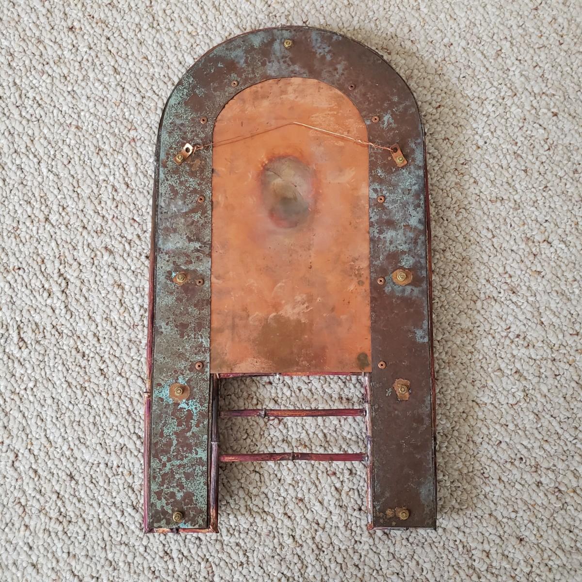 This unique piece appears to be a copper etching portrait. The portrait has a raised feel to it. The piece measures 10" x 18". The piping in the front looks like bamboo but it is metal. This piece has hardware for hanging.