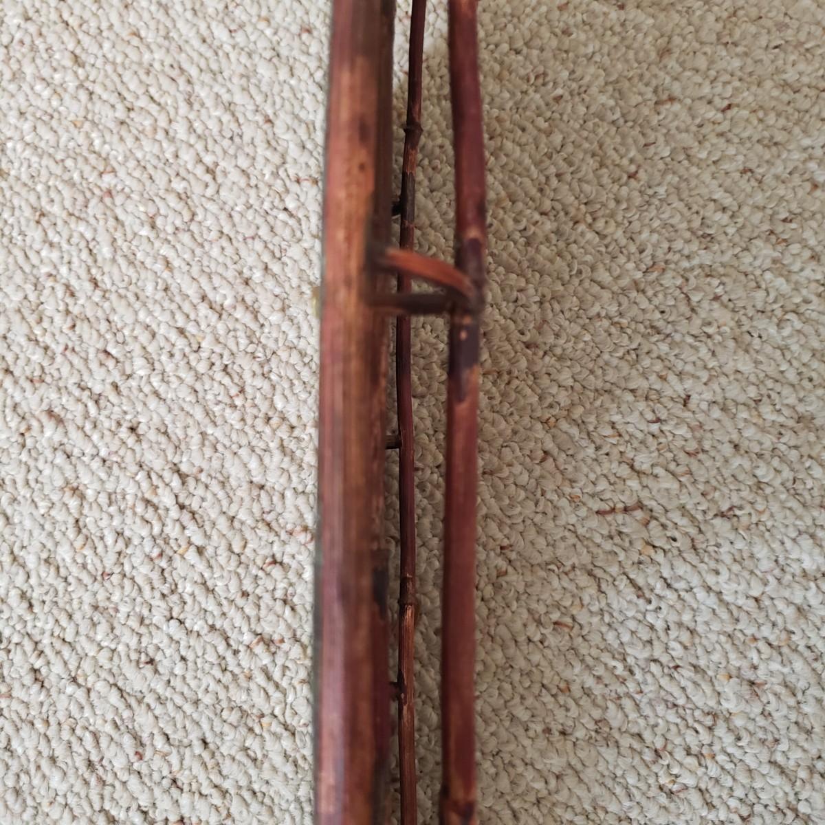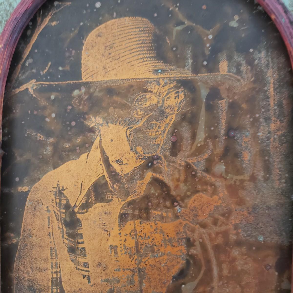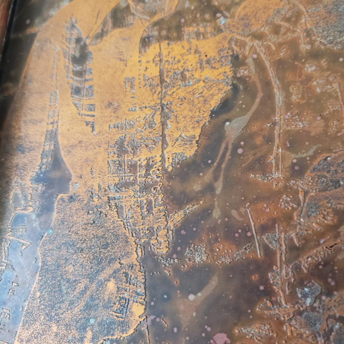 This unique piece appears to be a copper etching portrait. The portrait has a raised feel to it. The piece measures 10" x 18". The piping in the front looks like bamboo but it is metal. This piece has hardware for hanging.