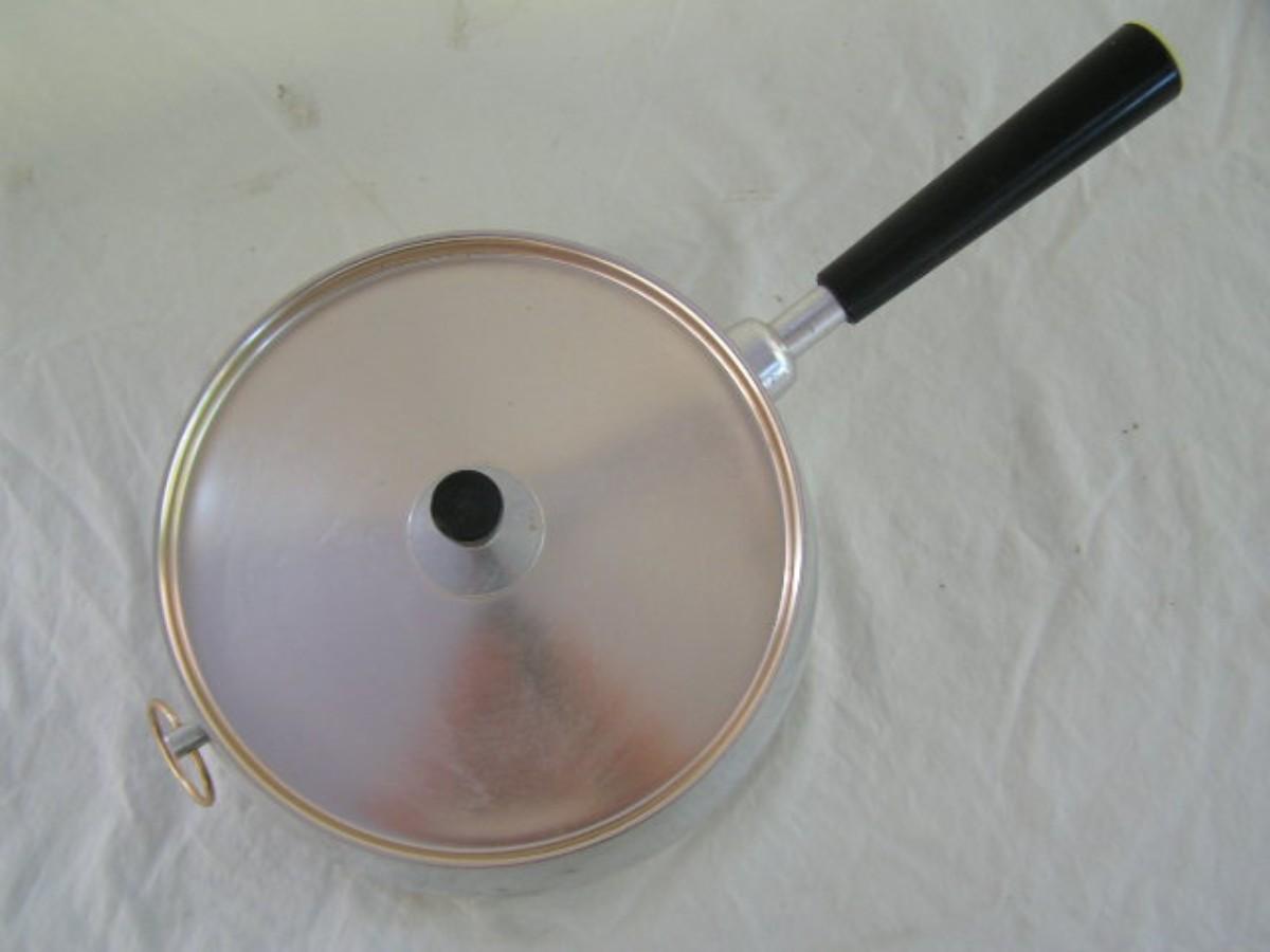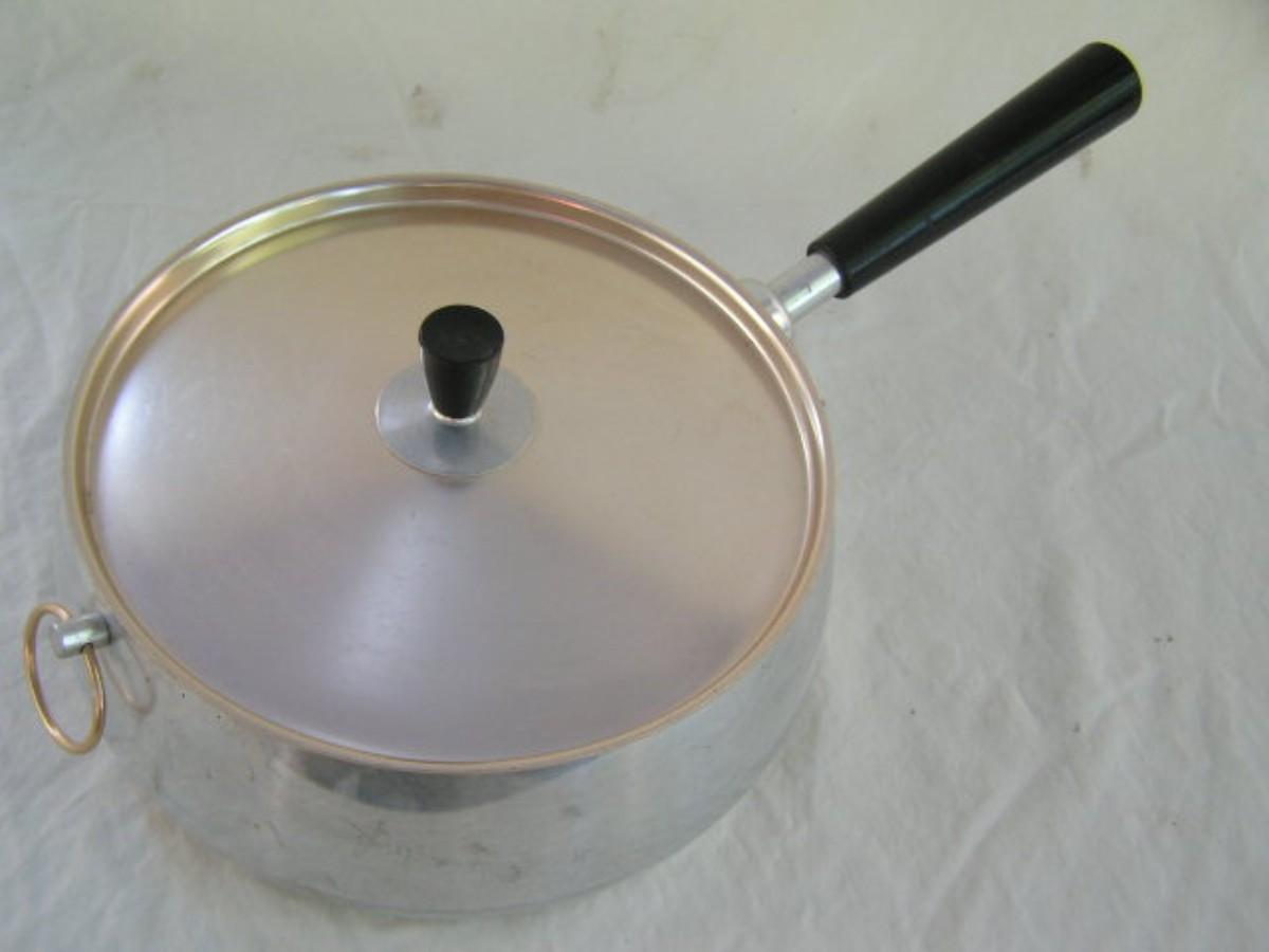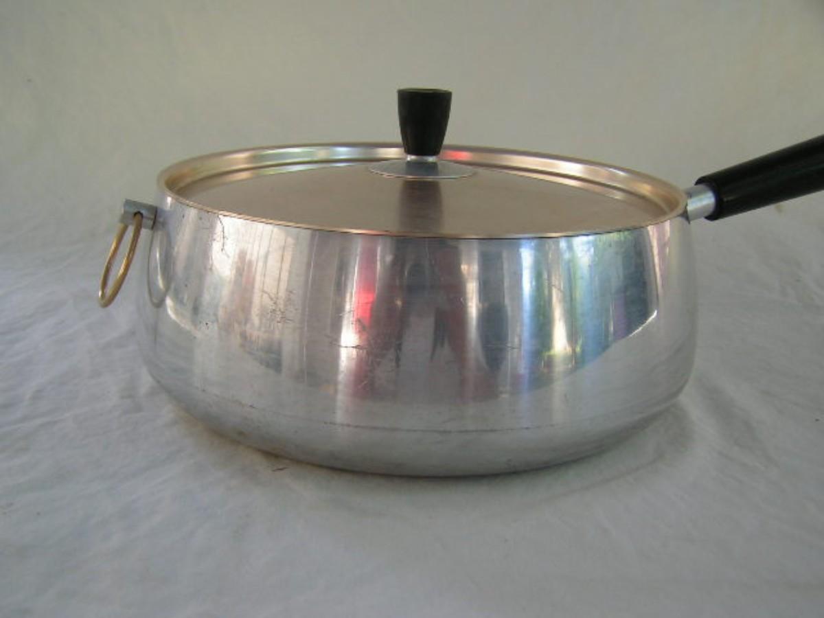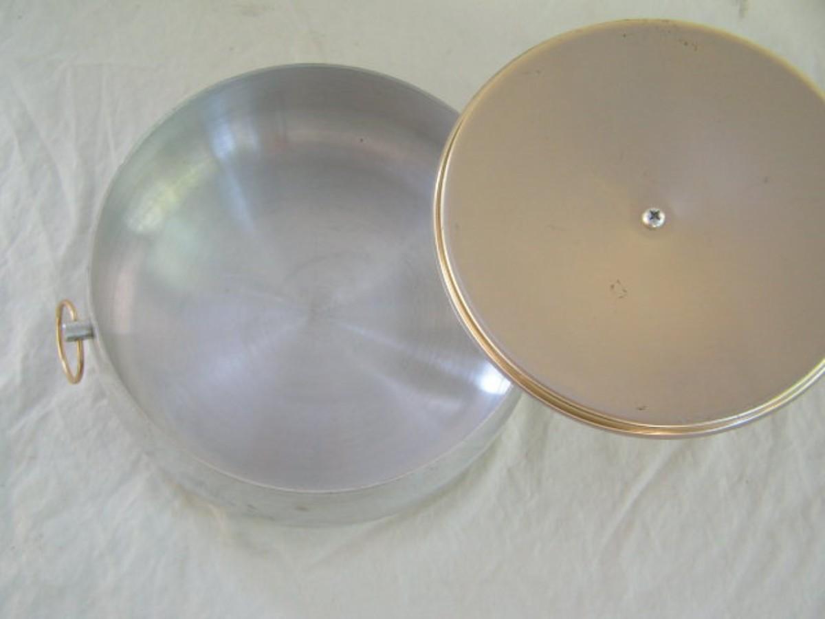 More amazing items like this elsewhere in this sale. UNIQUE covered pan w/fitted lid. About 8-1/2" dia. @ the lip & 3-1/2" deep. Shiny bright inside!
