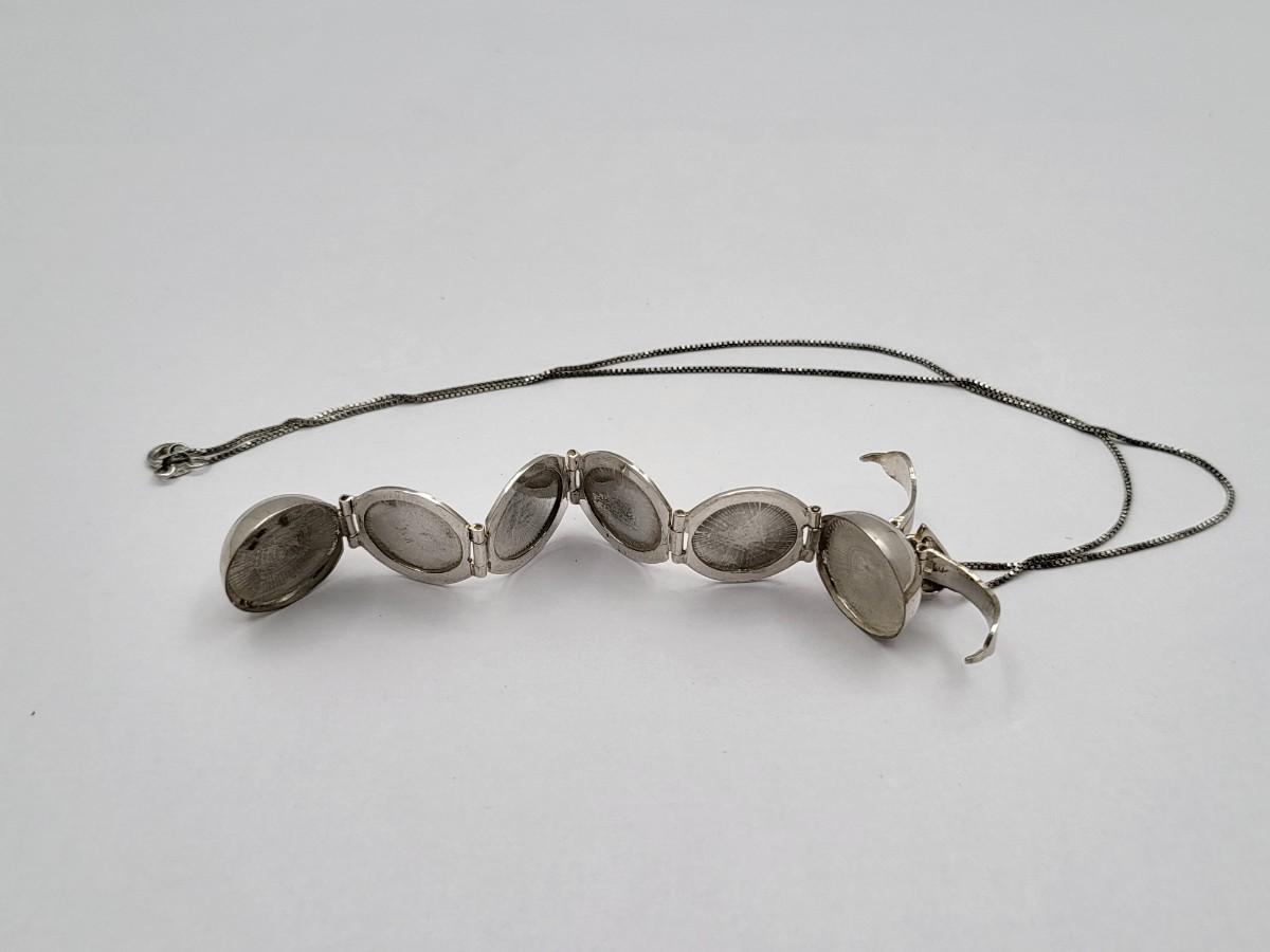 Keep your loved ones close at heart with this photo frame locket. Ball/orb pendant, opens to four hinged panels, accordian style to hold four photo inserts. Closes up to an elegant pendant with a decorative secure closure. Pendant and 18" chain are sterling silver. Weighs 13.9gr