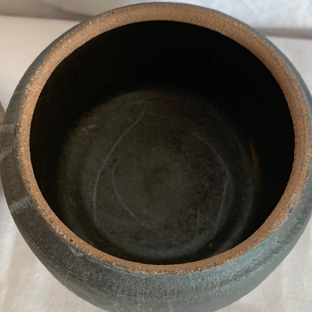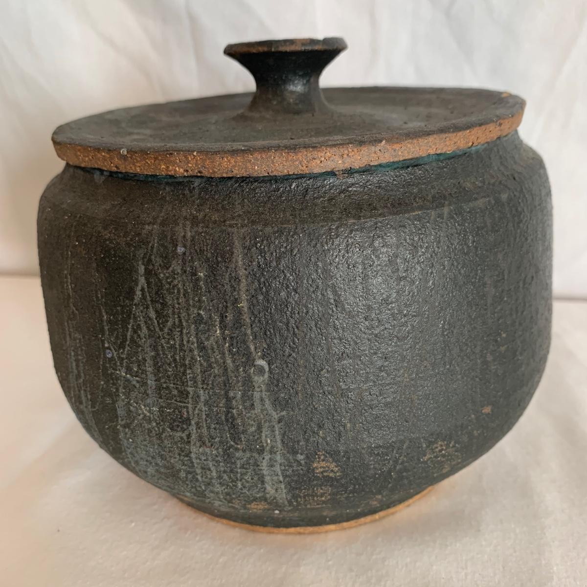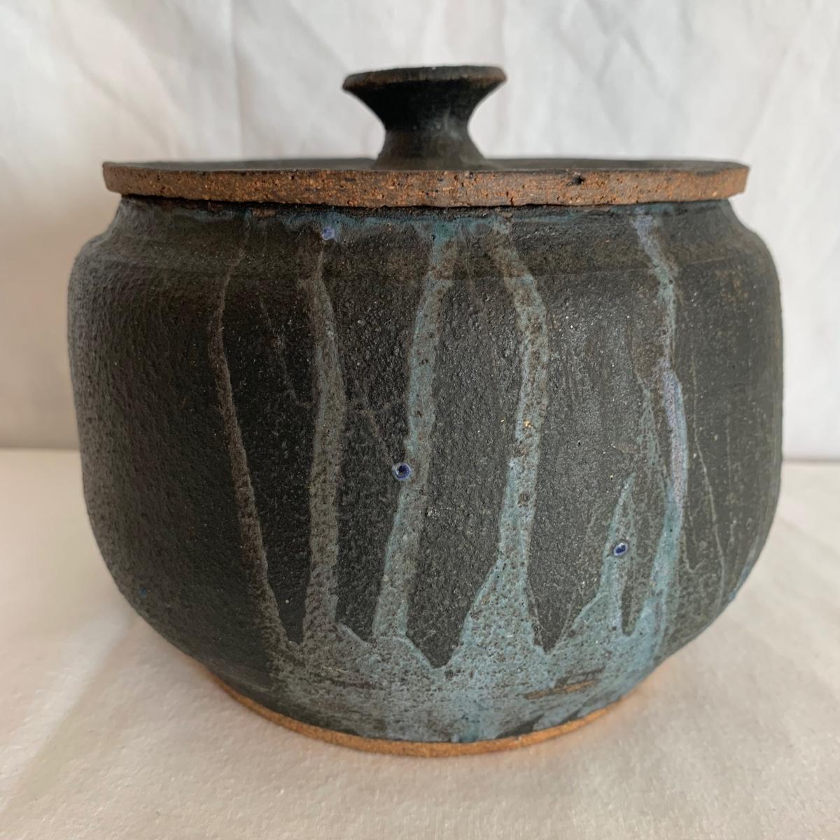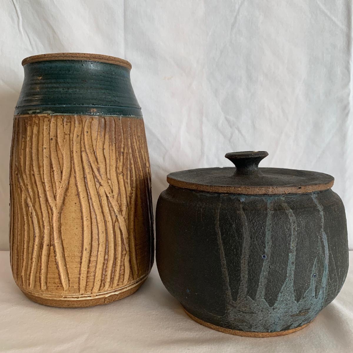 Two unique earth-toned pottery vessels. The tan vase with teal glaze measures approximately 6”D x 9.5”H. It has a pottery mark on the bottom edge. The lidded vessel has a black glaze with hints of blue. It has a chip on the lid rim and on the lid handle, see photos.