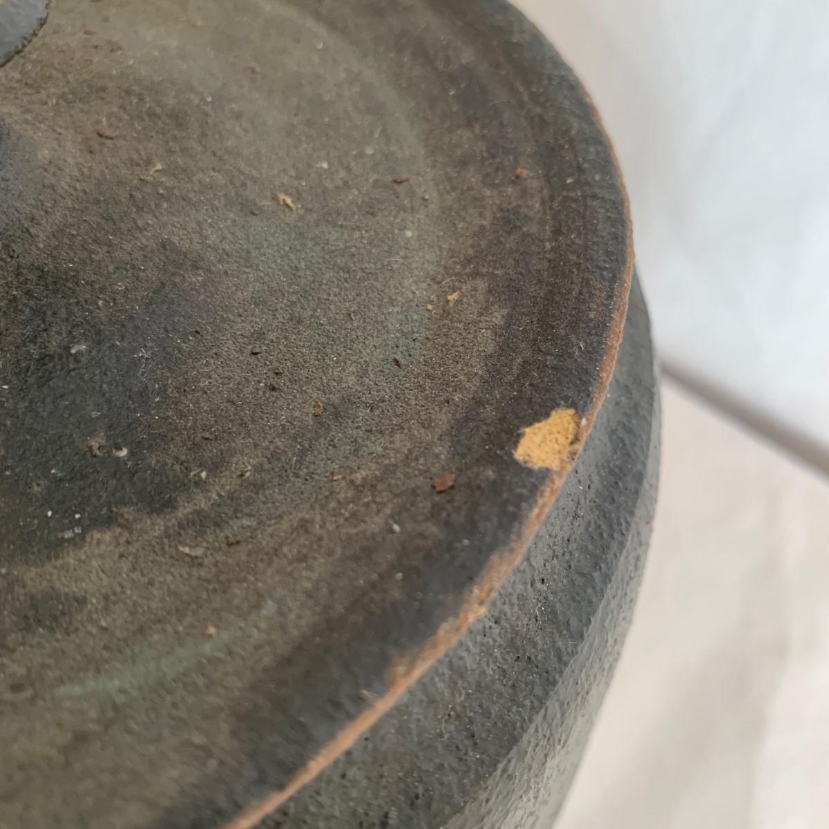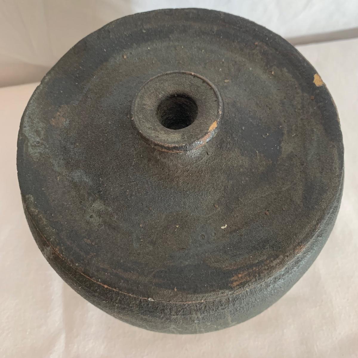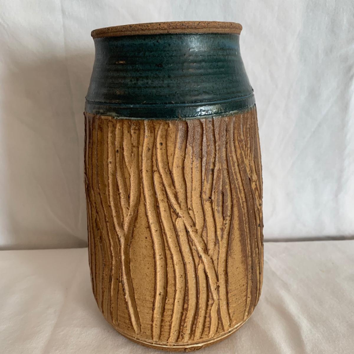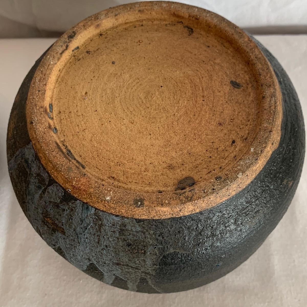 Two unique earth-toned pottery vessels. The tan vase with teal glaze measures approximately 6”D x 9.5”H. It has a pottery mark on the bottom edge. The lidded vessel has a black glaze with hints of blue. It has a chip on the lid rim and on the lid handle, see photos.