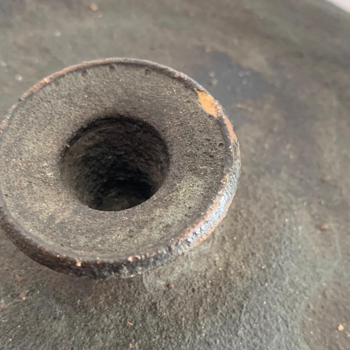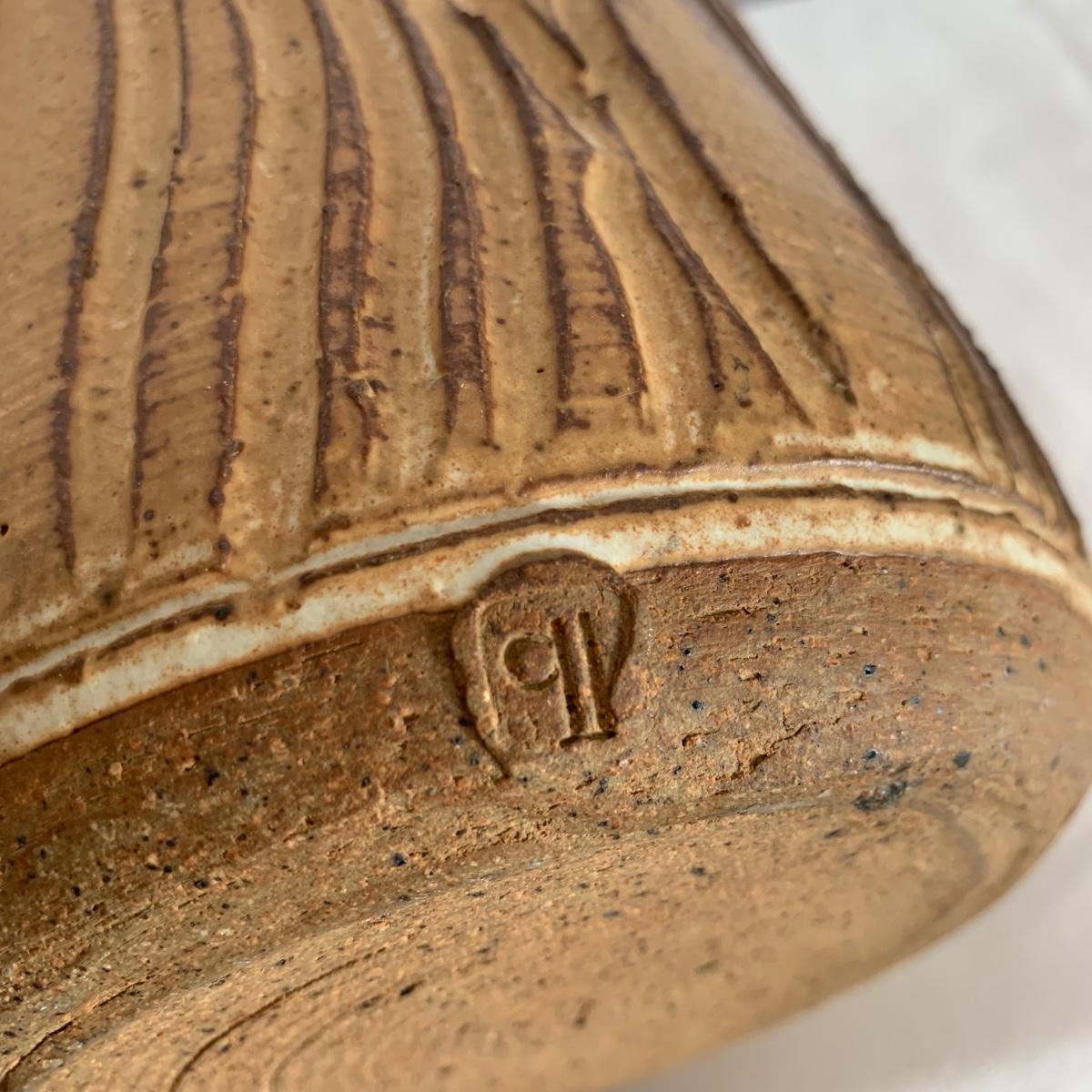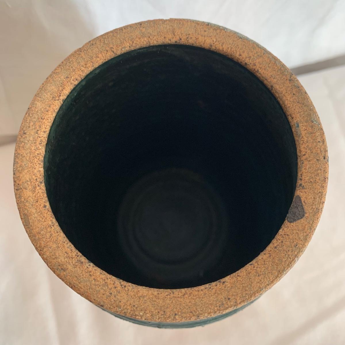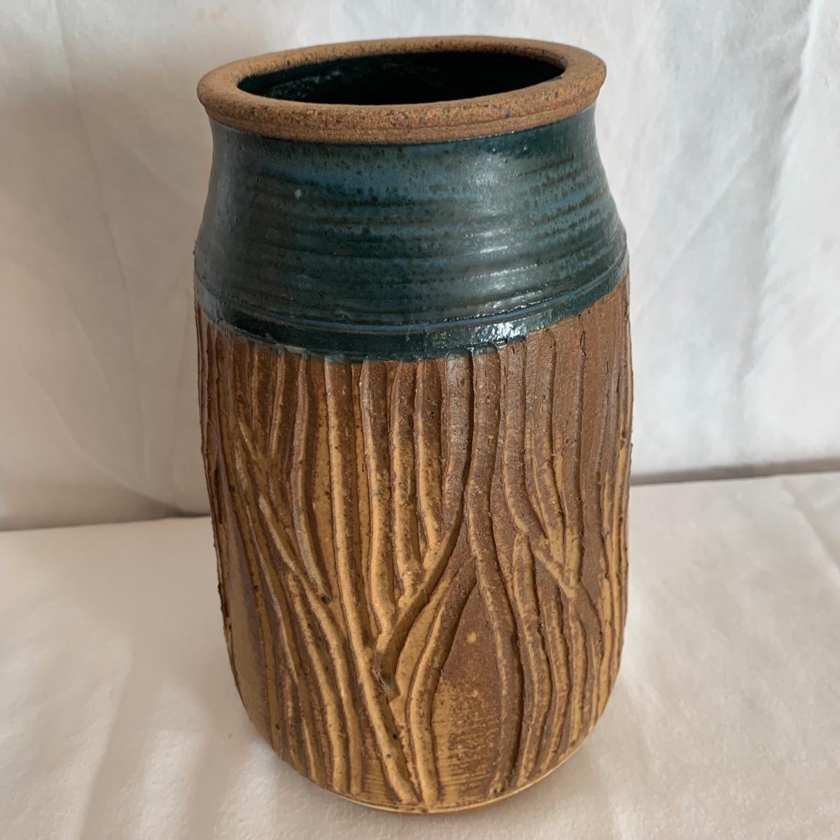 Two unique earth-toned pottery vessels. The tan vase with teal glaze measures approximately 6”D x 9.5”H. It has a pottery mark on the bottom edge. The lidded vessel has a black glaze with hints of blue. It has a chip on the lid rim and on the lid handle, see photos.