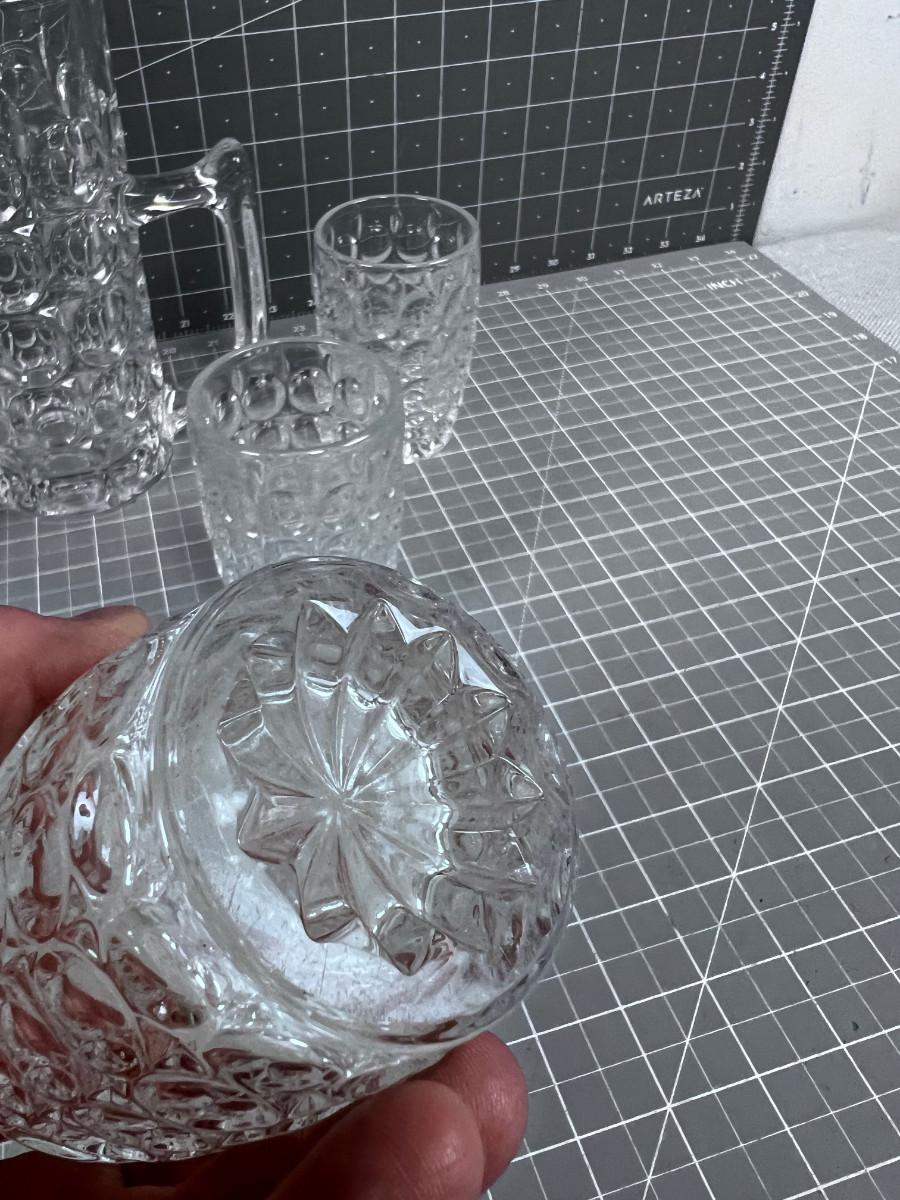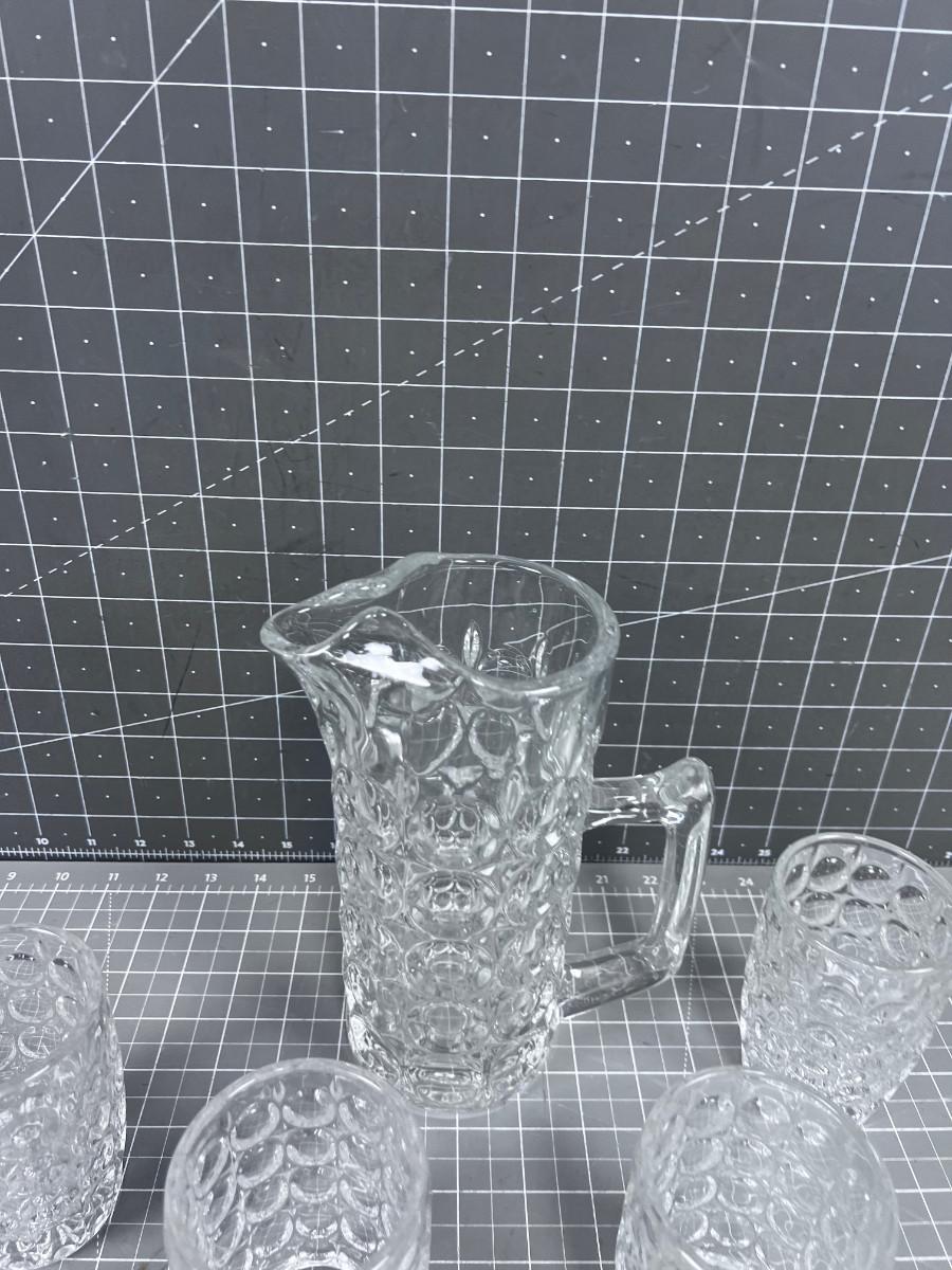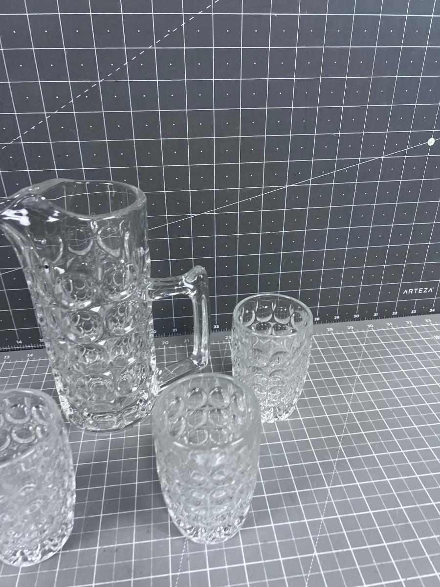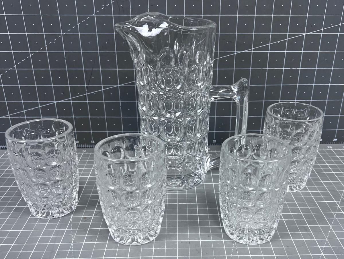Unique Fancy Vintage Pitch and 4 Tumblers HEAVY Glass