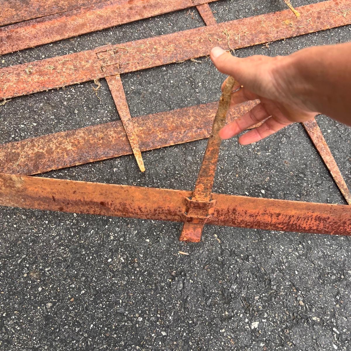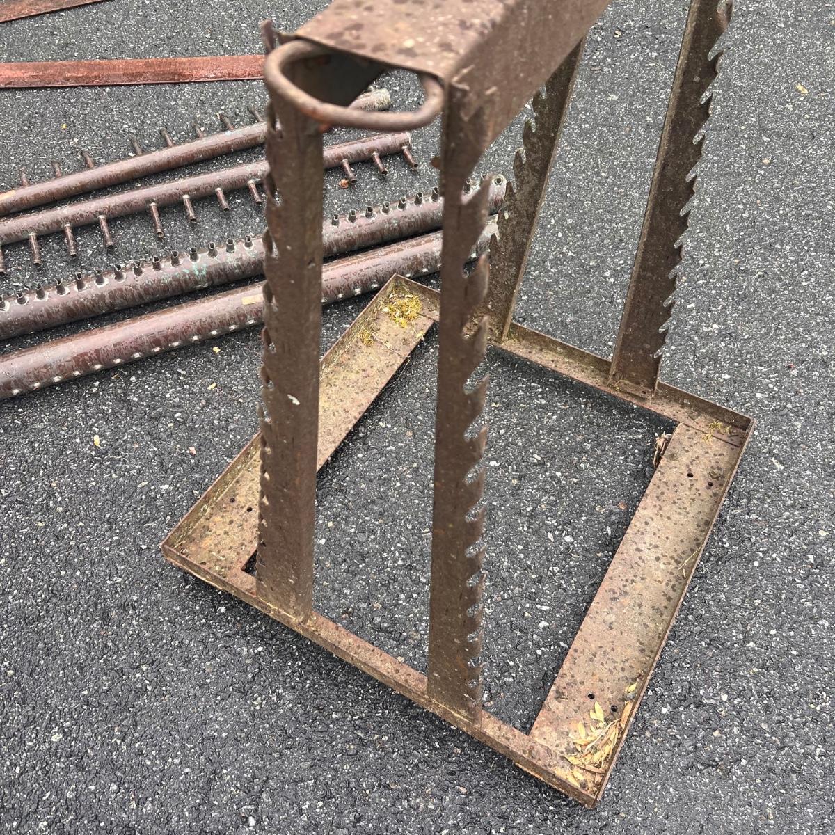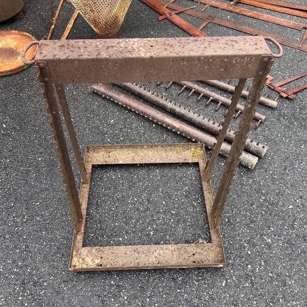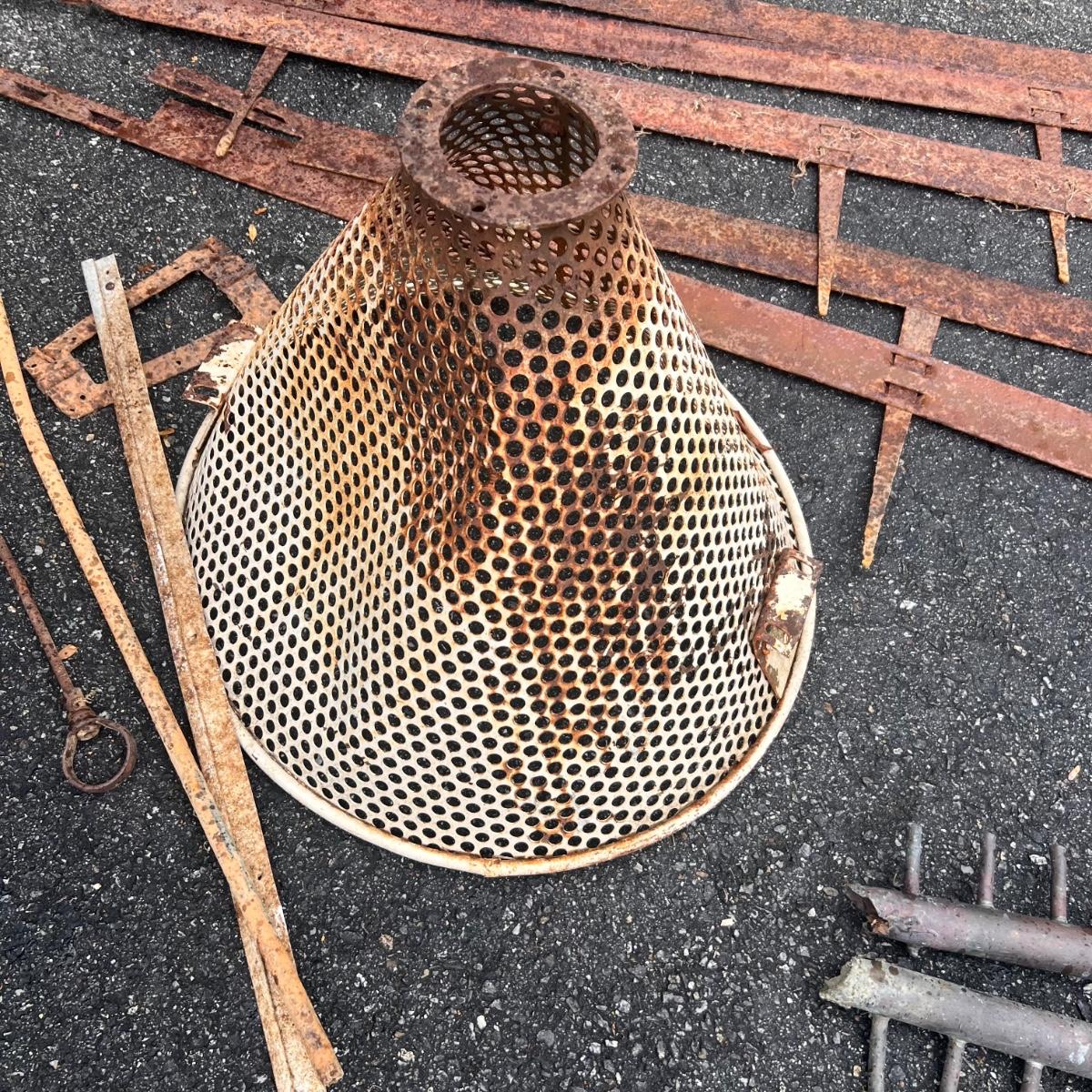 Let your imagination run wild repurposing this nostalgic collection of approximately 15 old farm and home items. All have rust patina to add to their charm. Note the cone shaped basket is dented, it measures 27” x 20”H.