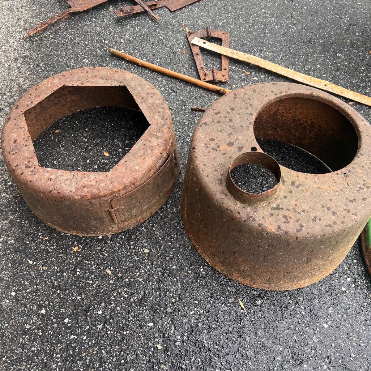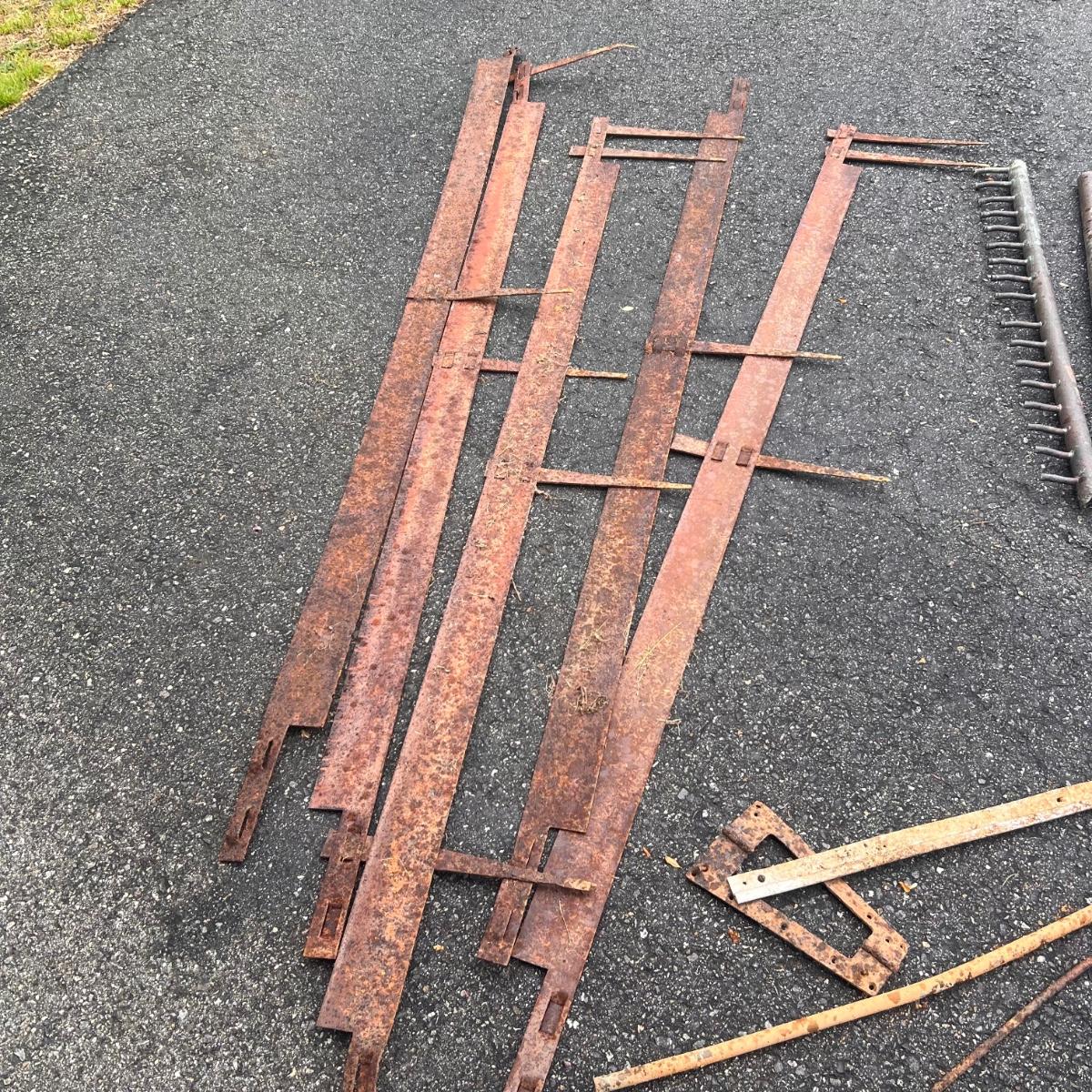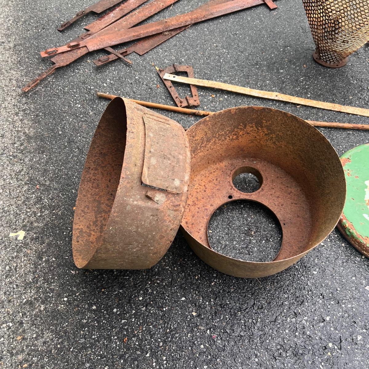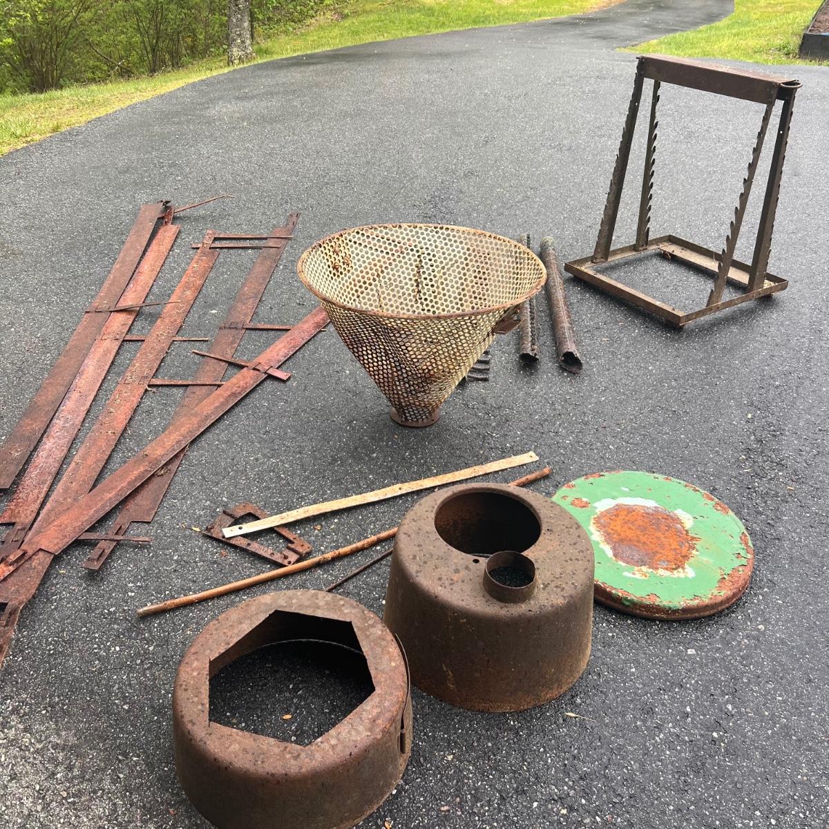 The two round shaped items appear to be from an old stove and other items includes spray nozzles and tines from farm machinery. See pics for full inventory.