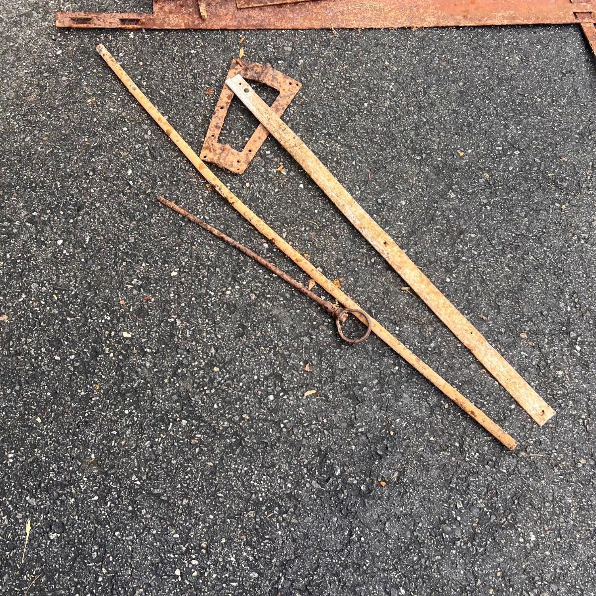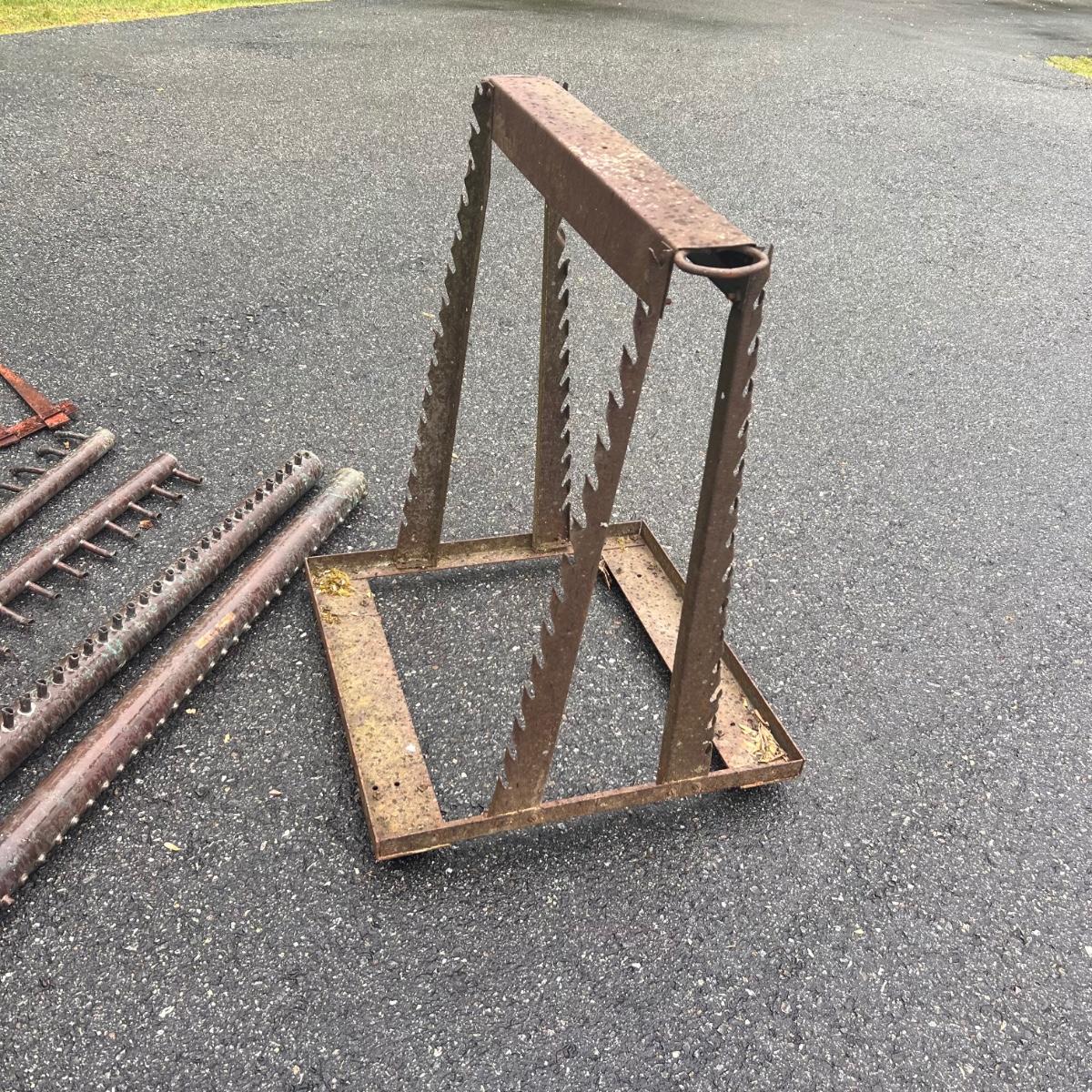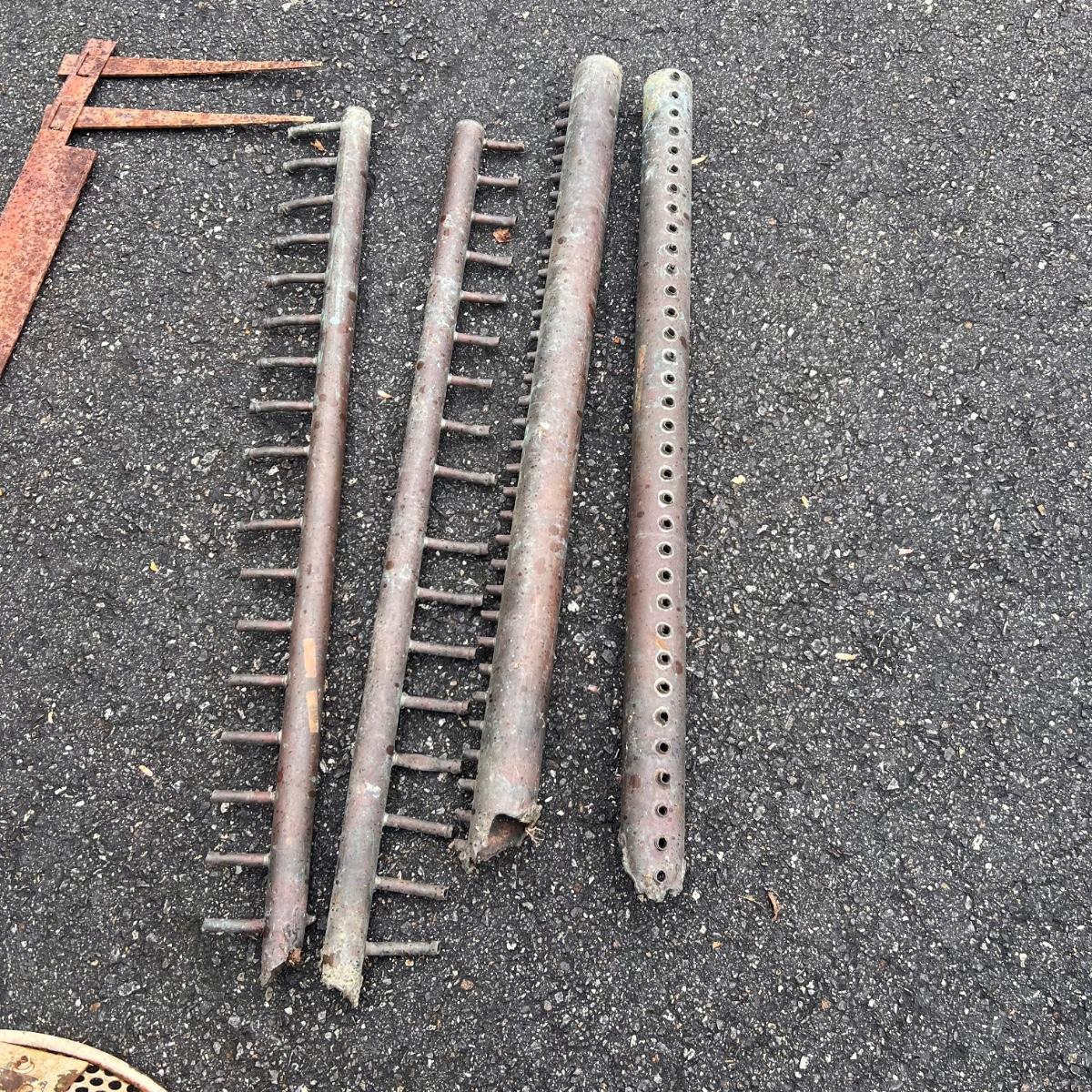 The two round shaped items appear to be from an old stove and other items includes spray nozzles and tines from farm machinery. See pics for full inventory.