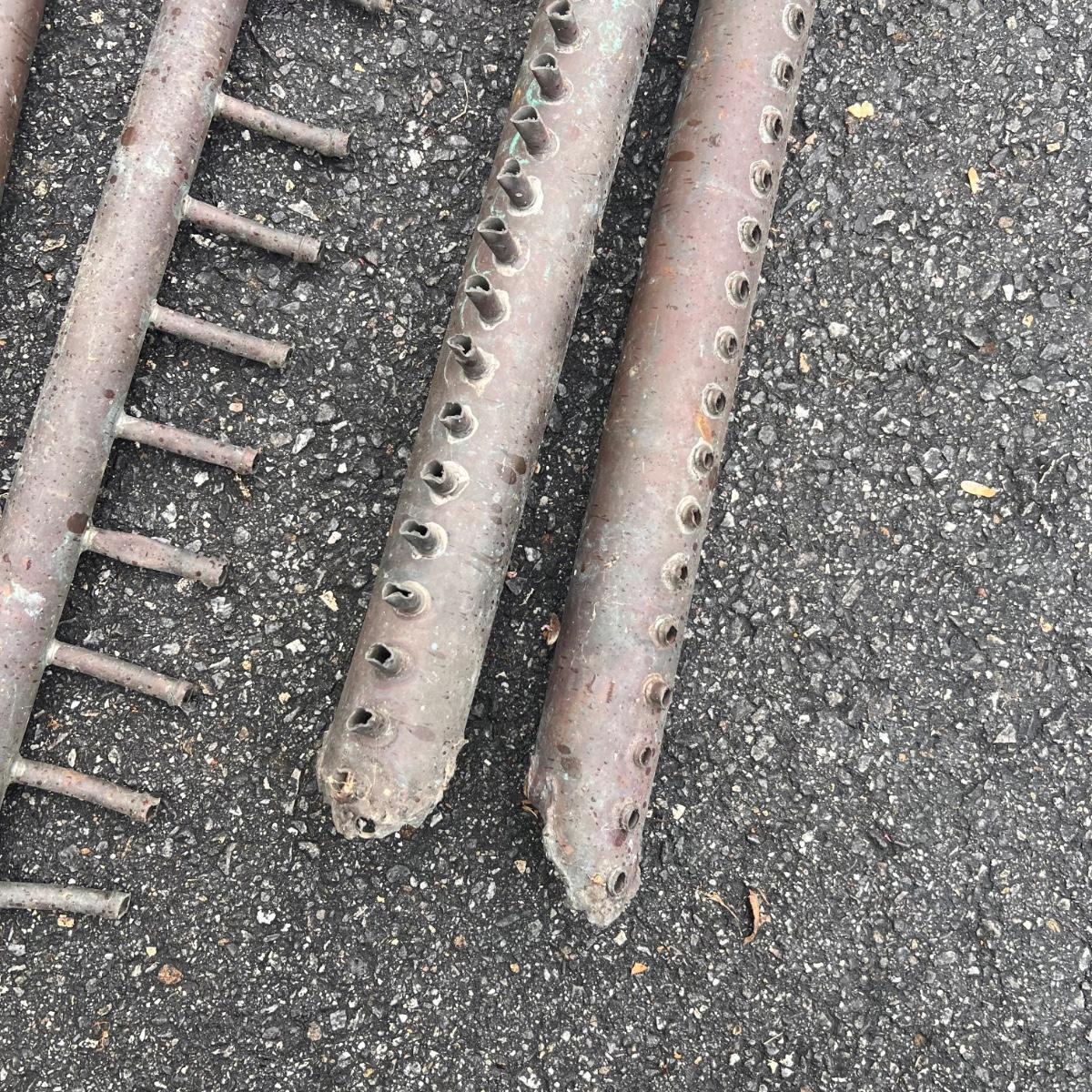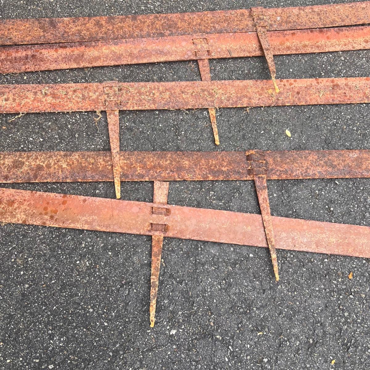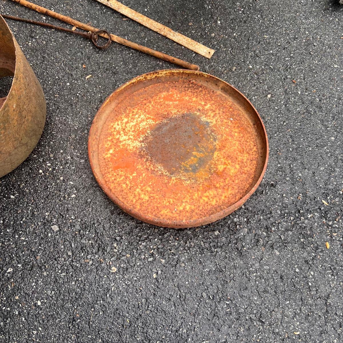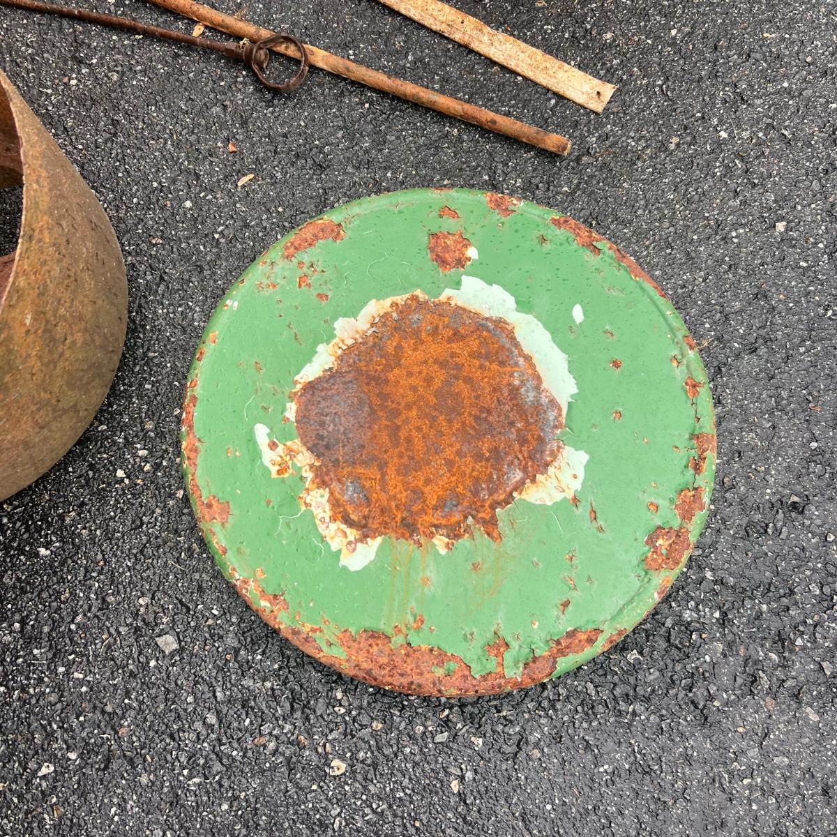 The two round shaped items appear to be from an old stove and other items includes spray nozzles and tines from farm machinery. See pics for full inventory.