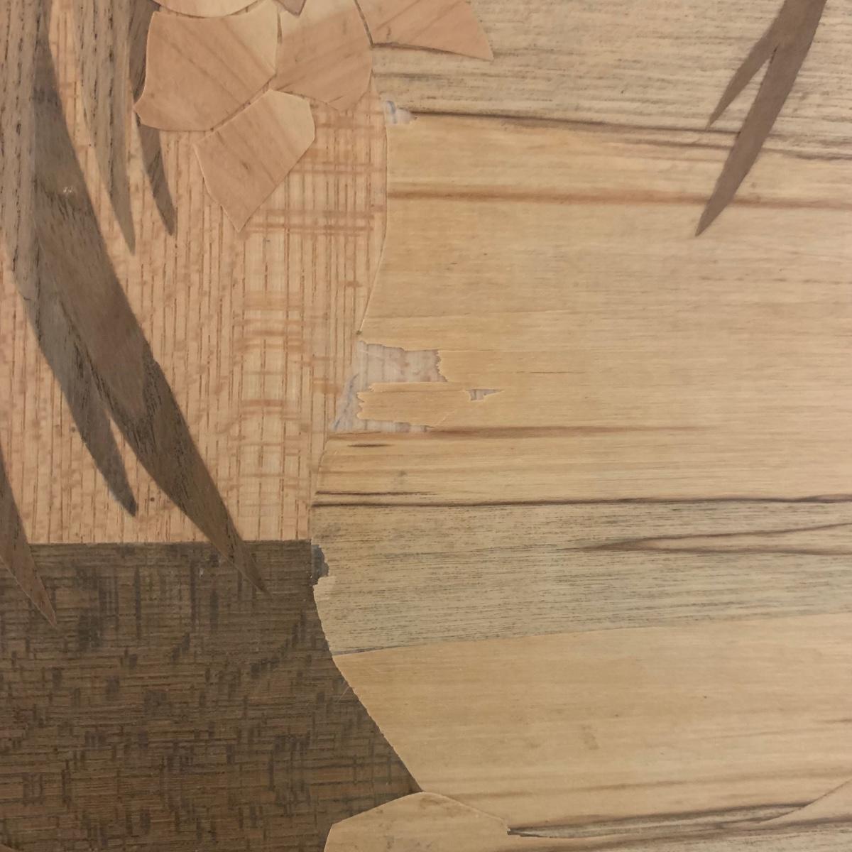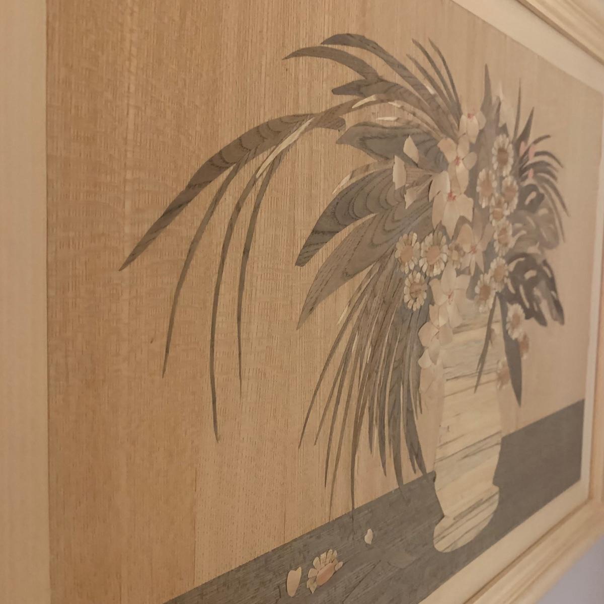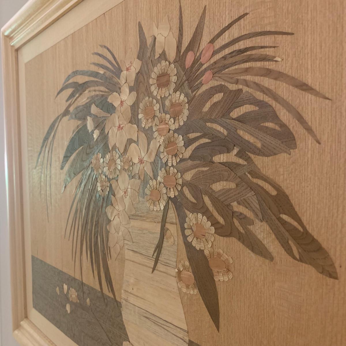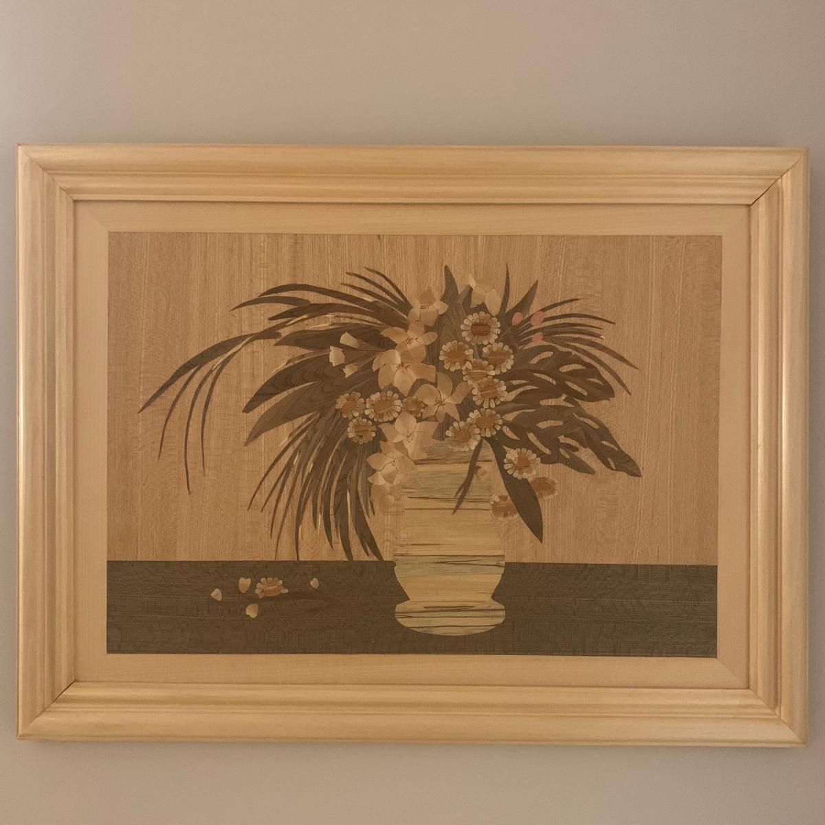 Unique floral art piece made from many thin wood strips. The wood pieces sit flatly on top of each other (are not inlaid). There is an area on the vase where some of the wood has chipped off. Wood frame measures 27” x 20.5”.