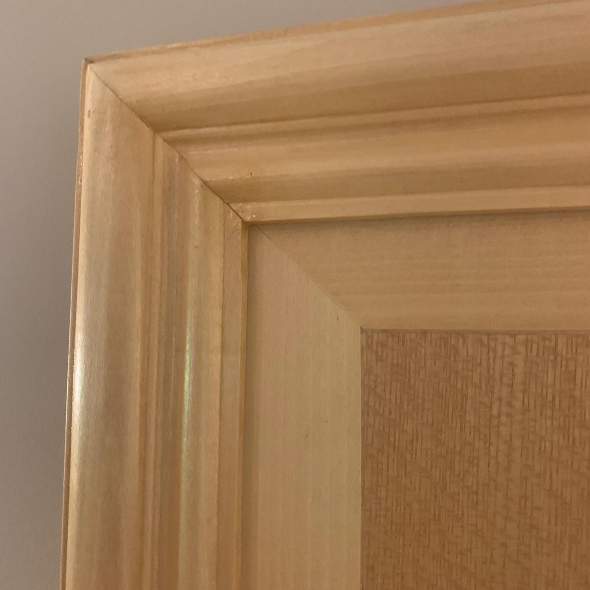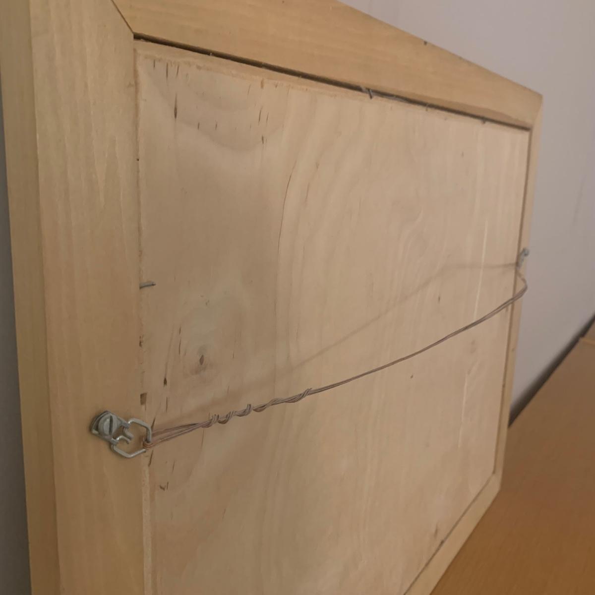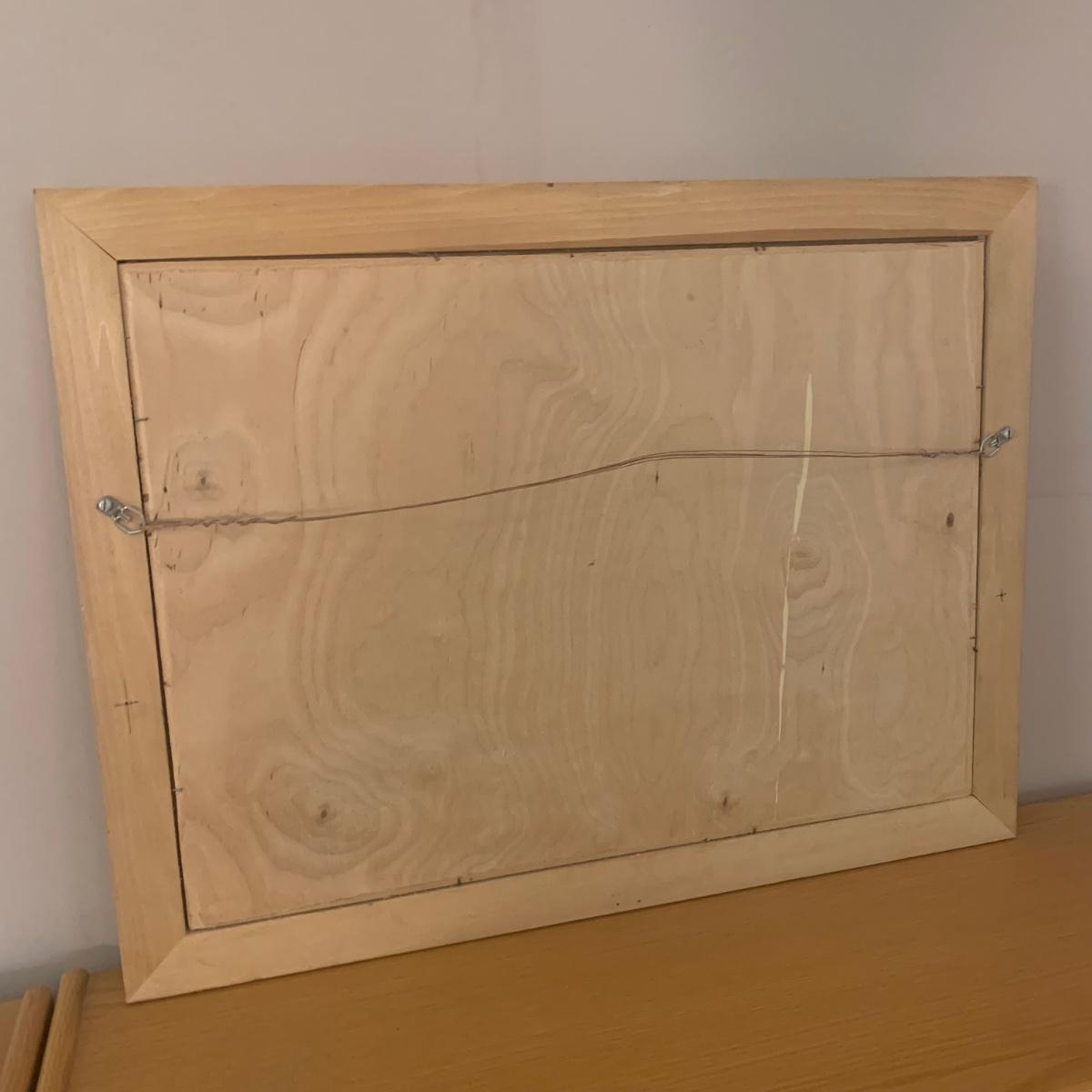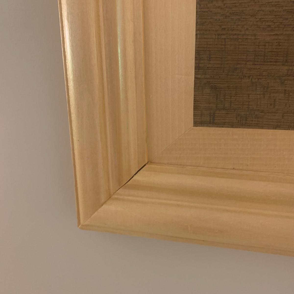 Unique floral art piece made from many thin wood strips. The wood pieces sit flatly on top of each other (are not inlaid). There is an area on the vase where some of the wood has chipped off. Wood frame measures 27” x 20.5”.