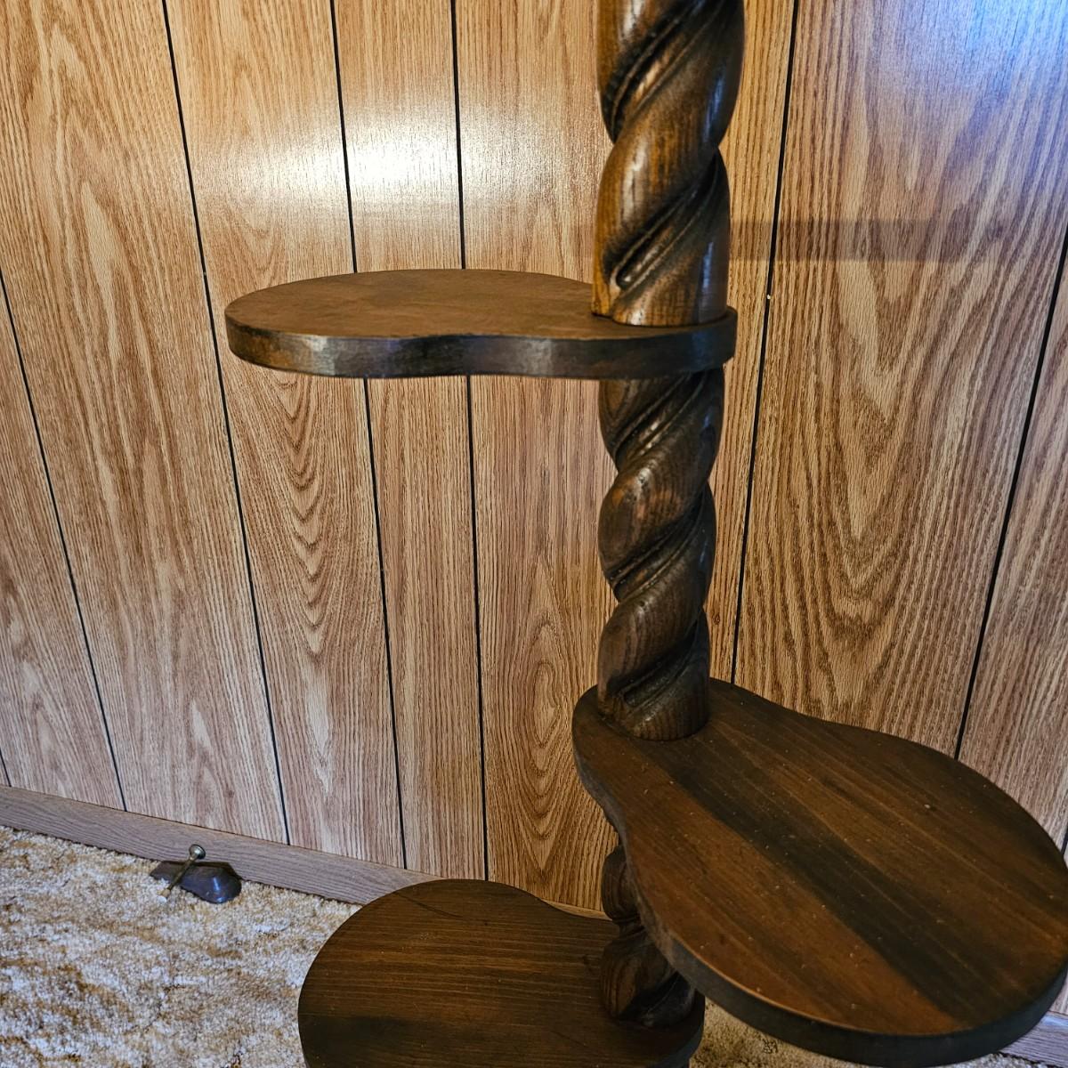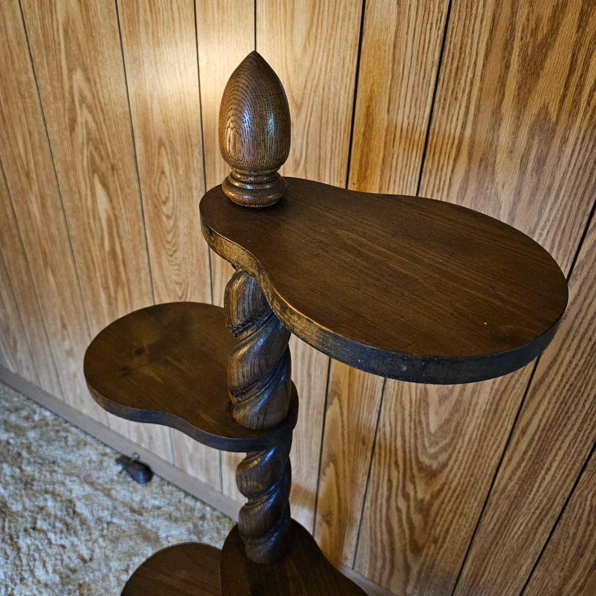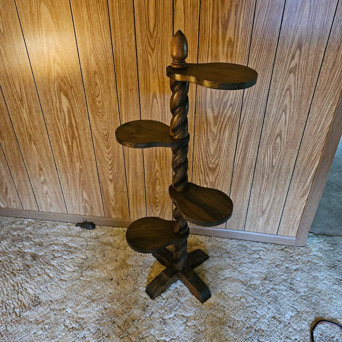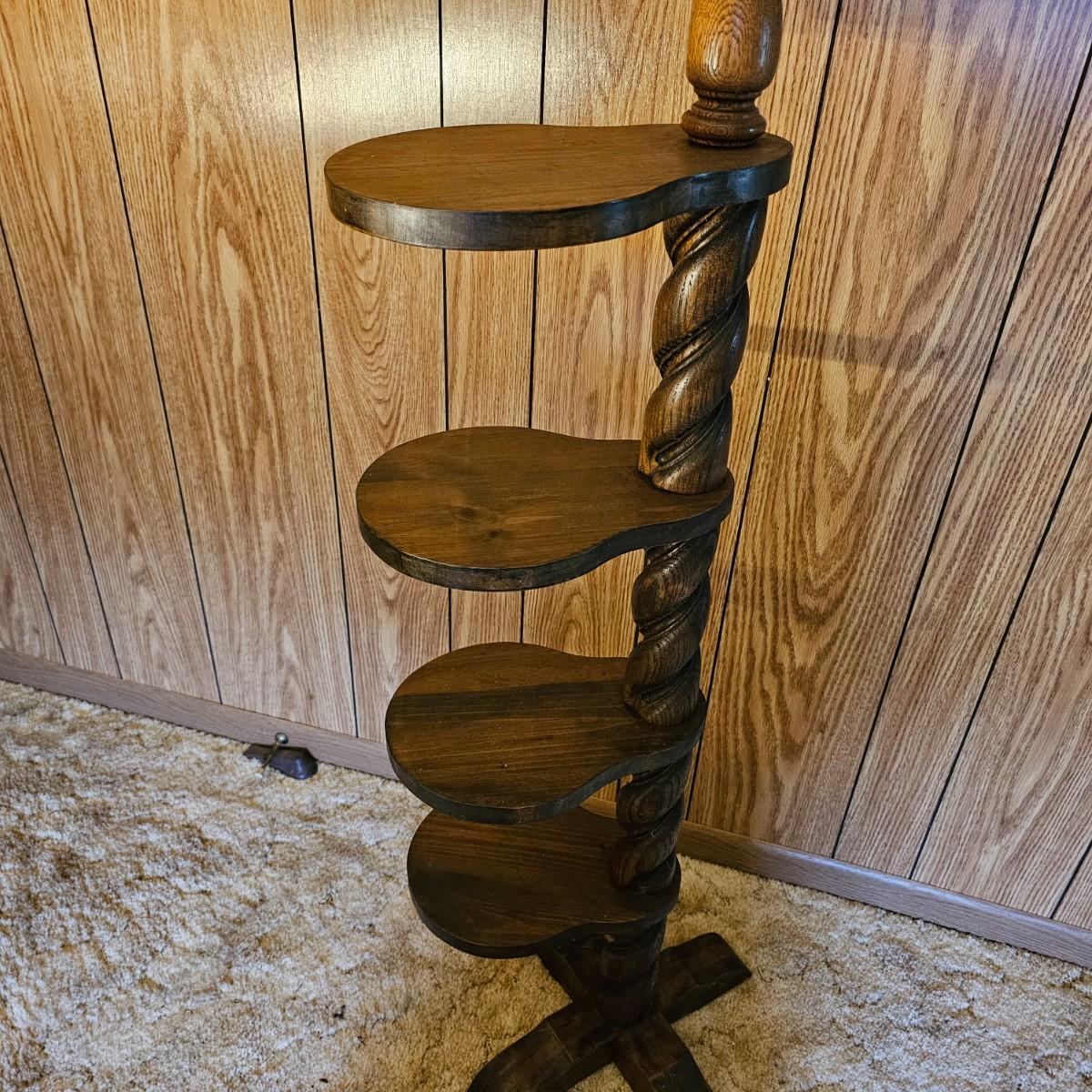 Center column is an oak twist spiral with a crossed base and four pine paddle-shaped shelves. Each shelf is 8.5" x 8" and moves independently of the others. Entire piece measures 20"D x 45"H. Dark finish on all. See photos for details.