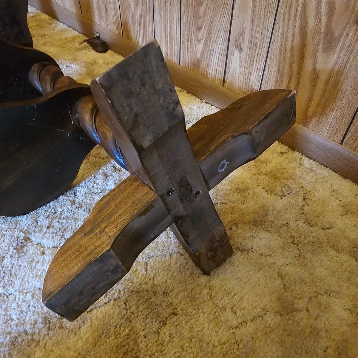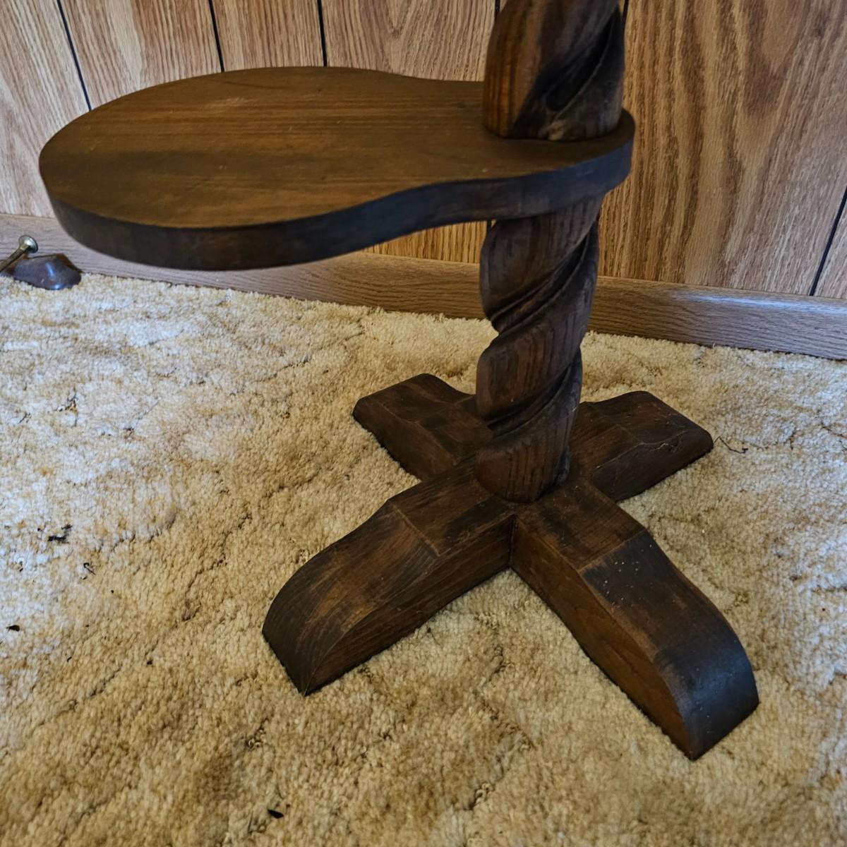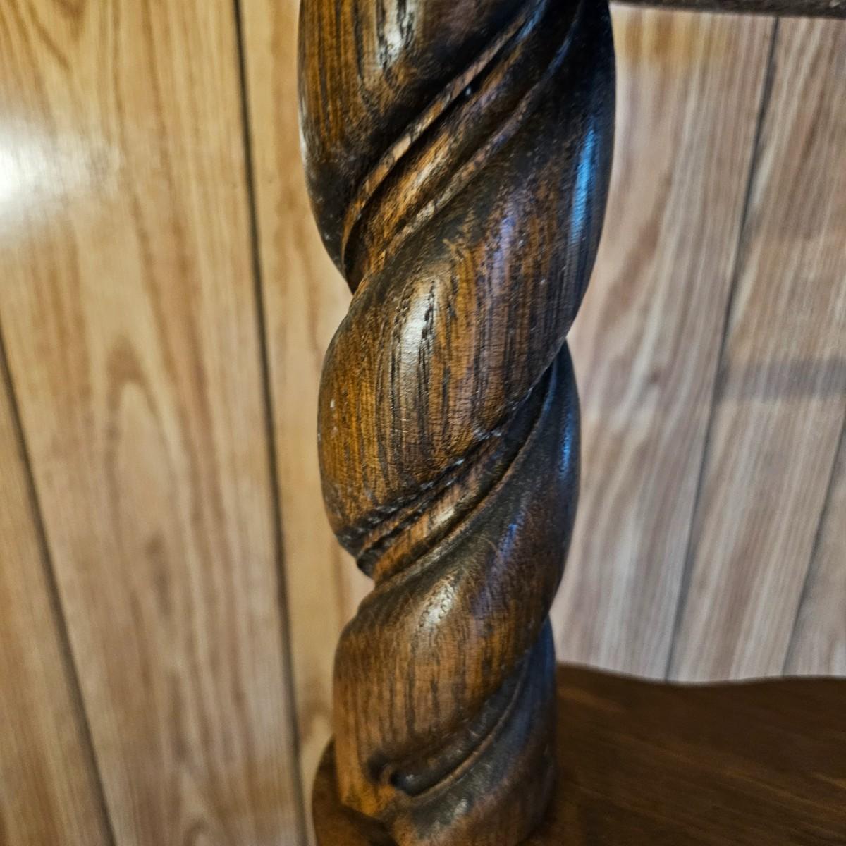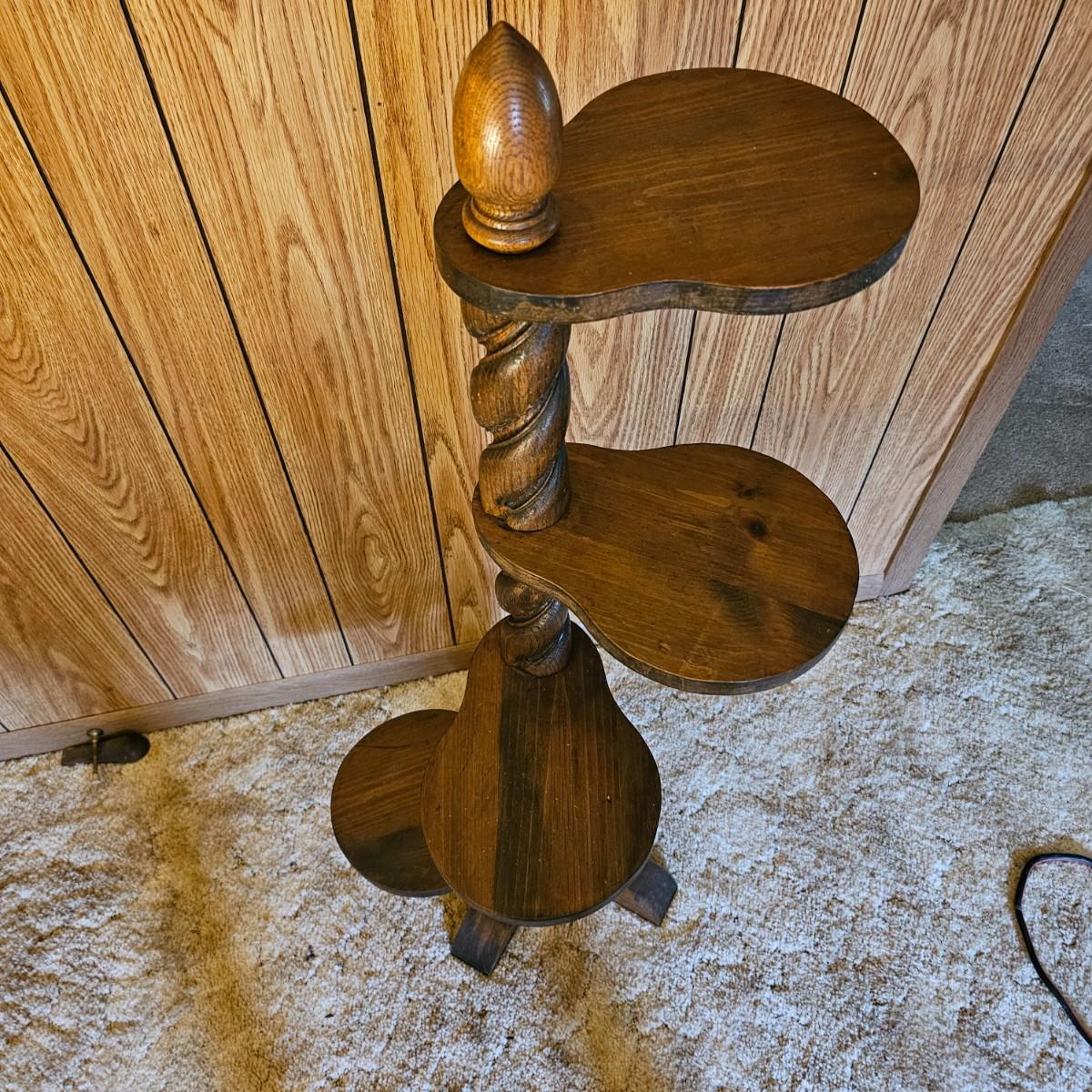 Center column is an oak twist spiral with a crossed base and four pine paddle-shaped shelves. Each shelf is 8.5" x 8" and moves independently of the others. Entire piece measures 20"D x 45"H. Dark finish on all. See photos for details.