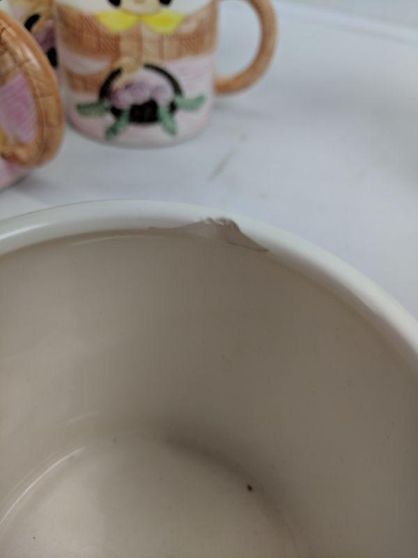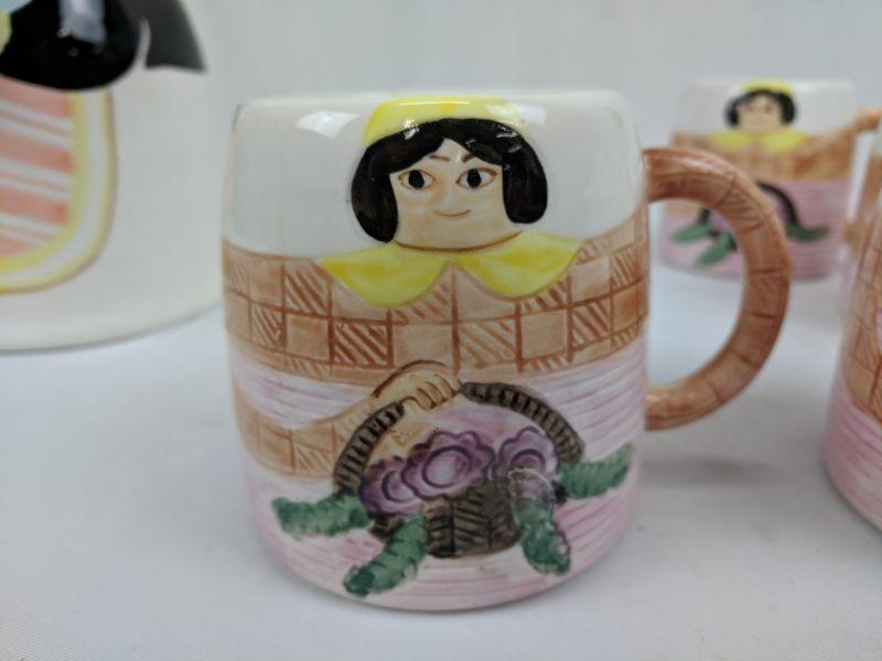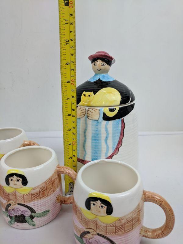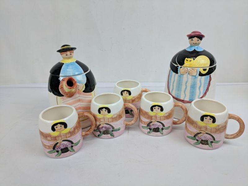 Unique Girl Coffee & Cookie Jars, 5 Mugs, Cookie Lid Has Chip & 1 Mug Has Chip