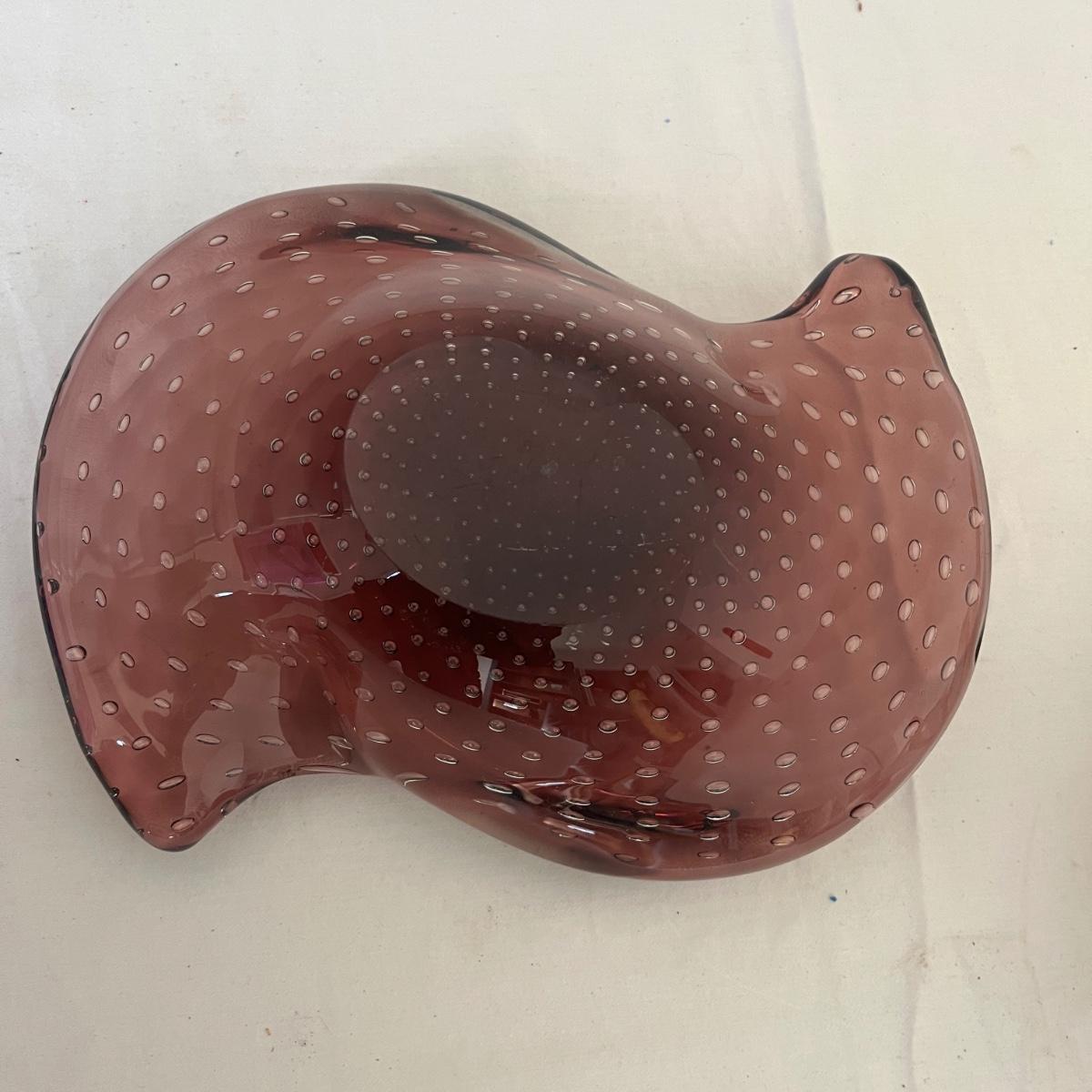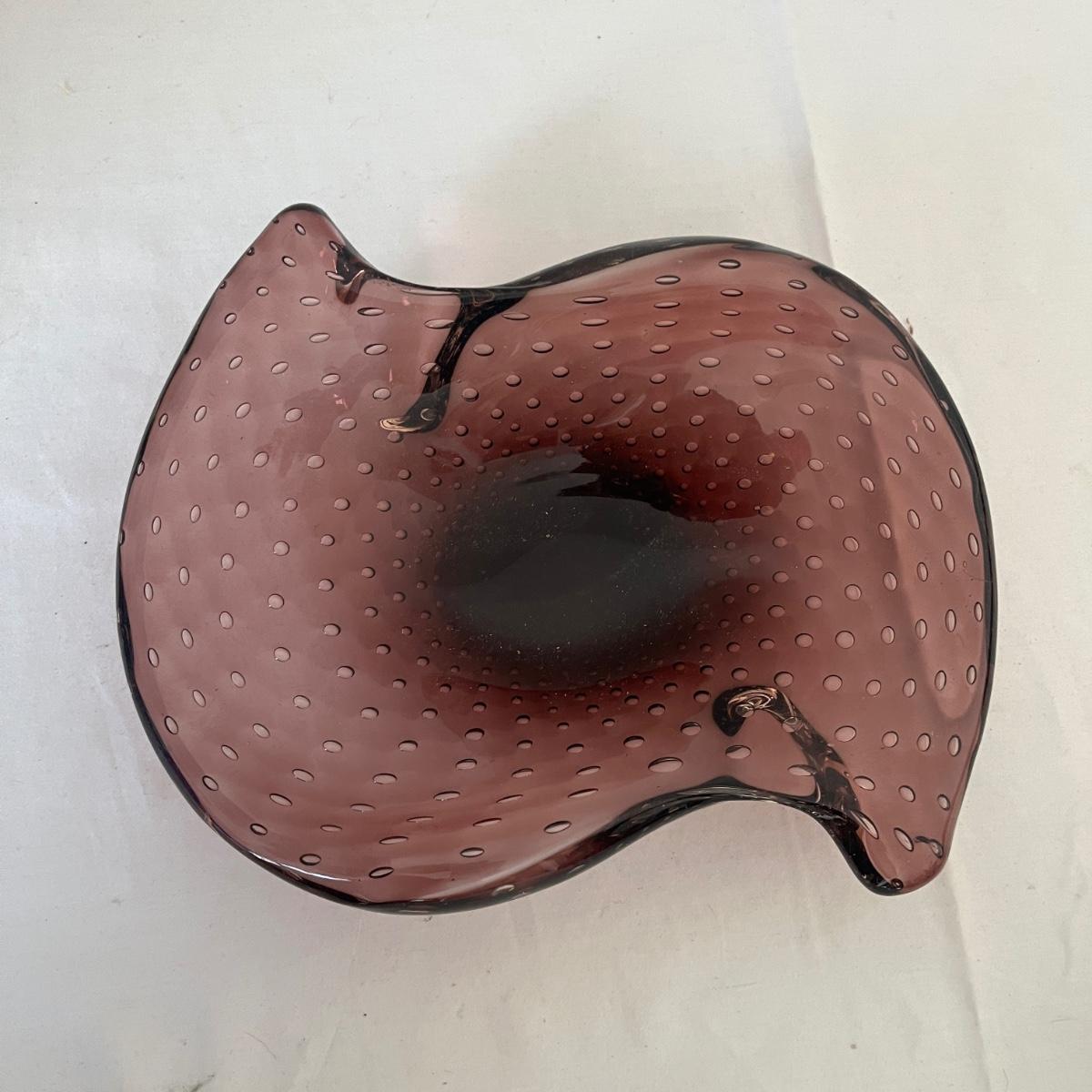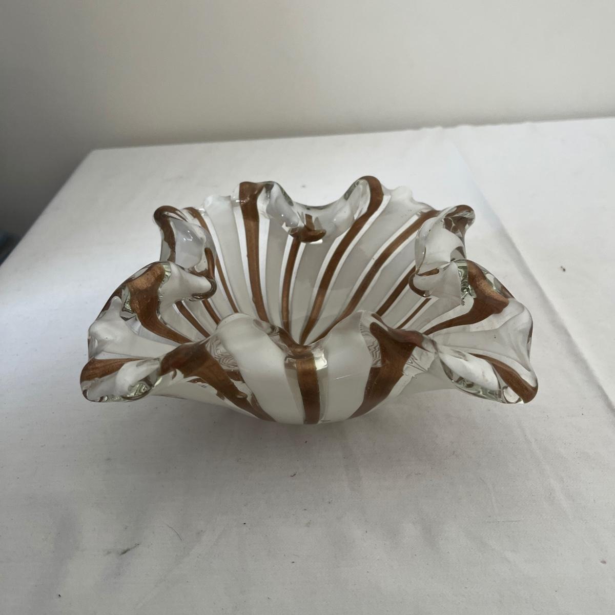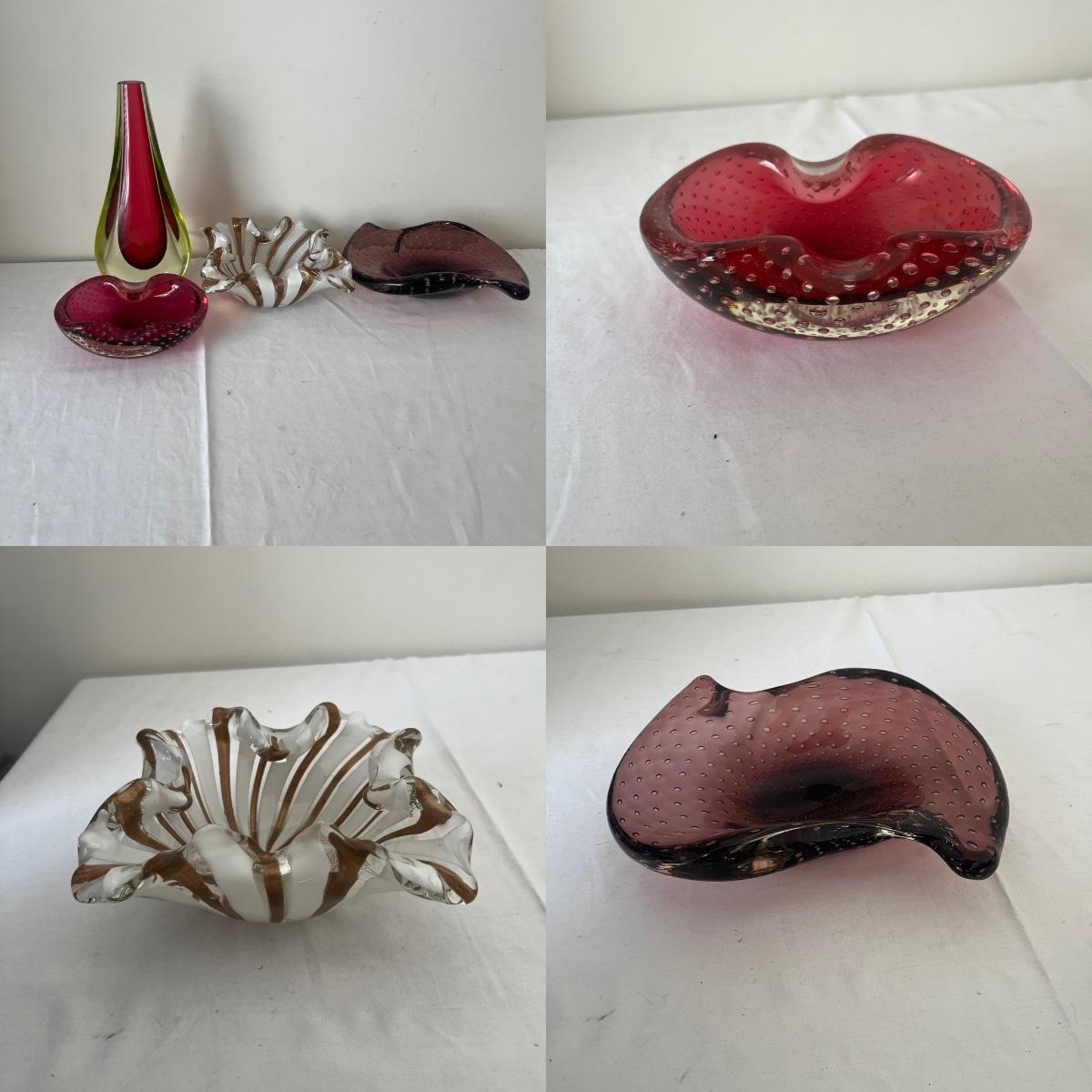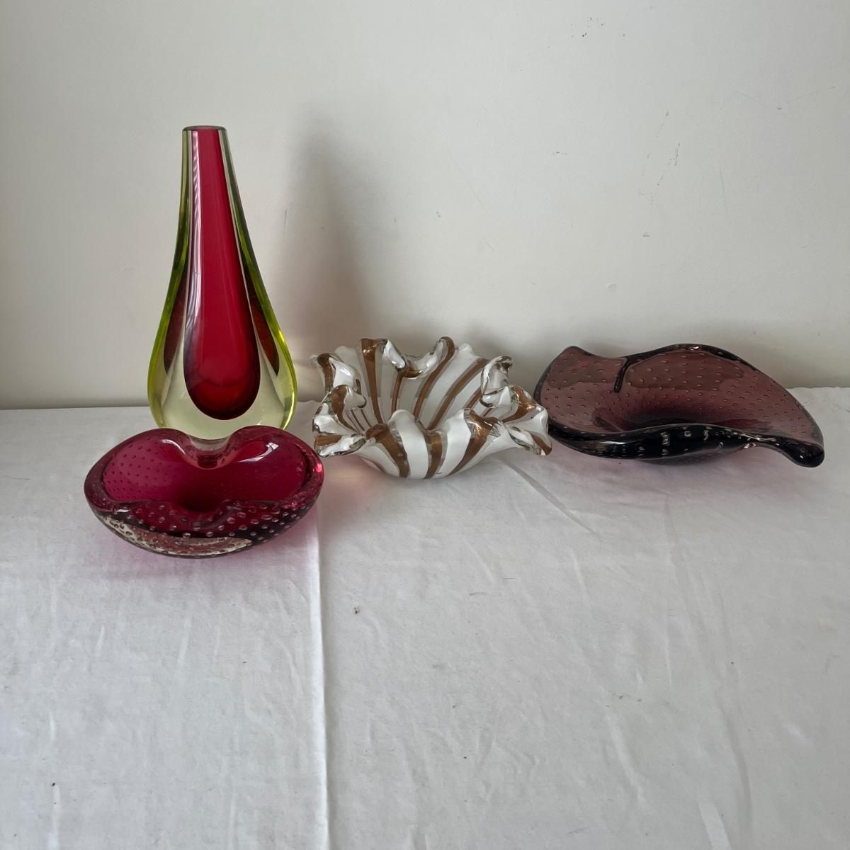 Lot includes three unique glass dishes and one glass vase. Largest dish measures 8.5” x 6.5” x 2.5”H.
