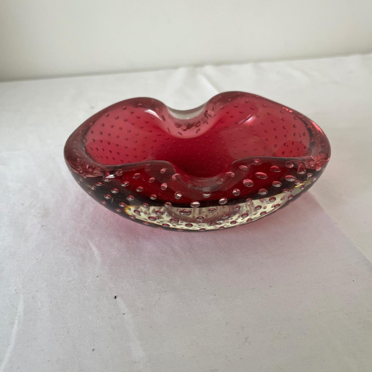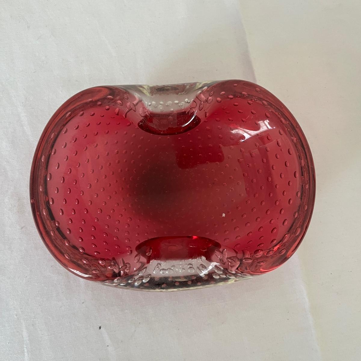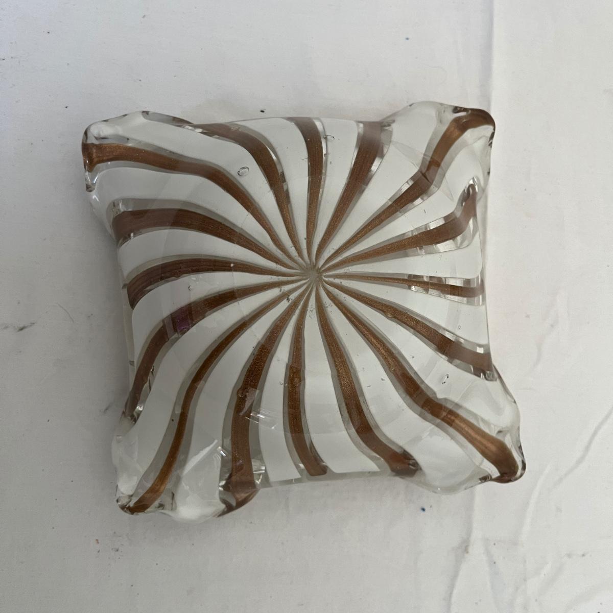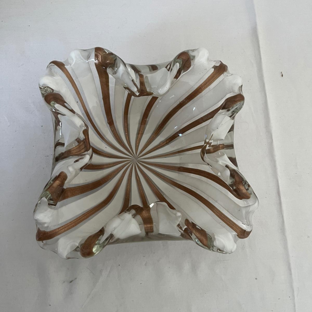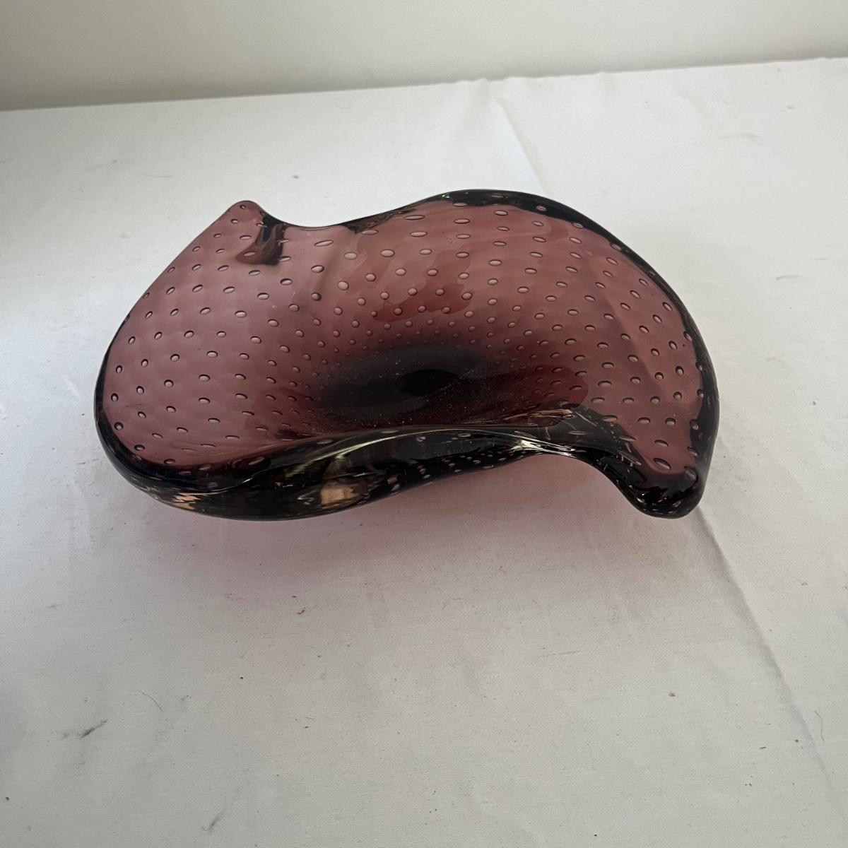 Lot includes three unique glass dishes and one glass vase. Largest dish measures 8.5” x 6.5” x 2.5”H.