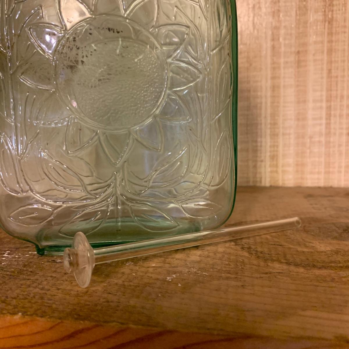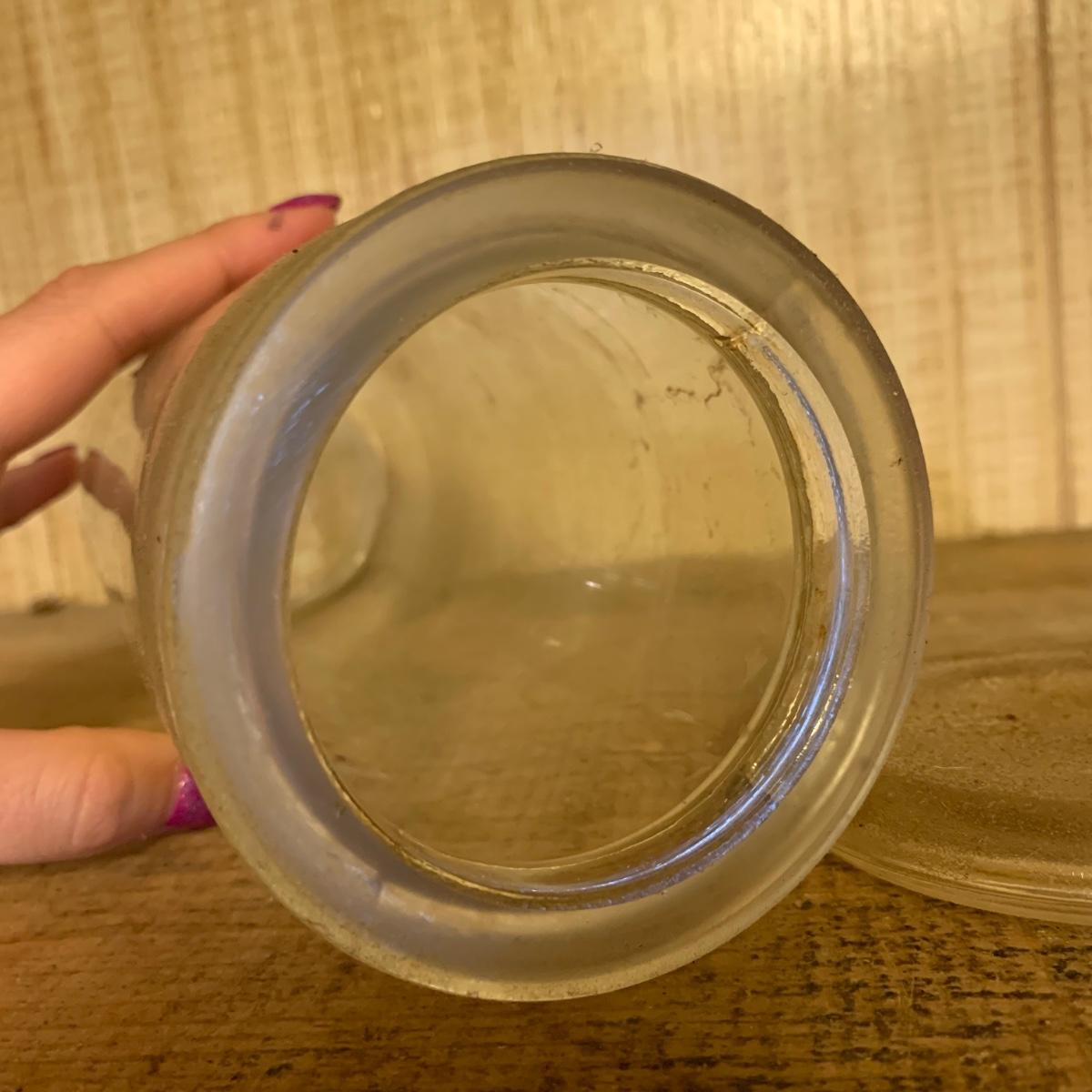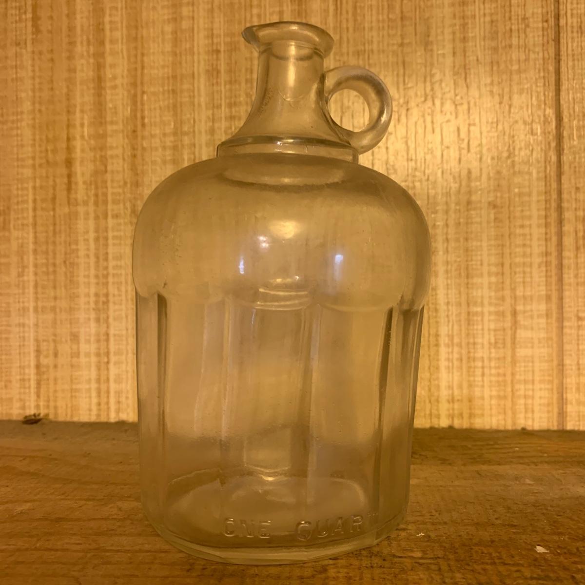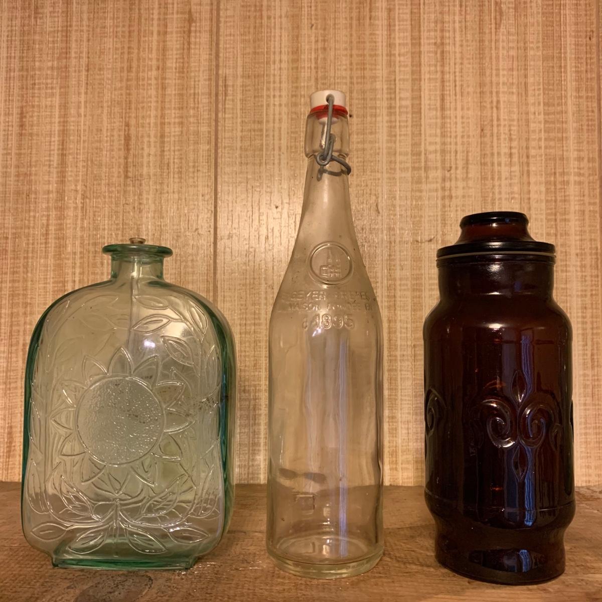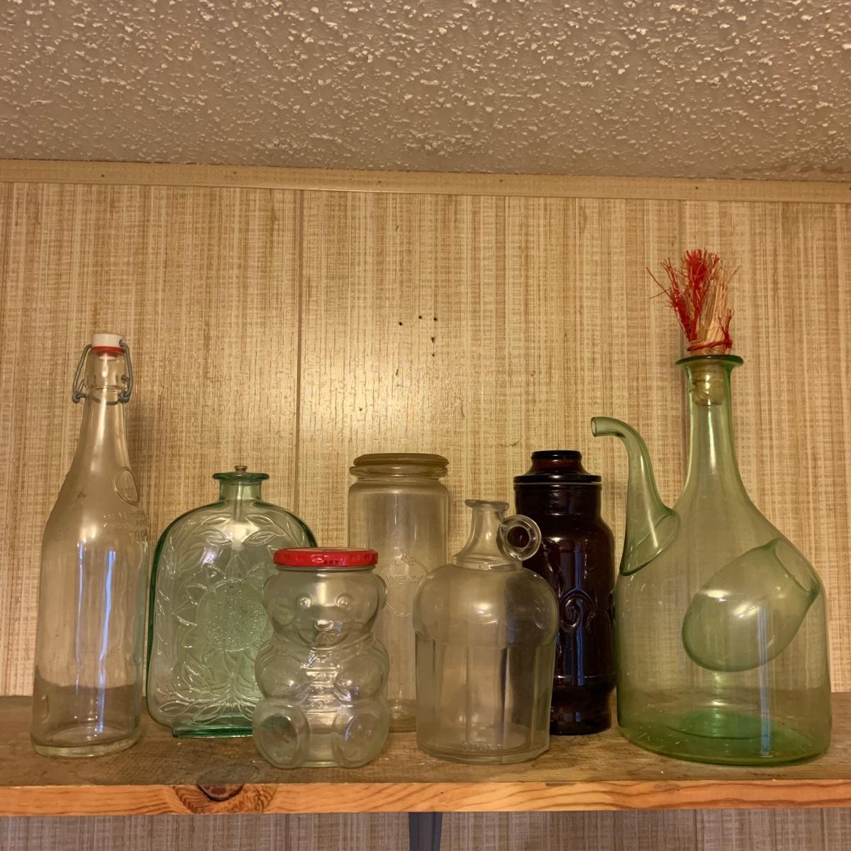 Seven unique glass jars and bottles. One is a swing top bottle marked “Geyer Freres Madison Fondee En 1895”. There is a teddy bear shaped jar with a metal lid, a light green-hued bottle with a sunflower decoration and a glass stopper, a one quart jug with a handle and spout, and a taller light green-wine decanter bottle. There are also two cylindrical jars with glass lids. One is dark amber colored and the other clear glass. The clear glass lid has some stickiness that should be able to be cleaned off. The shortest jar is the teddy bear at 6” tall and the tallest is the green-hued pitcher at 12.5”. Shipping available.