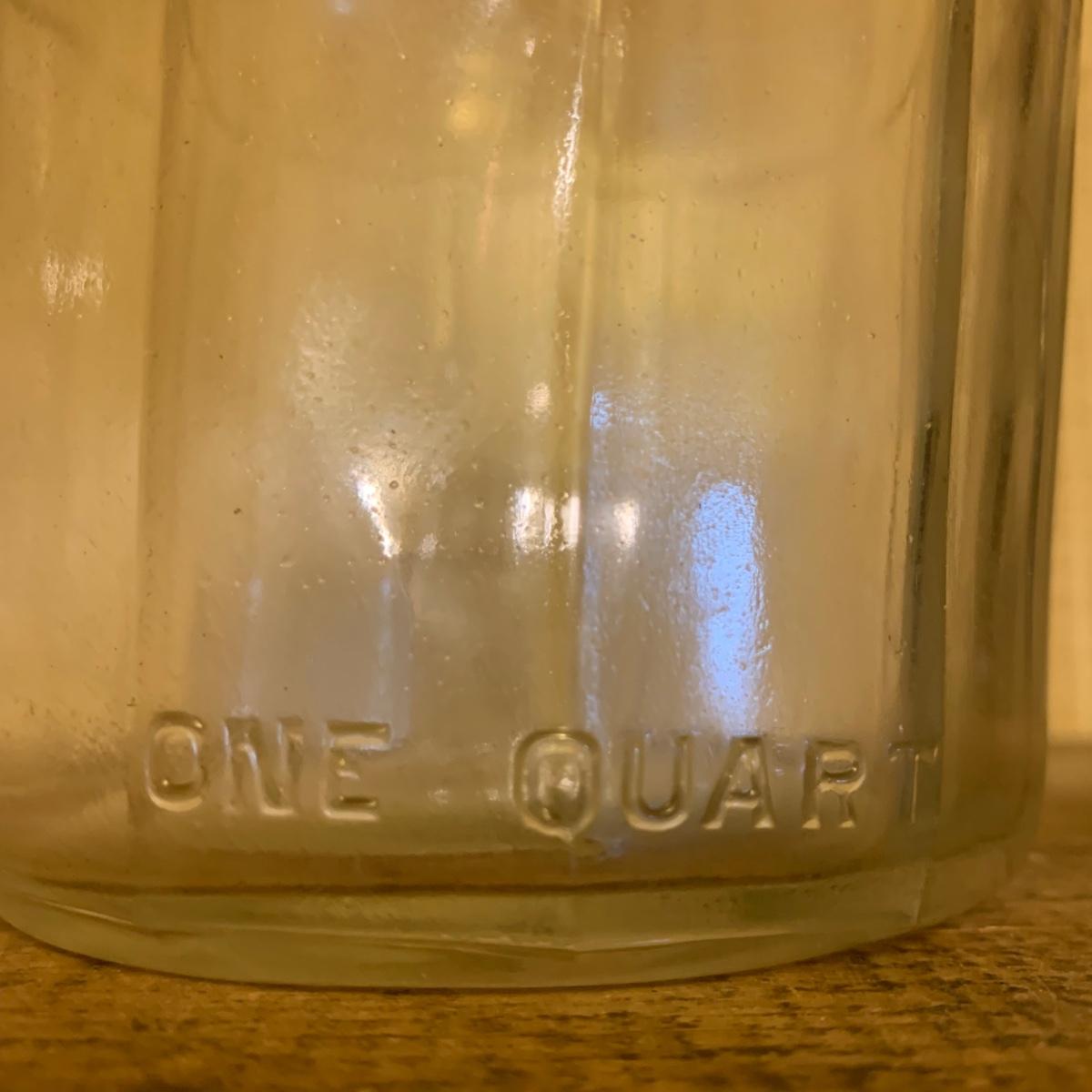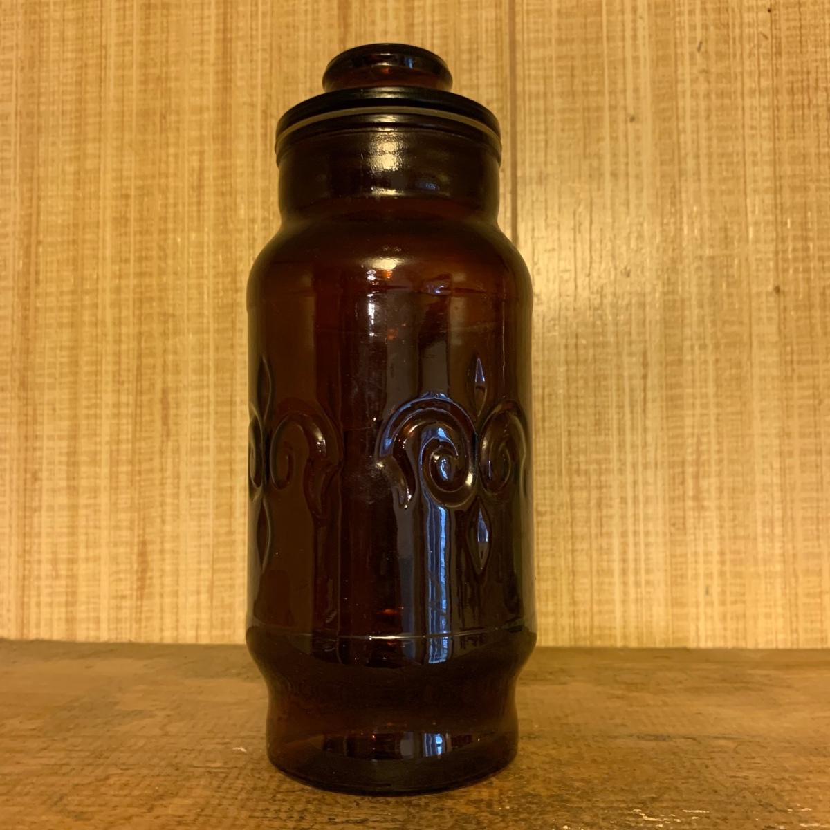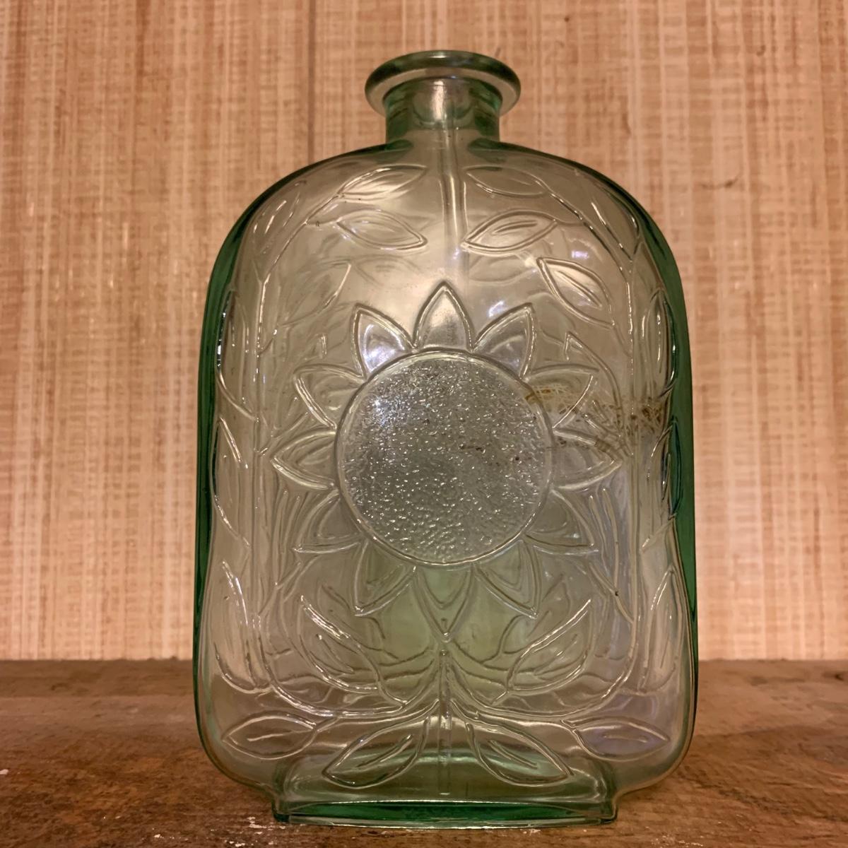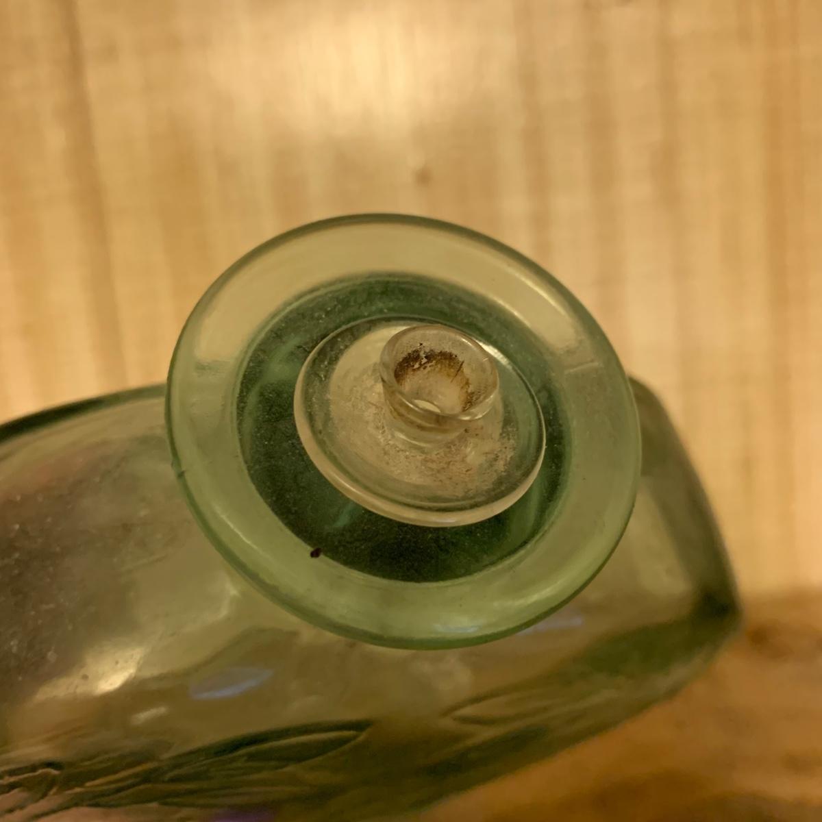 Seven unique glass jars and bottles. One is a swing top bottle marked “Geyer Freres Madison Fondee En 1895”. There is a teddy bear shaped jar with a metal lid, a light green-hued bottle with a sunflower decoration and a glass stopper, a one quart jug with a handle and spout, and a taller light green-wine decanter bottle. There are also two cylindrical jars with glass lids. One is dark amber colored and the other clear glass. The clear glass lid has some stickiness that should be able to be cleaned off. The shortest jar is the teddy bear at 6” tall and the tallest is the green-hued pitcher at 12.5”. Shipping available.