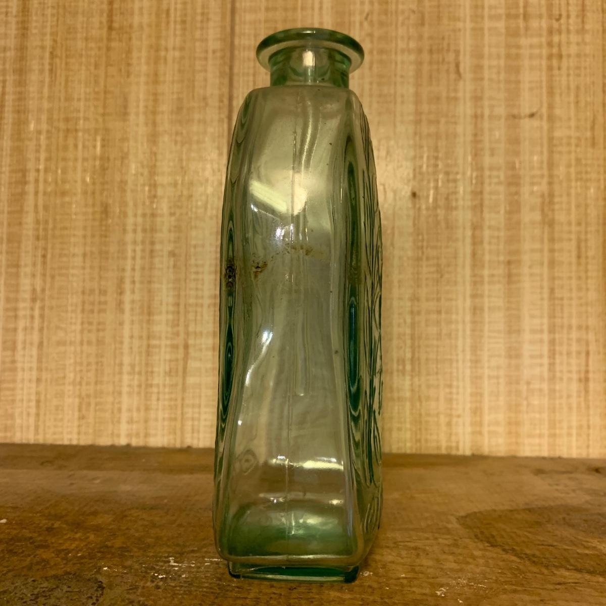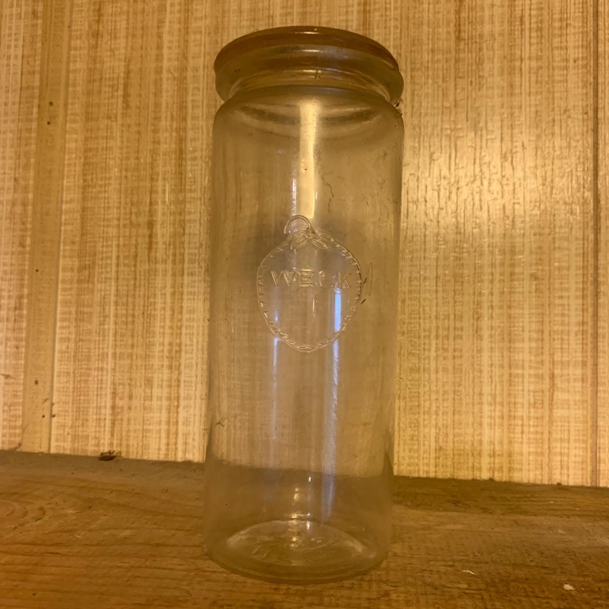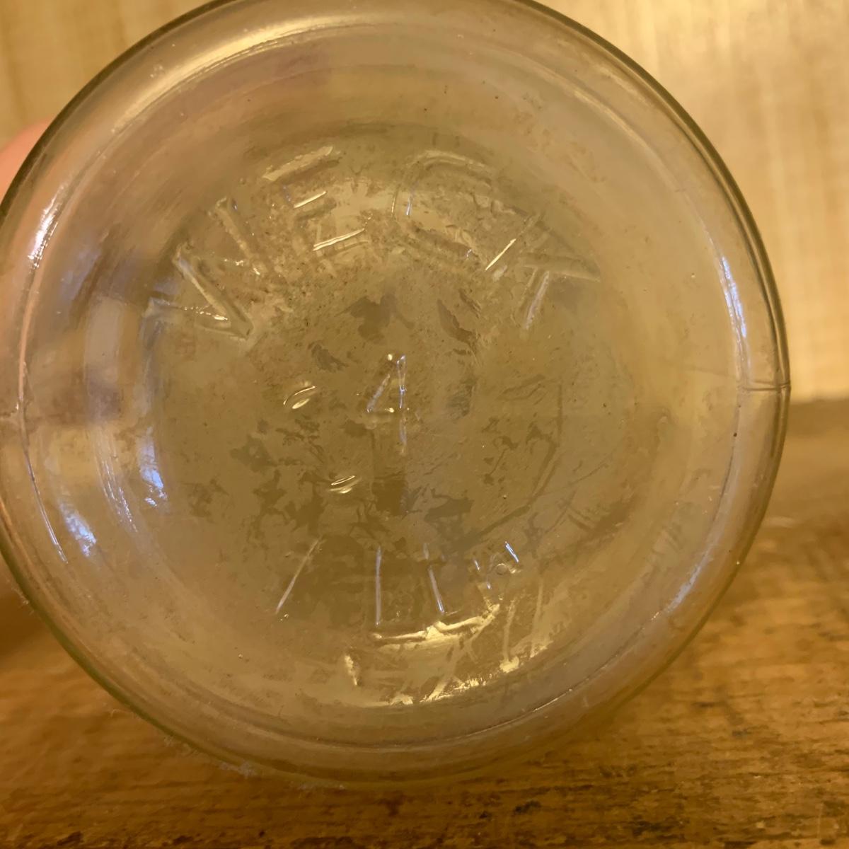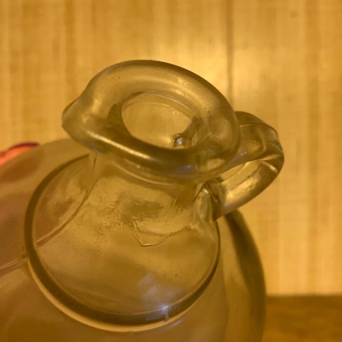 Seven unique glass jars and bottles. One is a swing top bottle marked “Geyer Freres Madison Fondee En 1895”. There is a teddy bear shaped jar with a metal lid, a light green-hued bottle with a sunflower decoration and a glass stopper, a one quart jug with a handle and spout, and a taller light green-wine decanter bottle. There are also two cylindrical jars with glass lids. One is dark amber colored and the other clear glass. The clear glass lid has some stickiness that should be able to be cleaned off. The shortest jar is the teddy bear at 6” tall and the tallest is the green-hued pitcher at 12.5”. Shipping available.