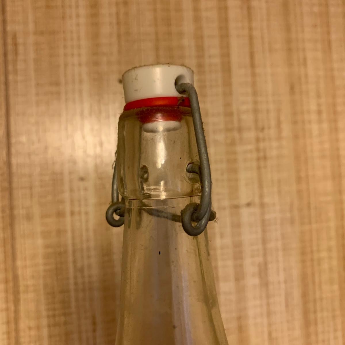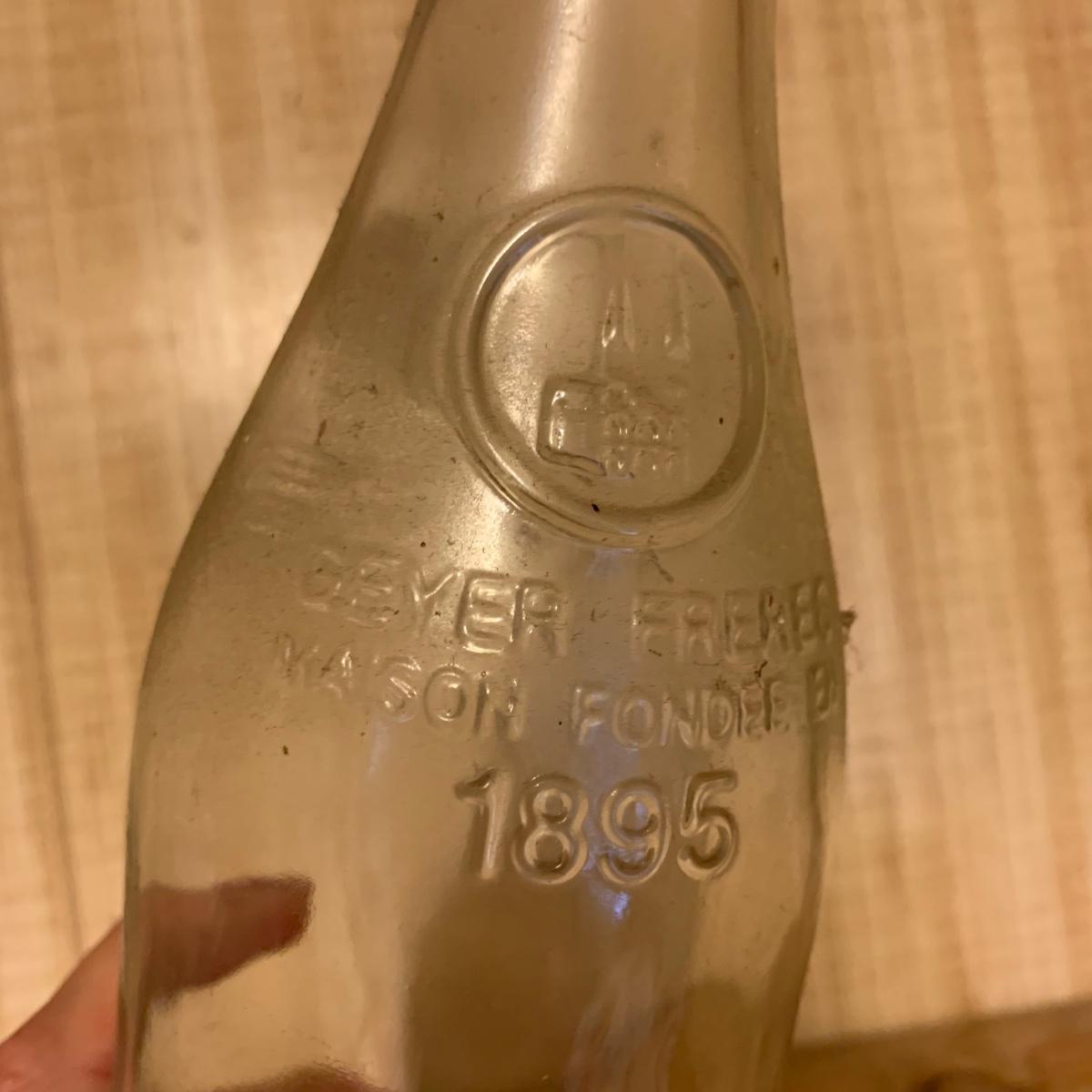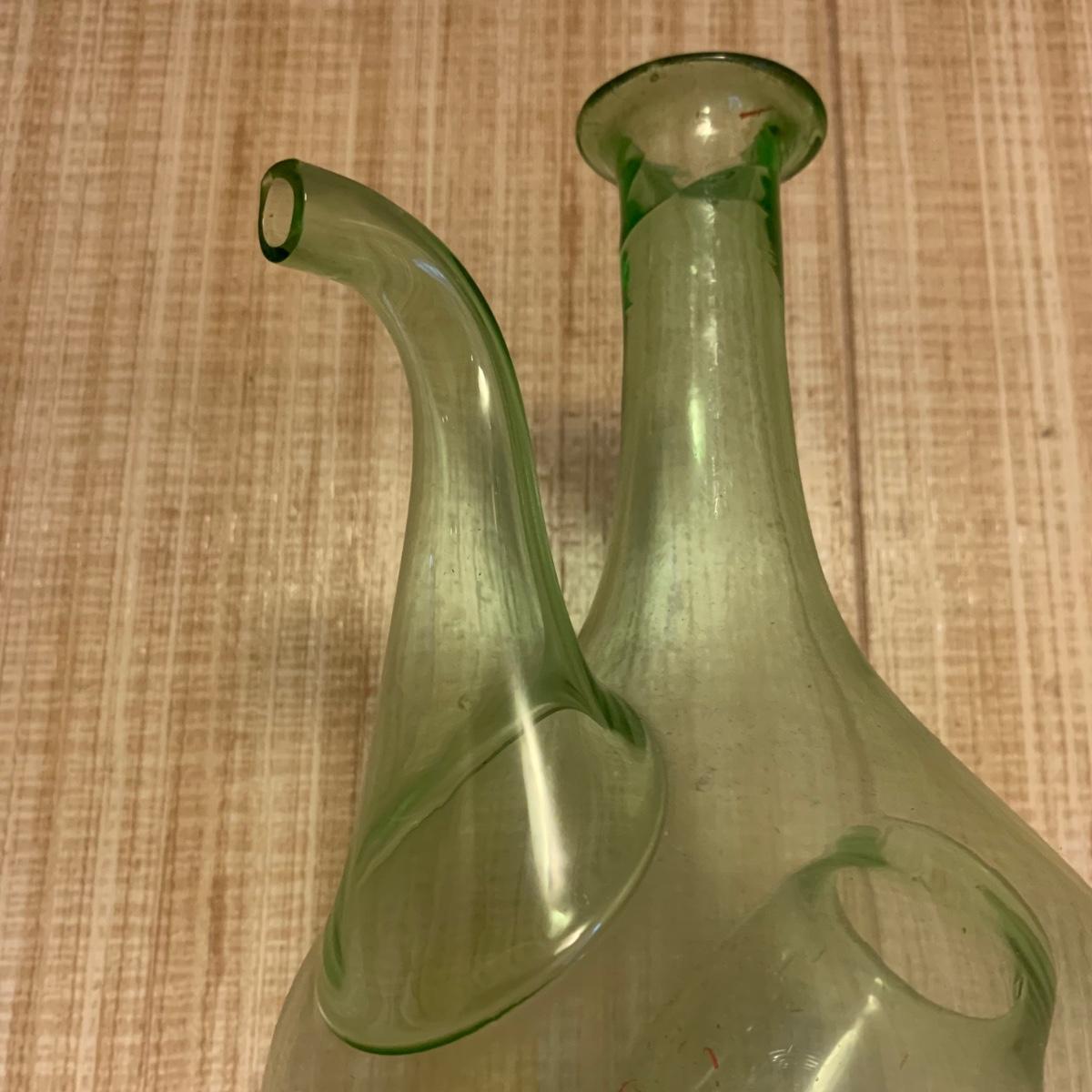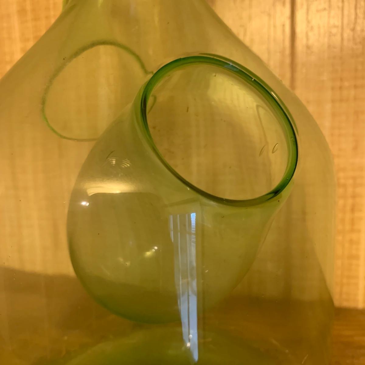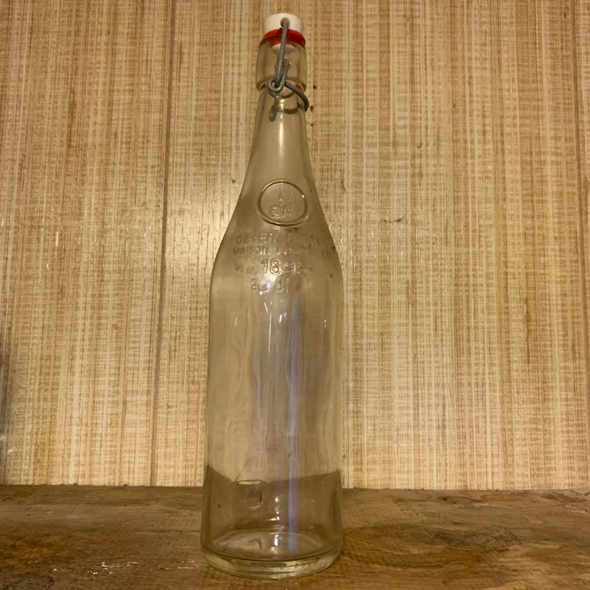 Seven unique glass jars and bottles. One is a swing top bottle marked “Geyer Freres Madison Fondee En 1895”. There is a teddy bear shaped jar with a metal lid, a light green-hued bottle with a sunflower decoration and a glass stopper, a one quart jug with a handle and spout, and a taller light green-wine decanter bottle. There are also two cylindrical jars with glass lids. One is dark amber colored and the other clear glass. The clear glass lid has some stickiness that should be able to be cleaned off. The shortest jar is the teddy bear at 6” tall and the tallest is the green-hued pitcher at 12.5”. Shipping available.