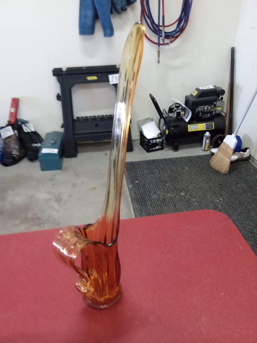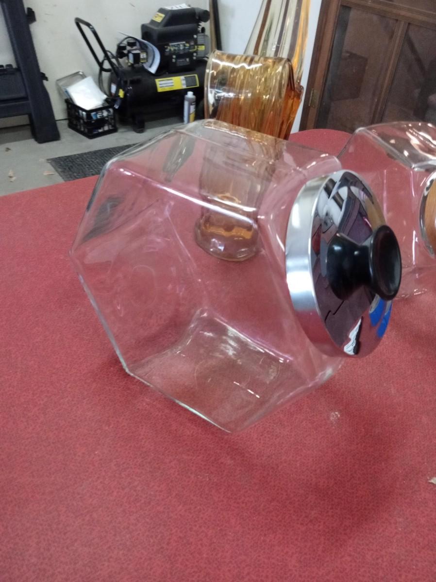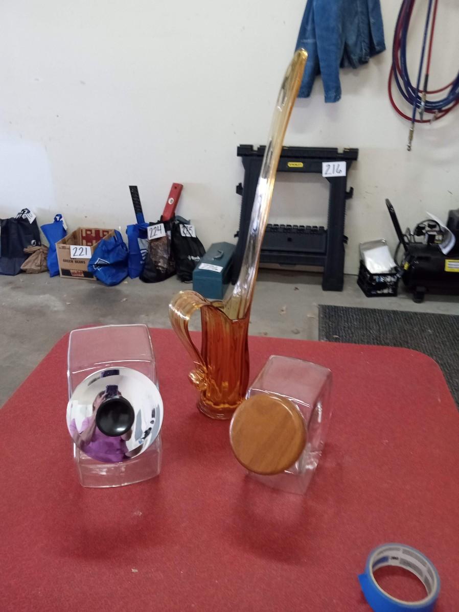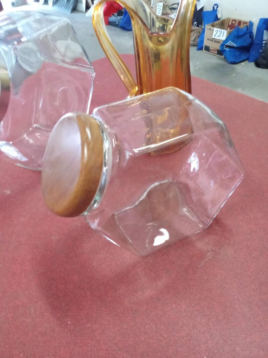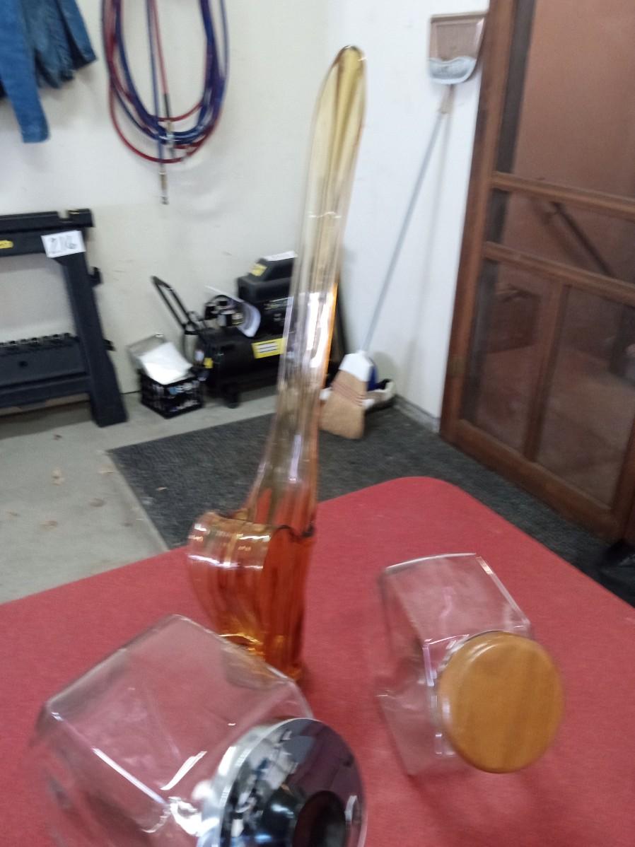 UNIQUE GLASS STRETCHED VASE AND 2 GLASS CANISTERS