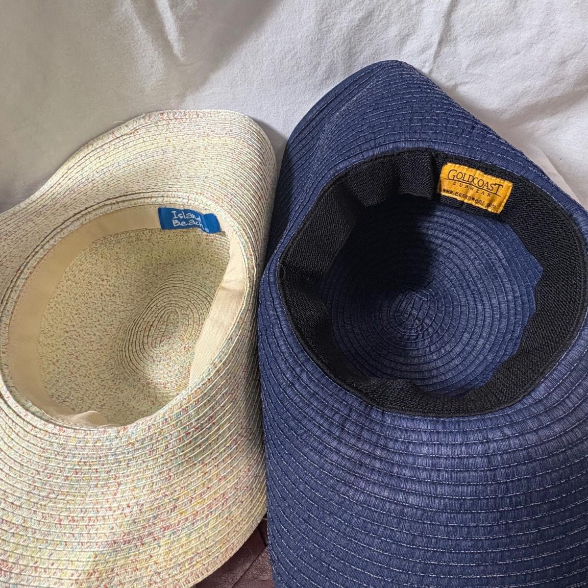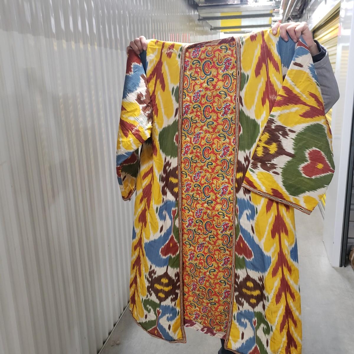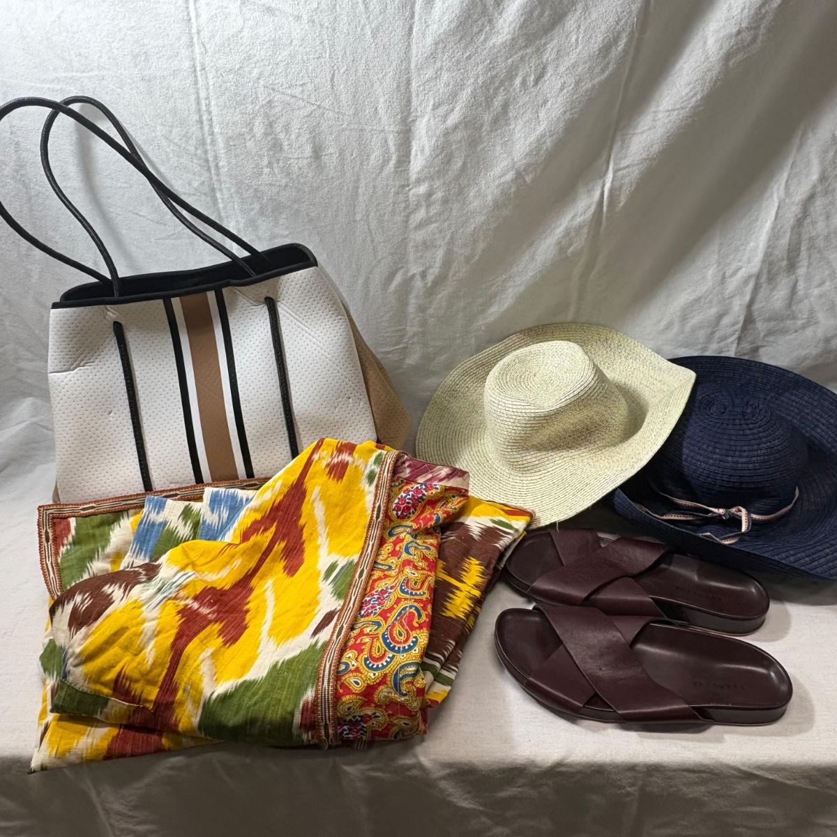 Fabulous Ikat and paisley robe with side darts, side hem slits, and woven trim. No size, (front bust measures approx. 22.5," worn open. Back neck to hem is 47”). Kimono styling; fabric appears to be cotton. Two woven beach hats (8" circumference of the hat, 18" from brim to brim) expandable vinyl tote, and Everlane size 9 slip-ons that appear to be leather, made in Italy.
